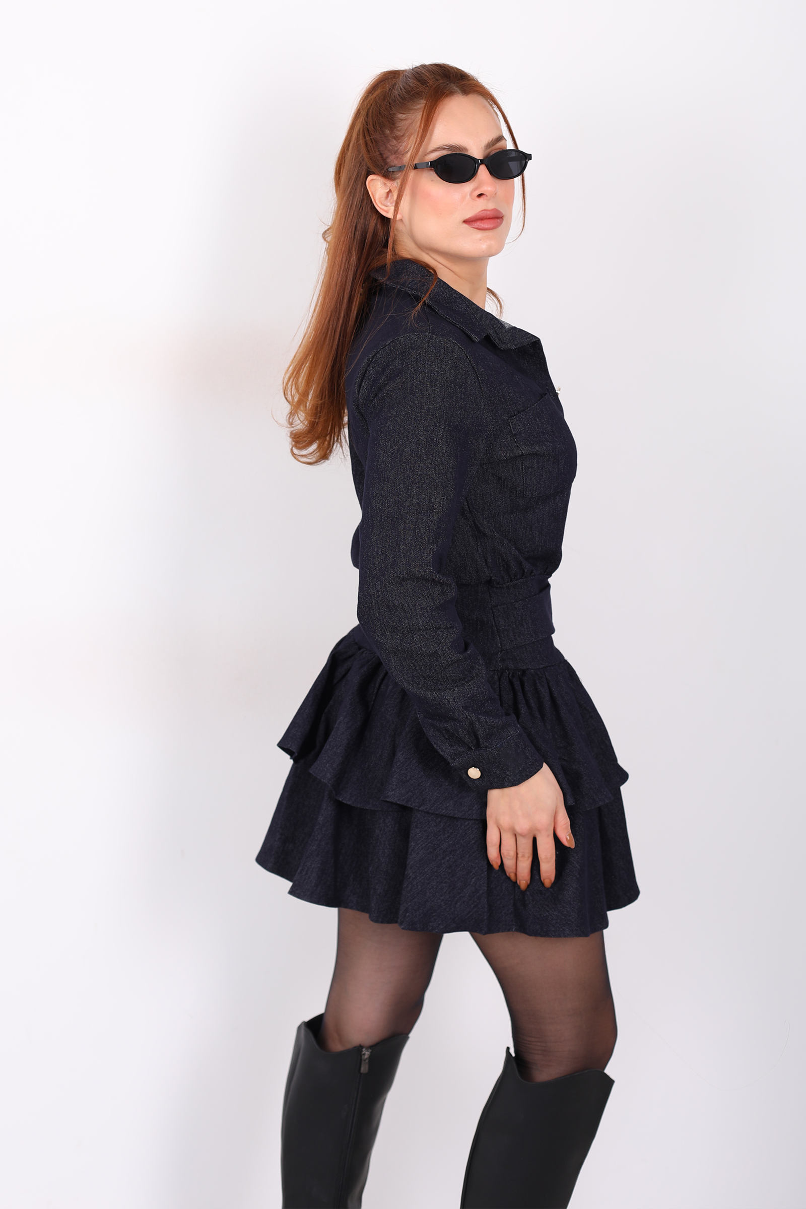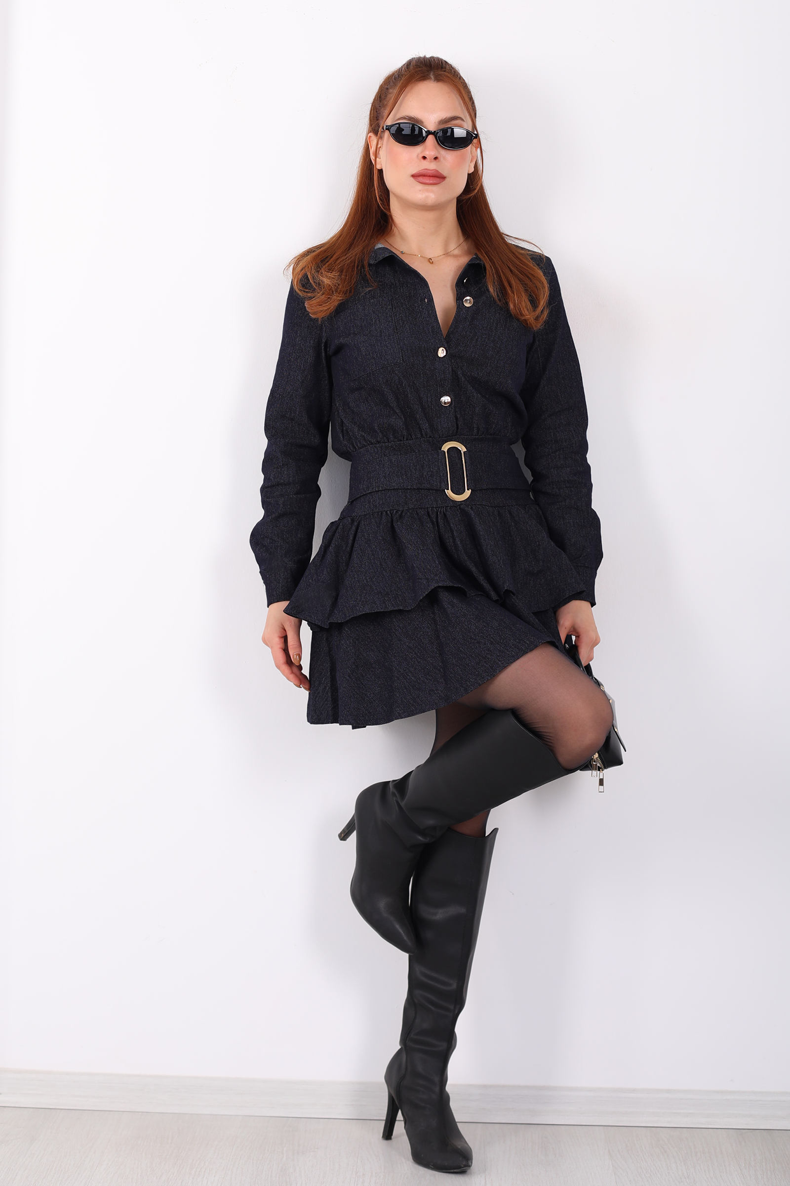 Kemer Detaylı Denim Fırfırlı Lacivert Kadın Mini Elbise