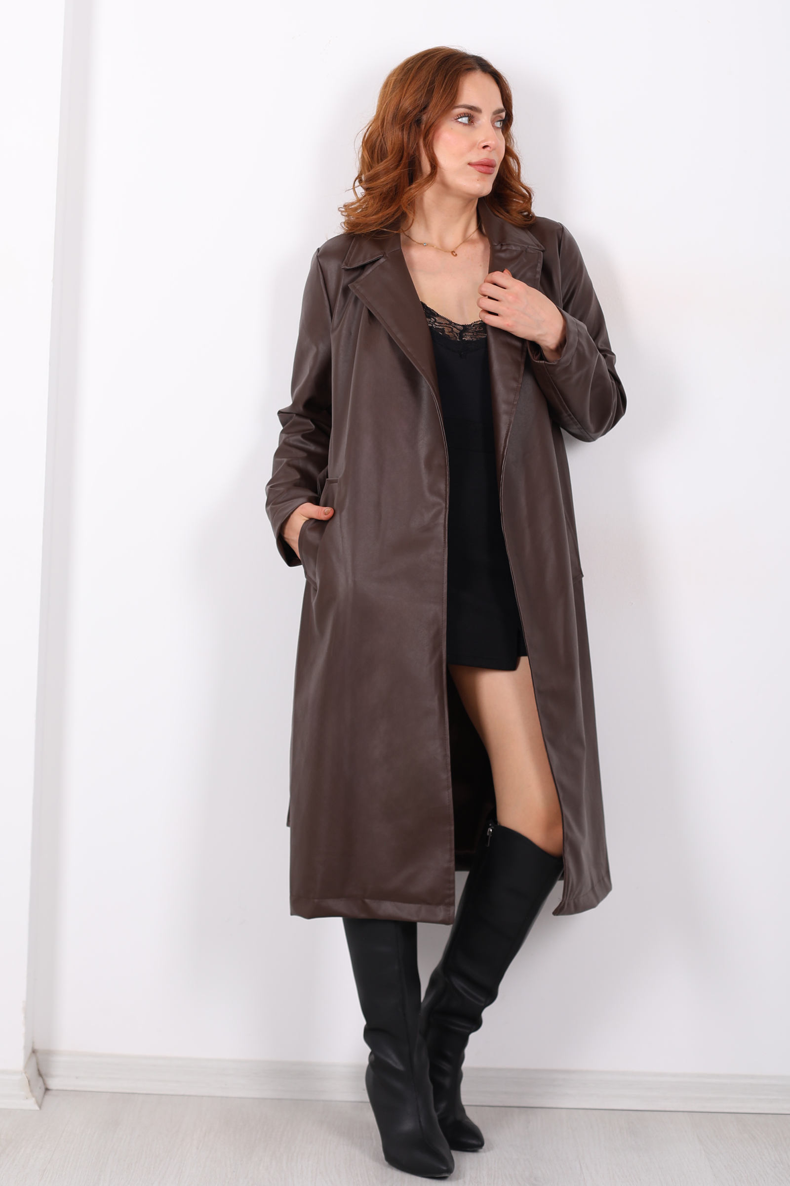 Kemerli Cep Detaylı Acı Kahve Kadın Deri Trençkot