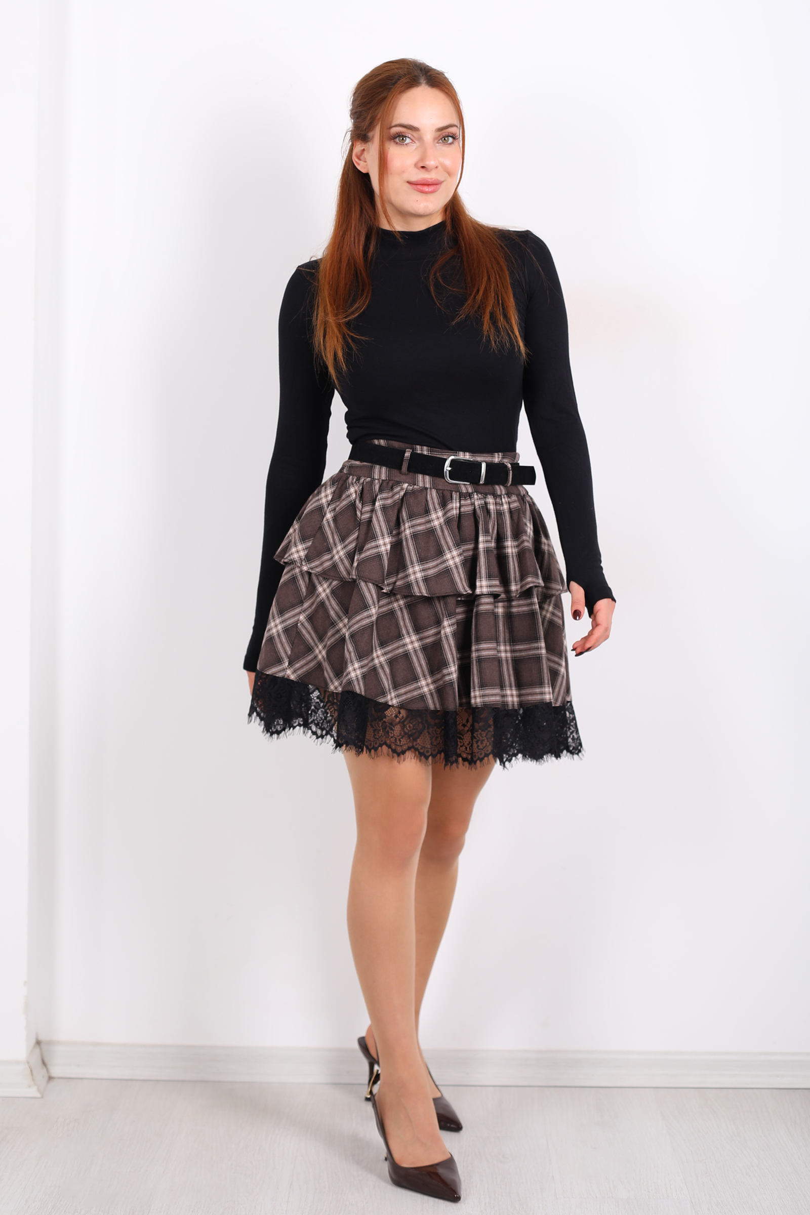Kemerli Dantel Detaylı Ekose Kahverengi Kadın Mini Etek
