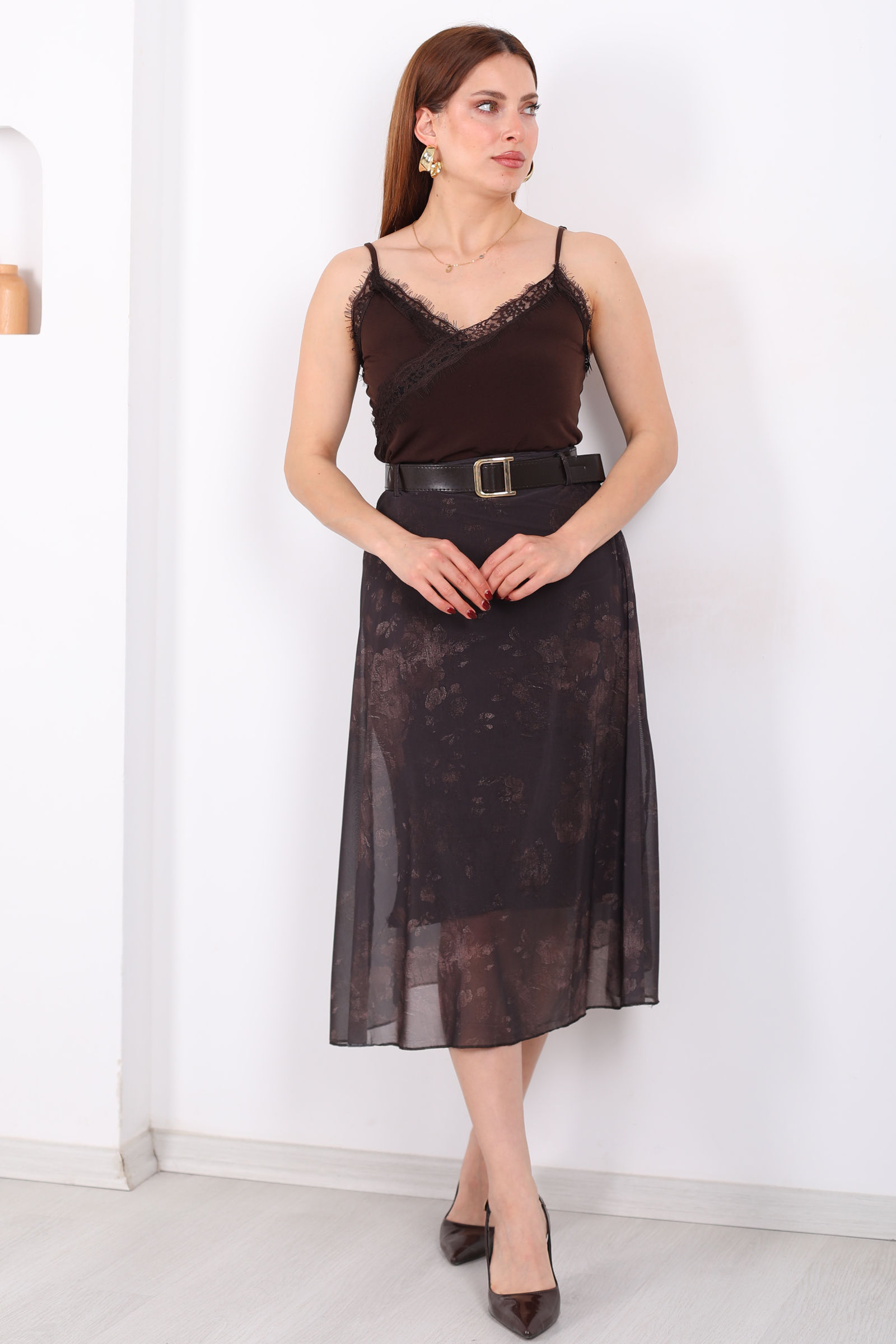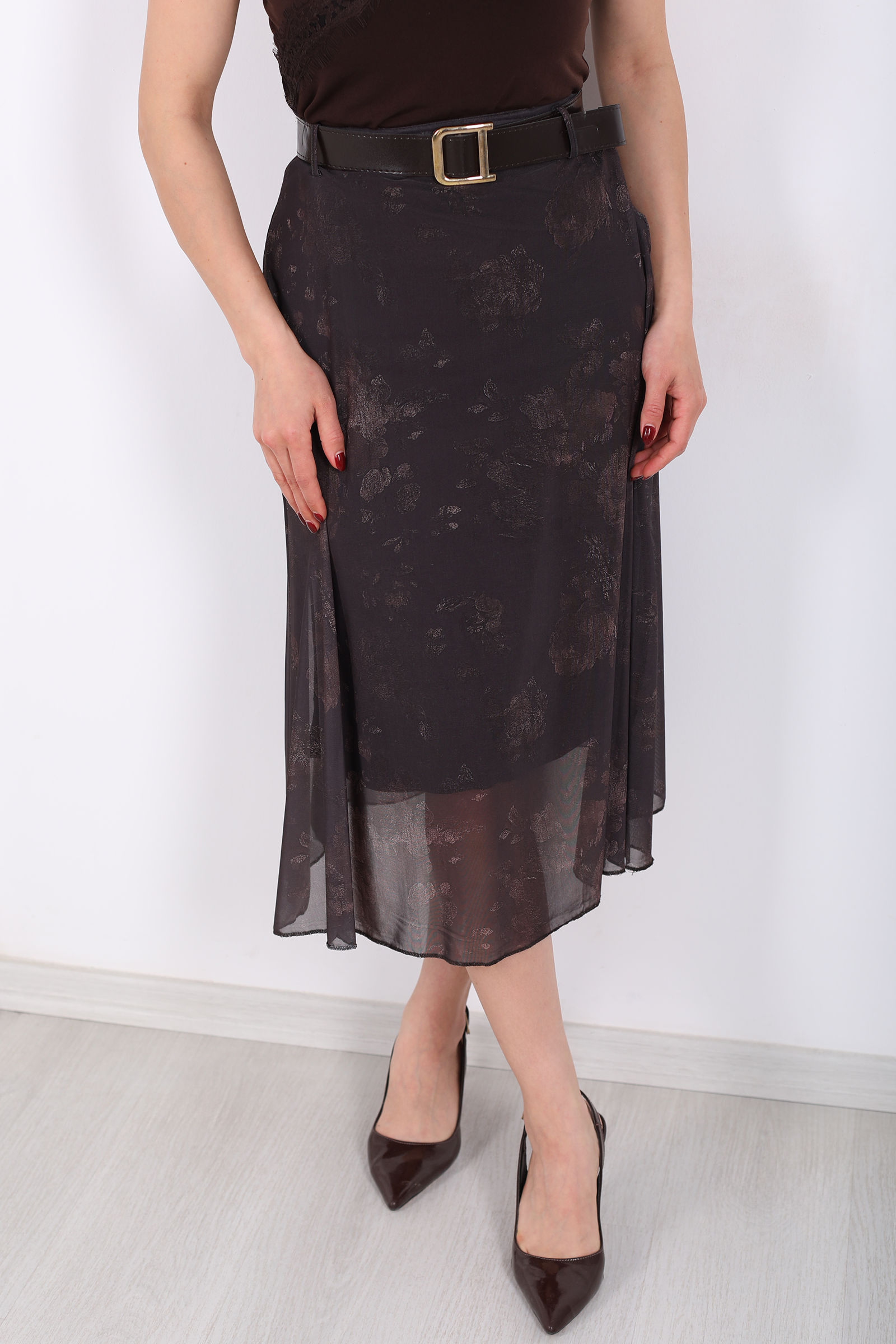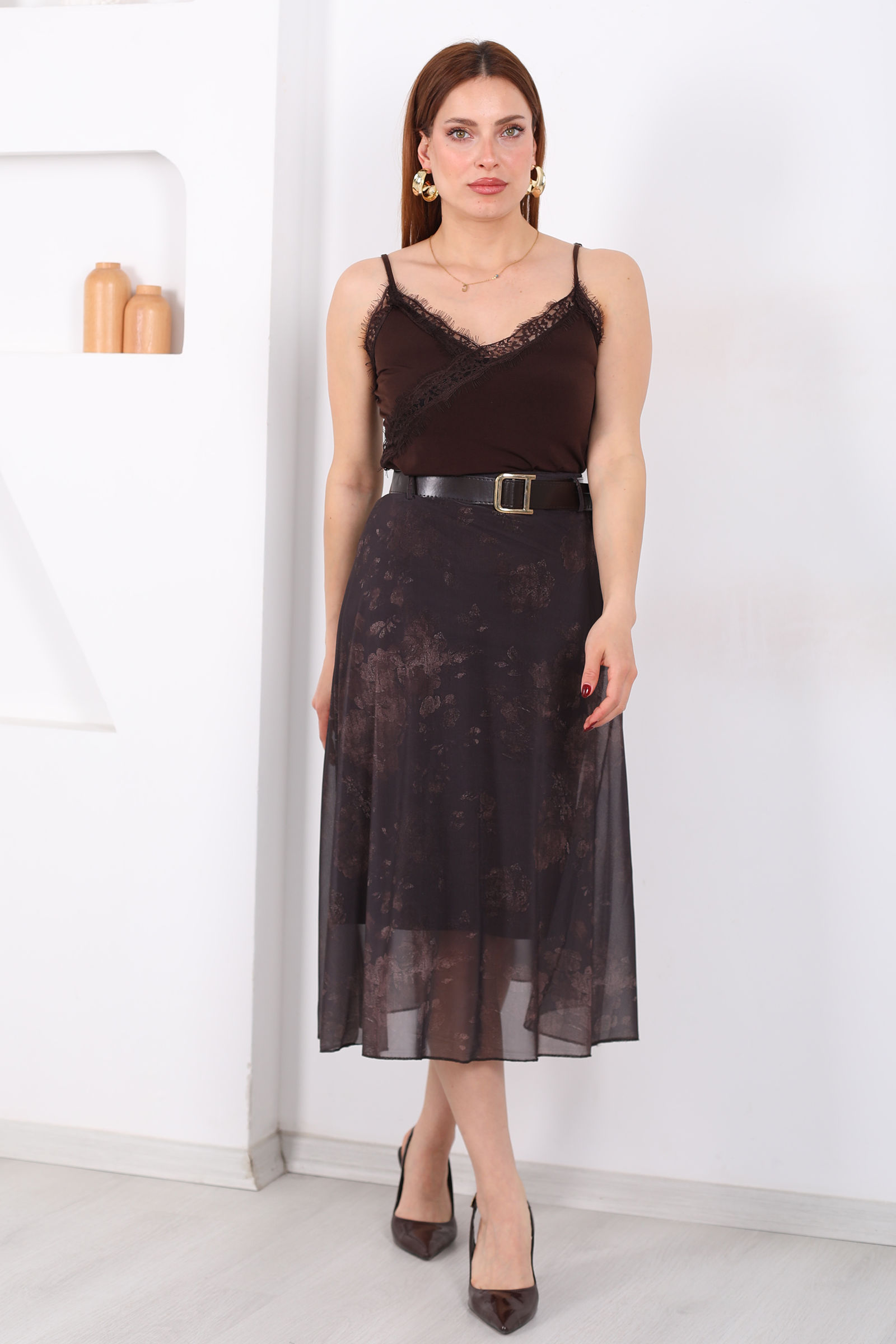 Hareketli dokusu ve zarif siluetiyle öne çıkan kemerli desenli midi kahverengi kadın tül etek, feminen stilin modern yorumunu sunuyor. Akışkan tül katmanları yürüdükçe hafif bir hareket kazandırırken, kahverengi tonların doğal sıcaklığı kombinlere sofistike bir hava ekler. Desenli yapısı eteğe derinlik katarken bel kısmındaki kemer detayı vücut formunu dengeli şekilde ön plana çıkarır.