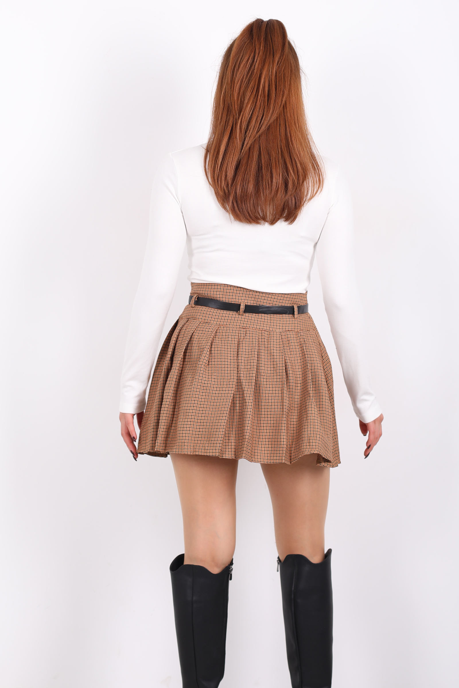 Pileli kesimi, kumaşı hafif dalgalarla hareketlendiren bir ritim yakalar; adımlarınızda sanki etekle birlikte bir melodi çalıyor gibi hafif bir akış hissi ortaya çıkarır. Beldeki kemer detayı, tasarıma sadece fonksiyonellik değil kişisel bir tavır da ekler. Kemerin deliğinden geçen toka, eteğe ritmik bir vurgu getirir ve stilinizi basit bir parçanın ötesine taşır.