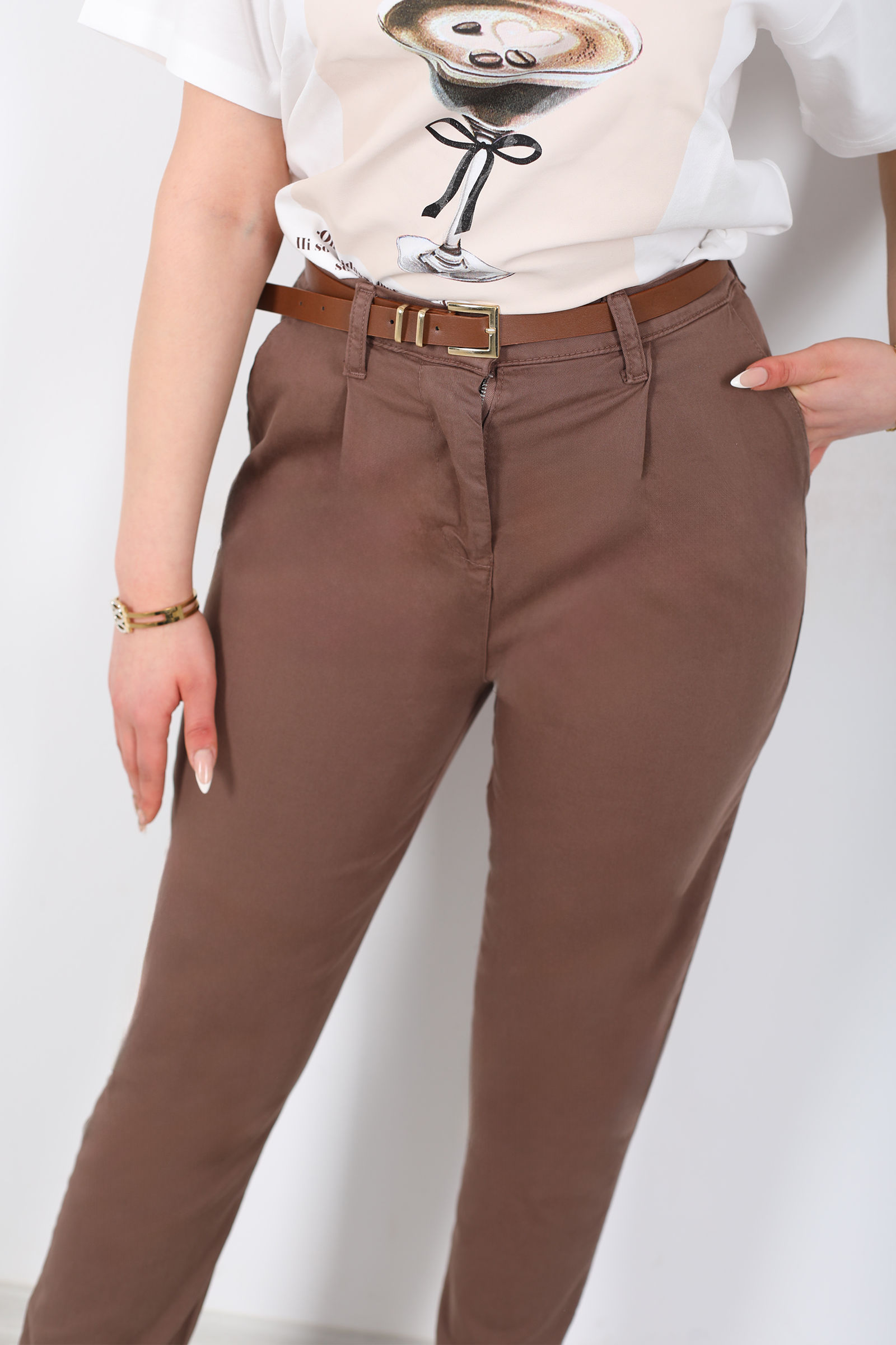 Kemerli Gabardin Likralı Kadın Kahverengi Havuç Pantolon