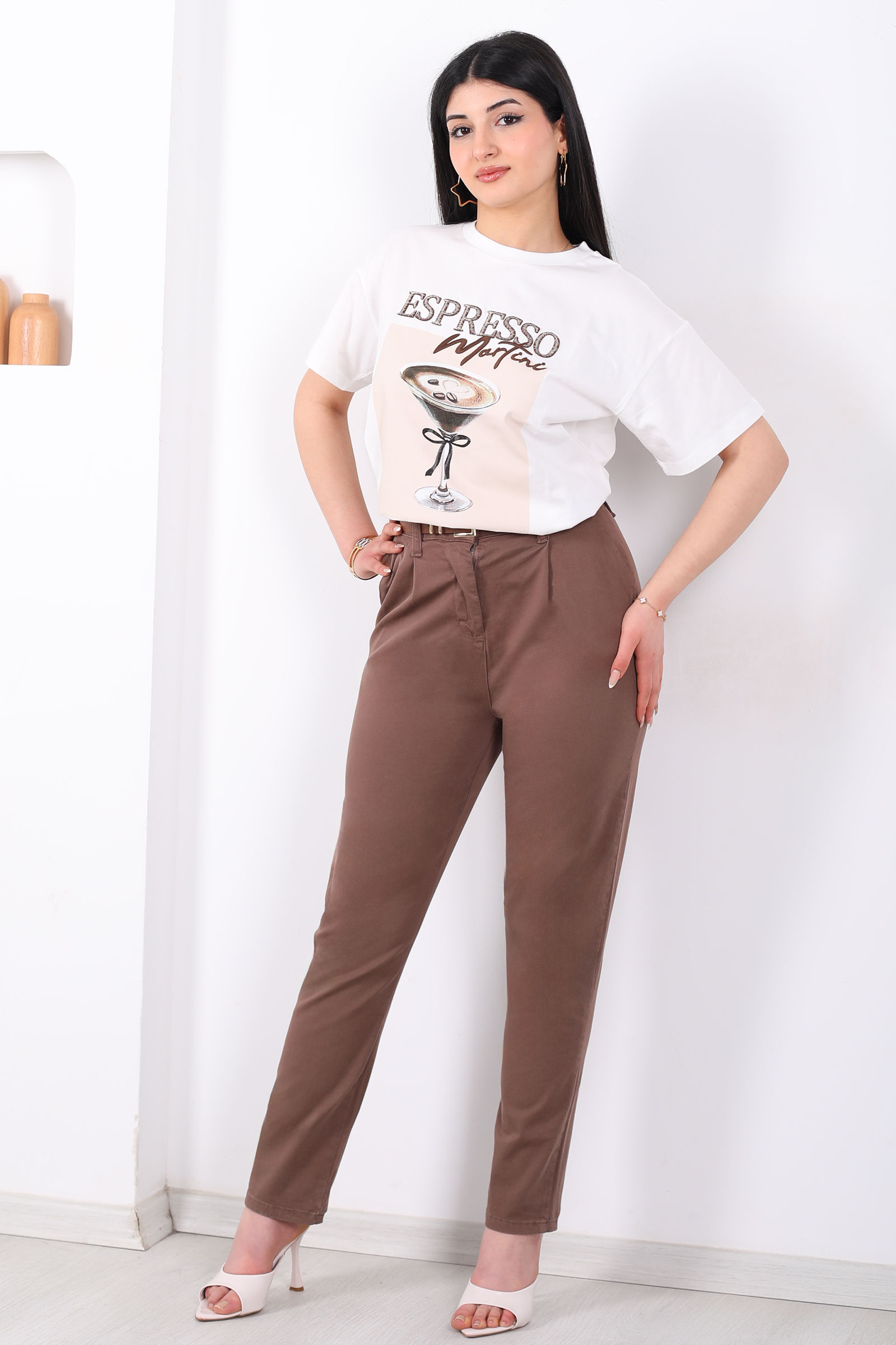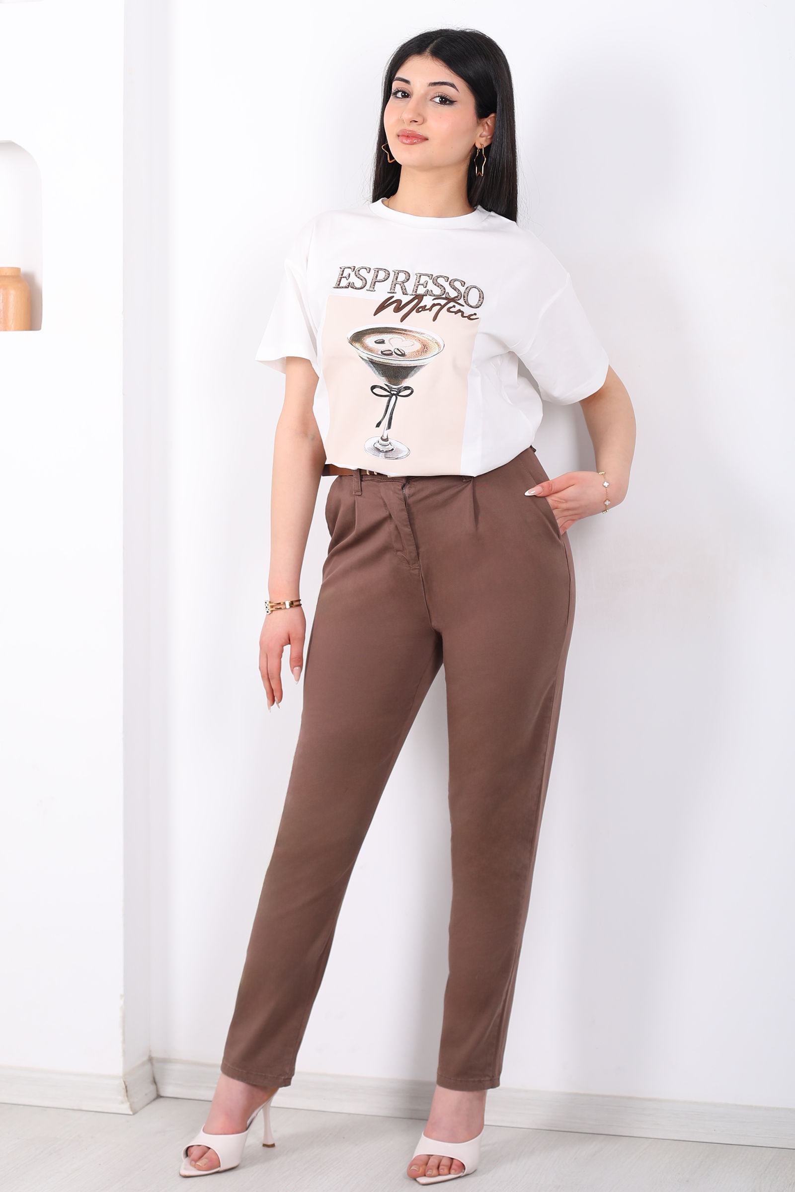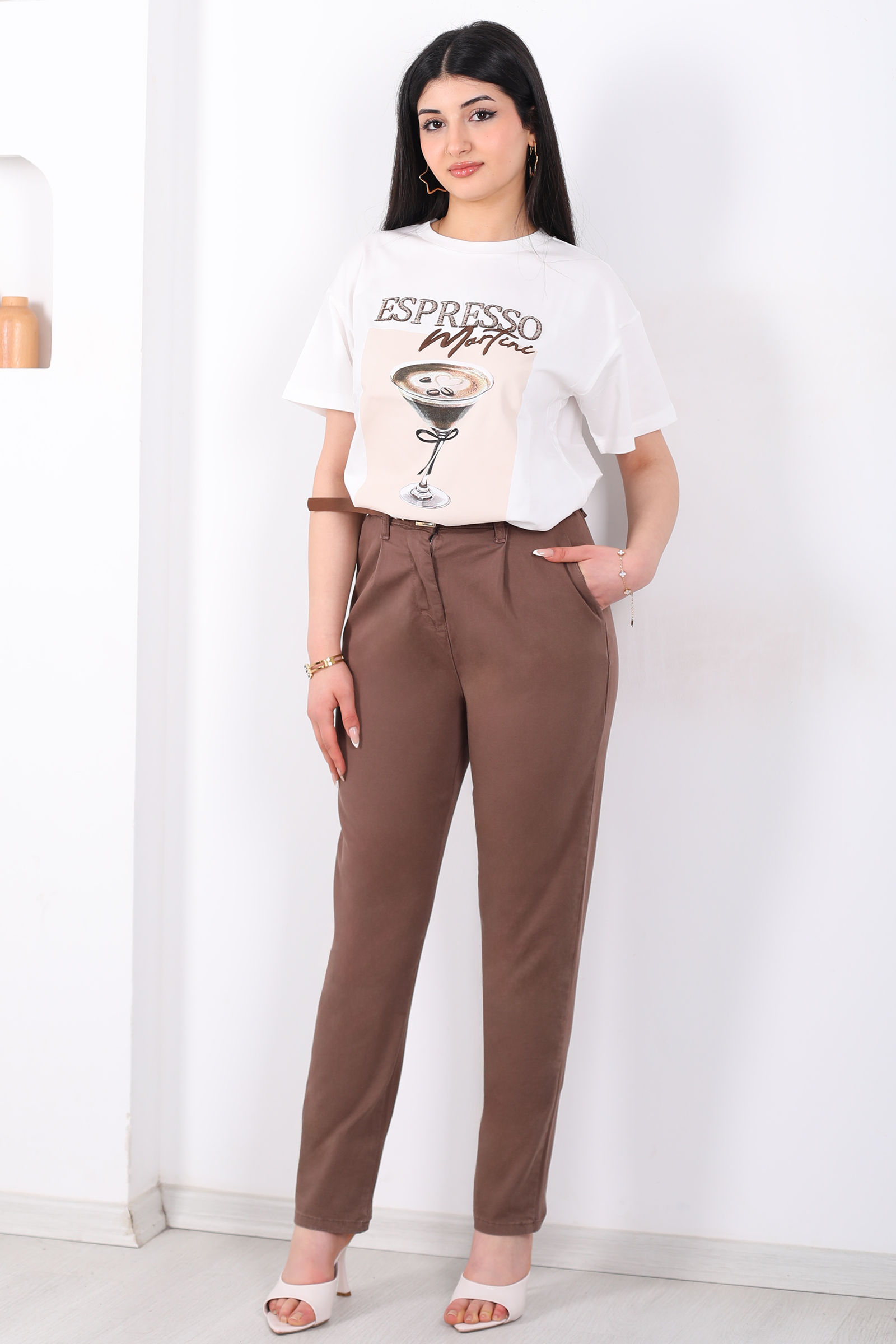 Beli Lastikli Yüksek Bel Acı Kahve Kadın Modal Pantolon