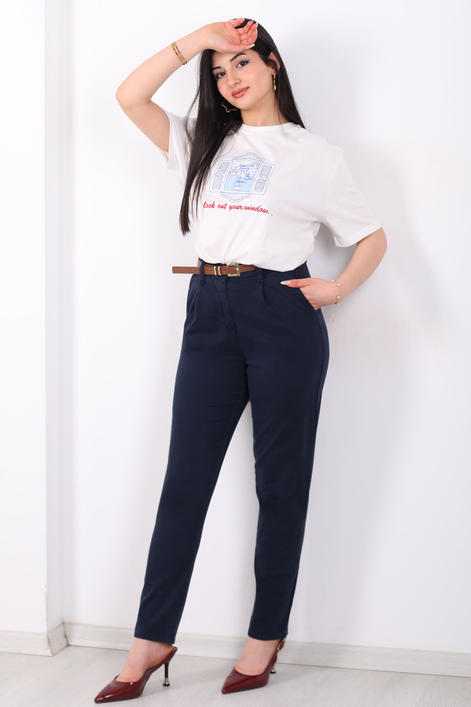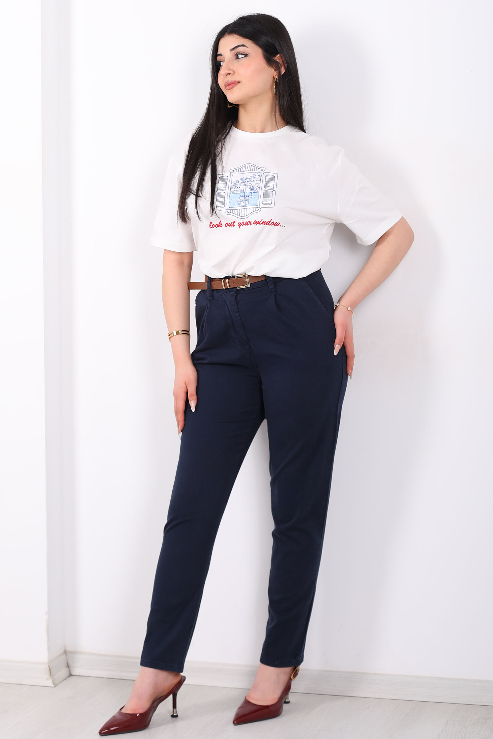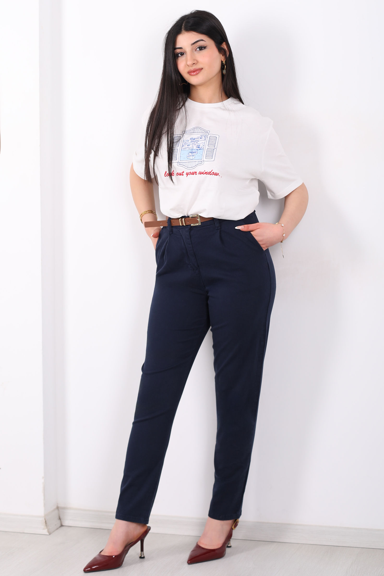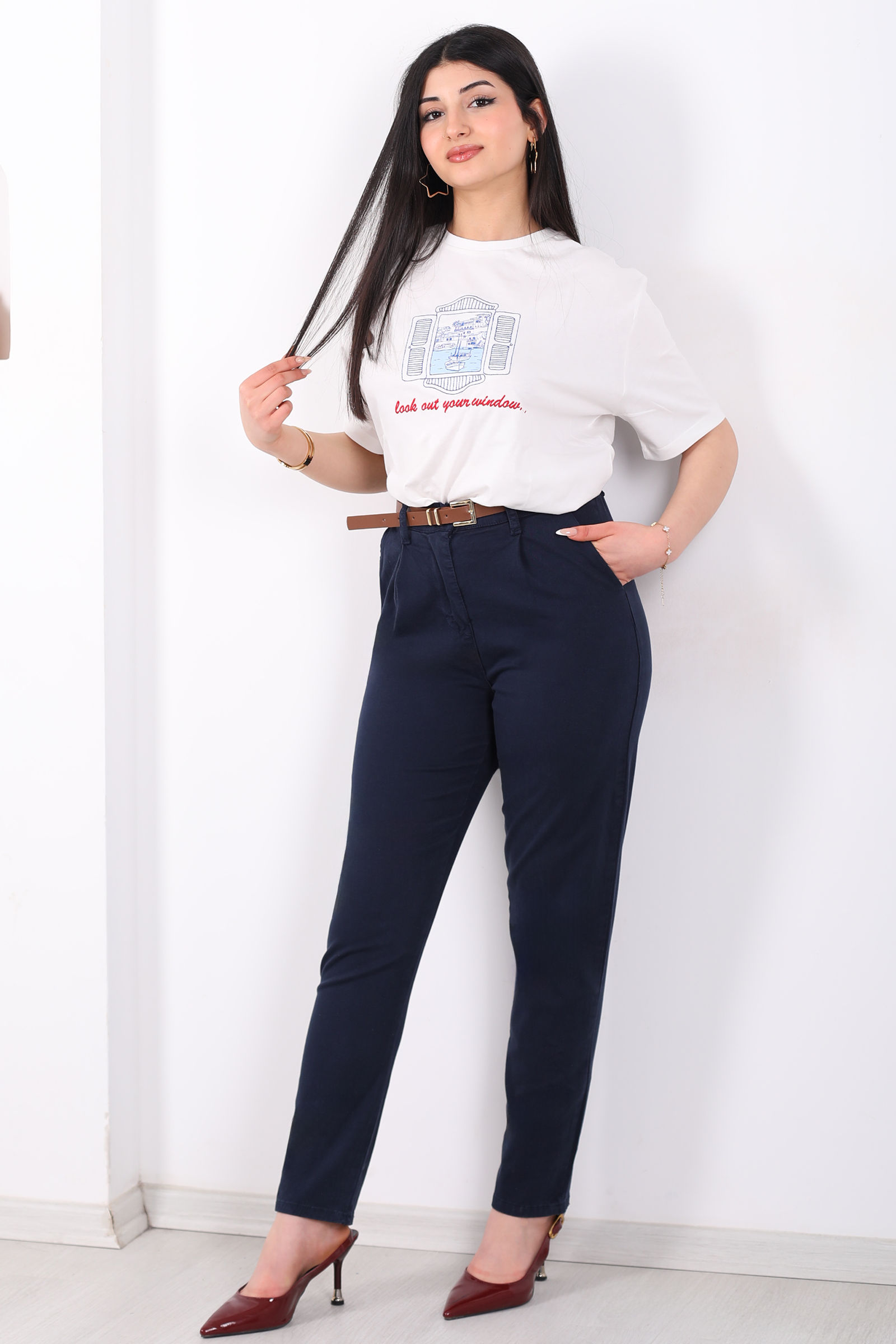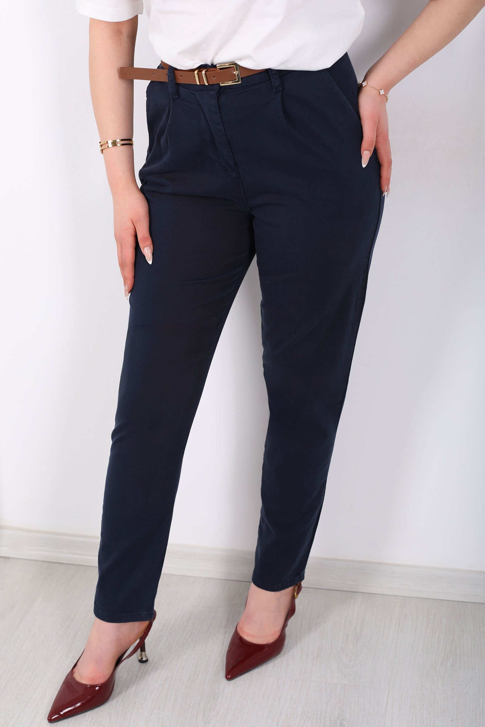 Kemerli Gabardin Likralı Kadın Lacivert Havuç Pantolon
