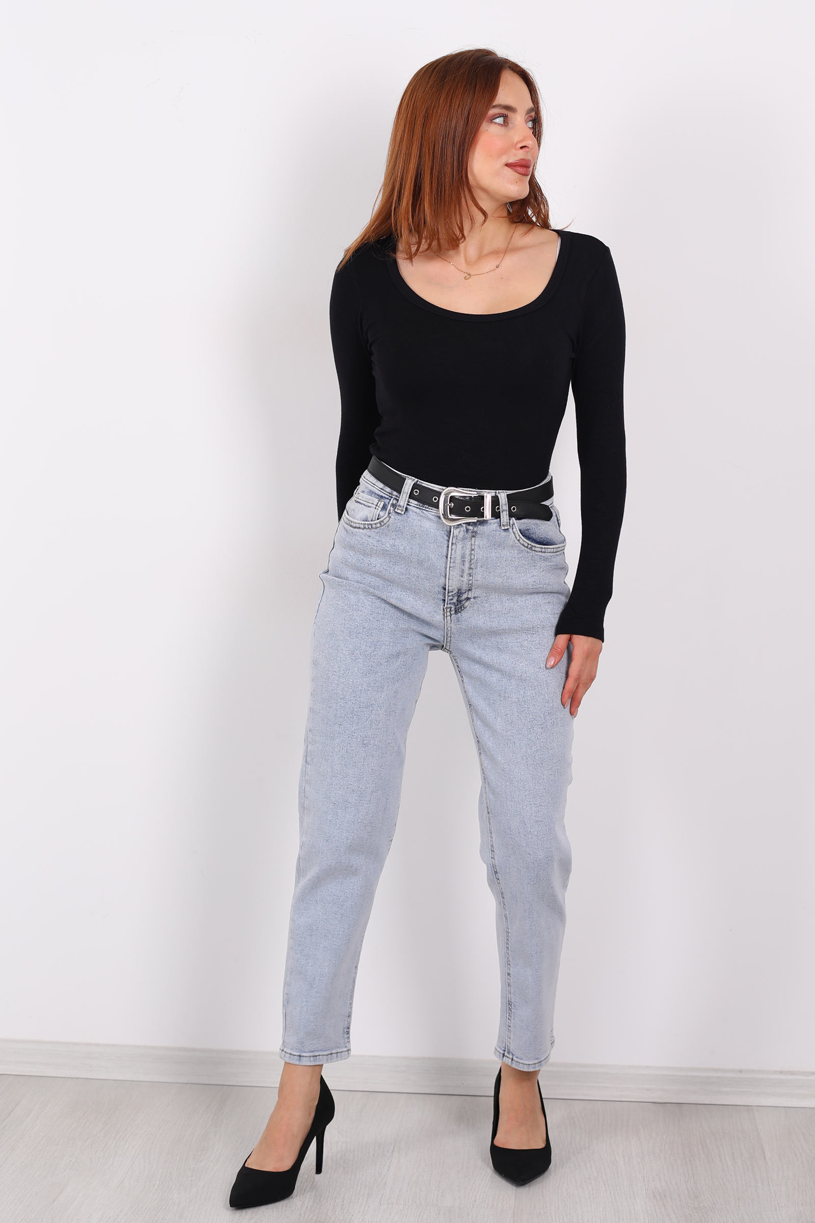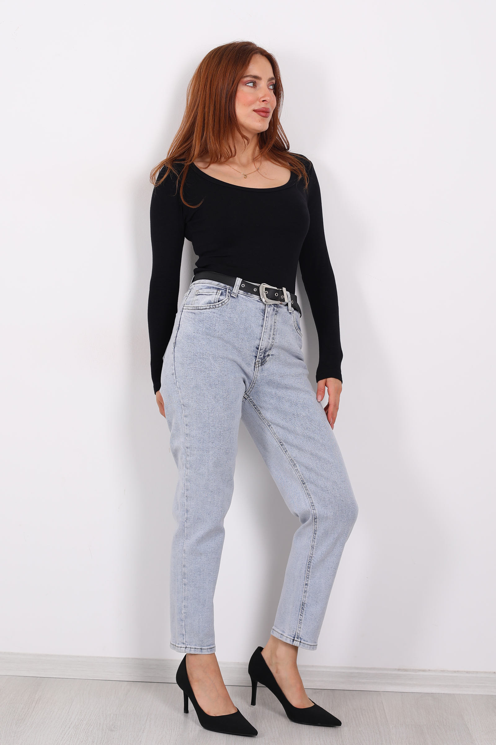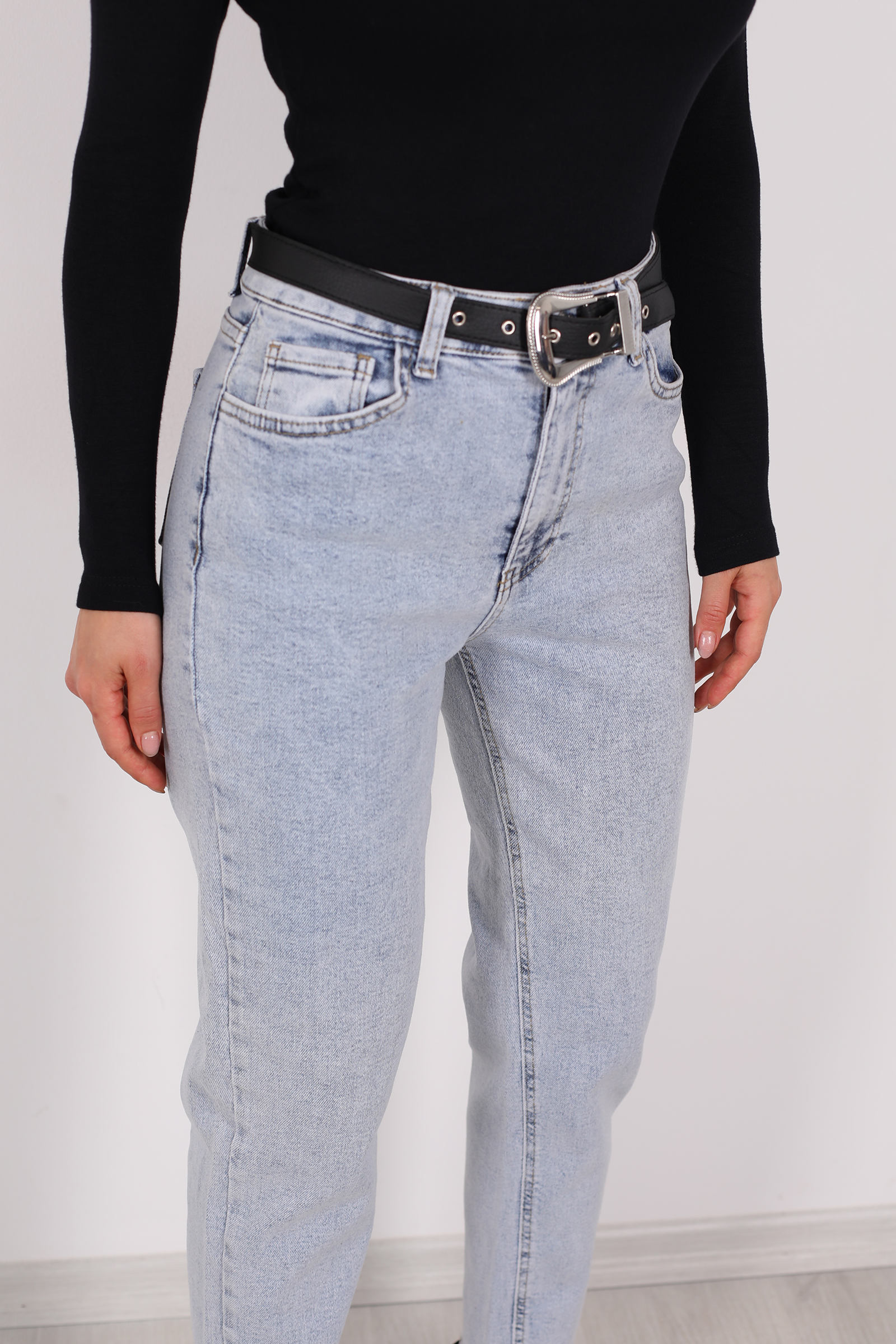 Mom pantolon, kar yıkama efektiyle denim kumaşa “yıpranmış ama zarif” bir görünüm kazandırıyor. Kar yıkama tekniği, kumaşa doğal bir solukluk ve doku derinliği verirken aynı zamanda kotun sertliğini yumuşatır.Şifon veya saten bluz + zarif topuklu ayakkabılar + minimal takılarla şık ve feminen bir kombin oluşturun.