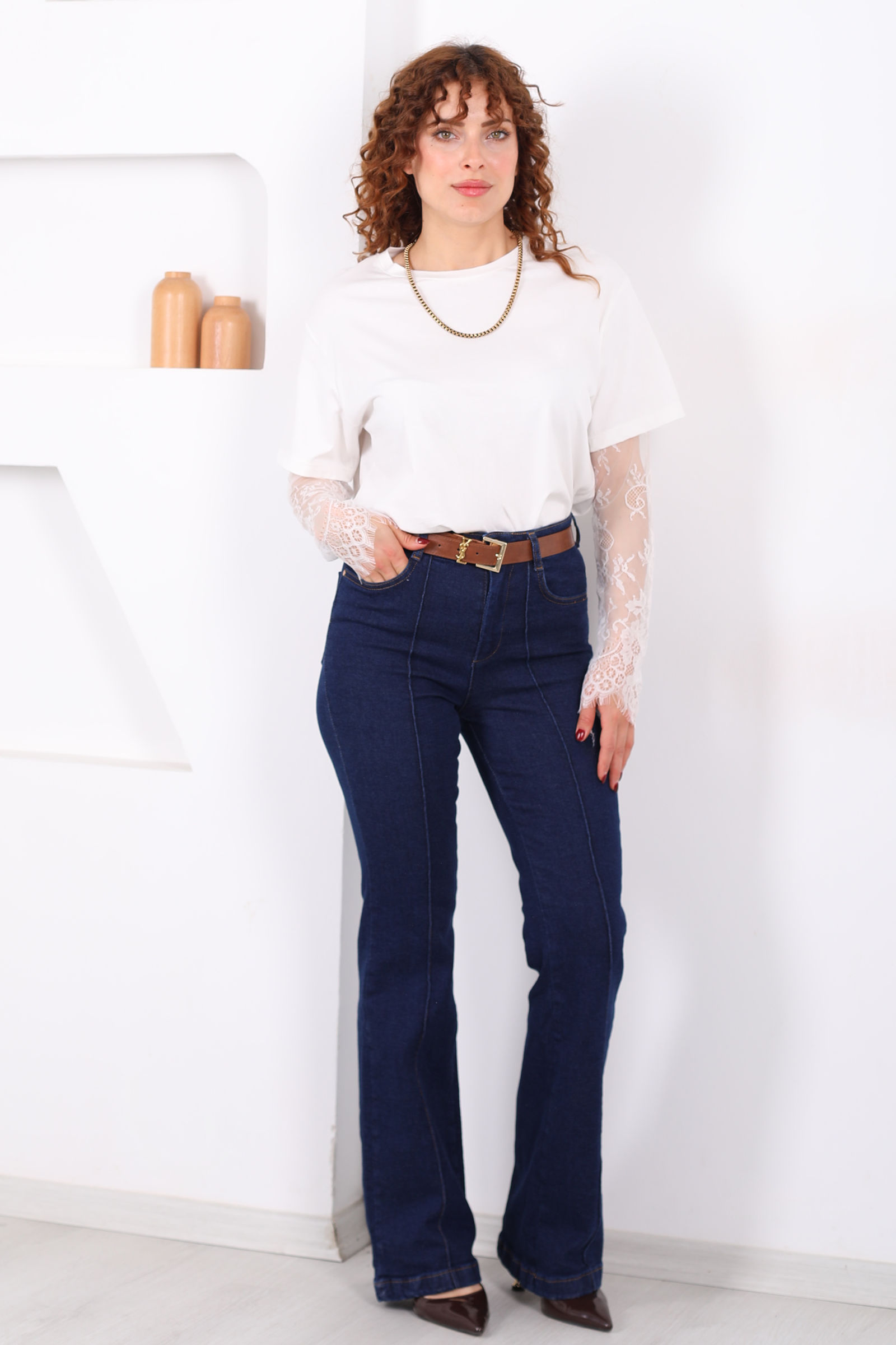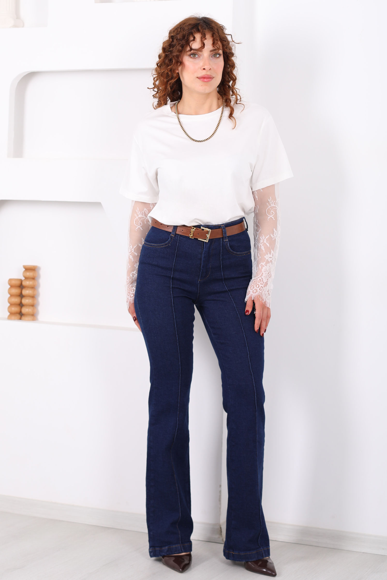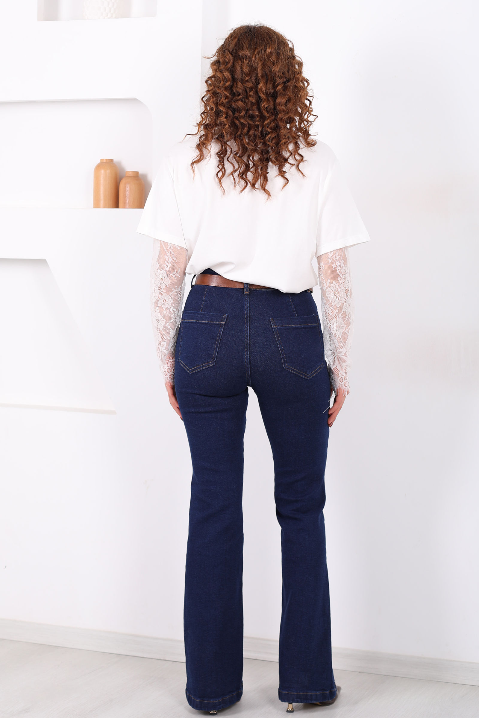 Kemerli Önü Çimalı Kadın Koyu Mavi Kar Yıkama İspanyol Paça Jean