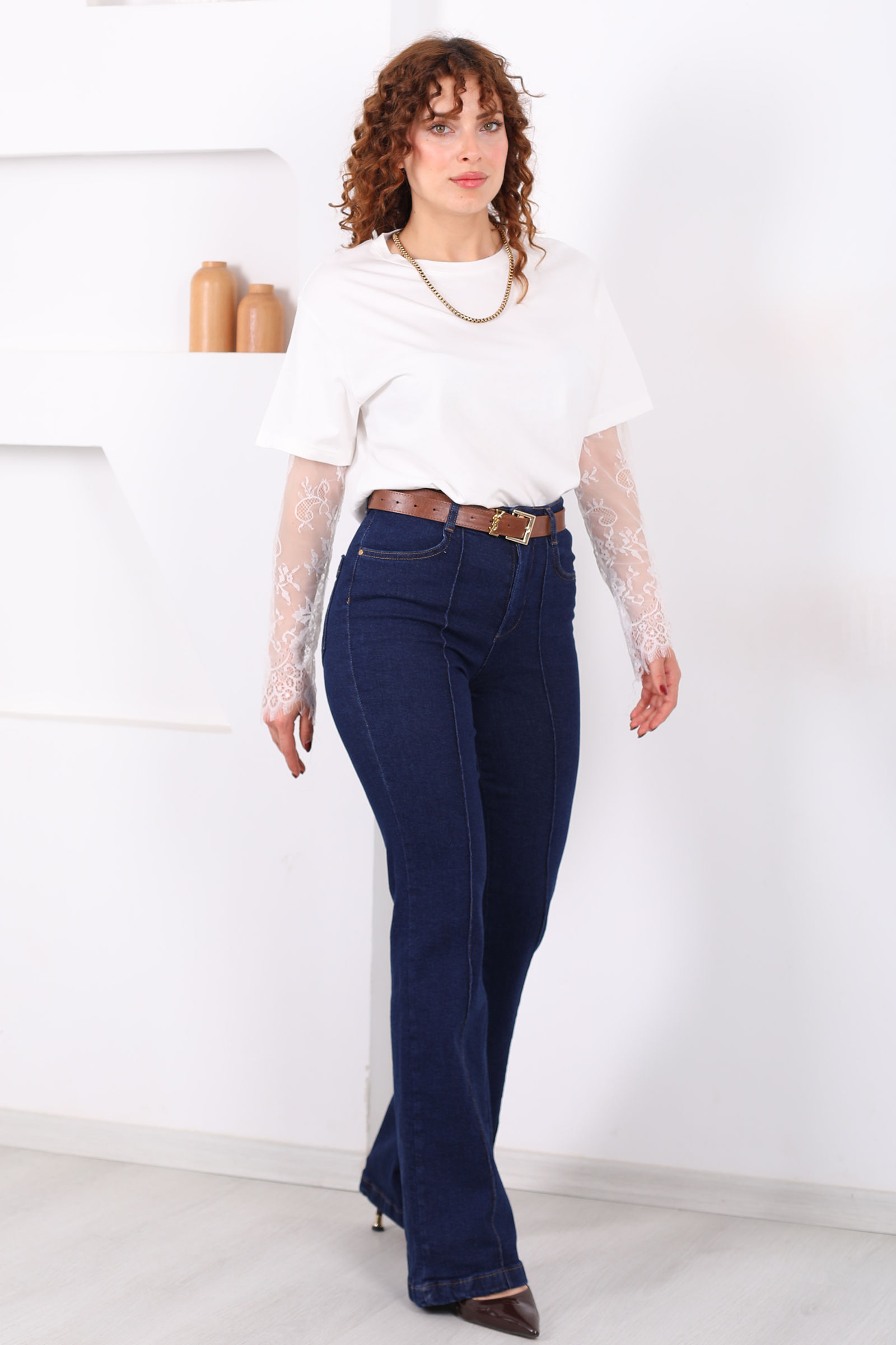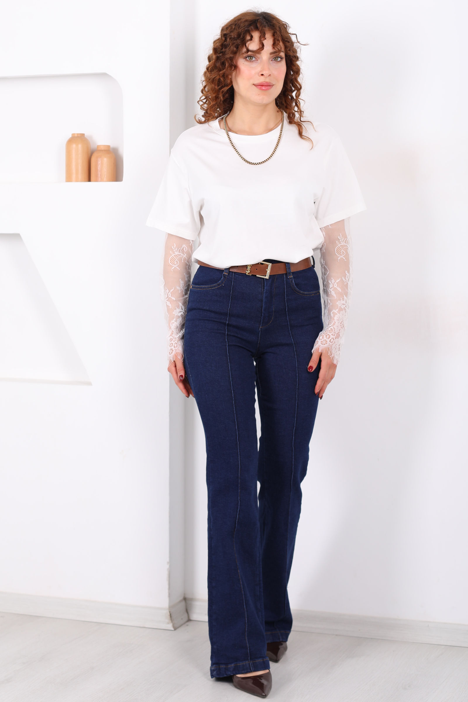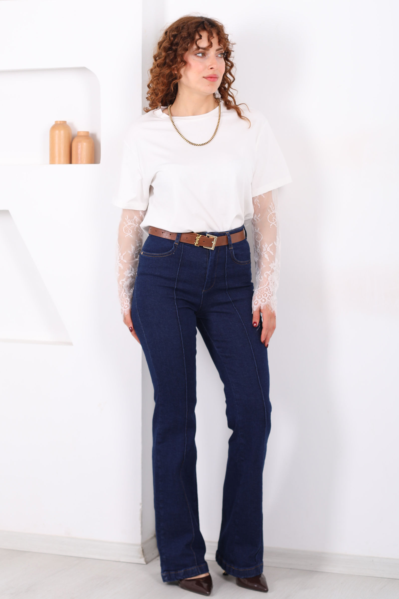 Kemerli Önü Çimalı Kadın Koyu Mavi Kar Yıkama İspanyol Paça Jean
