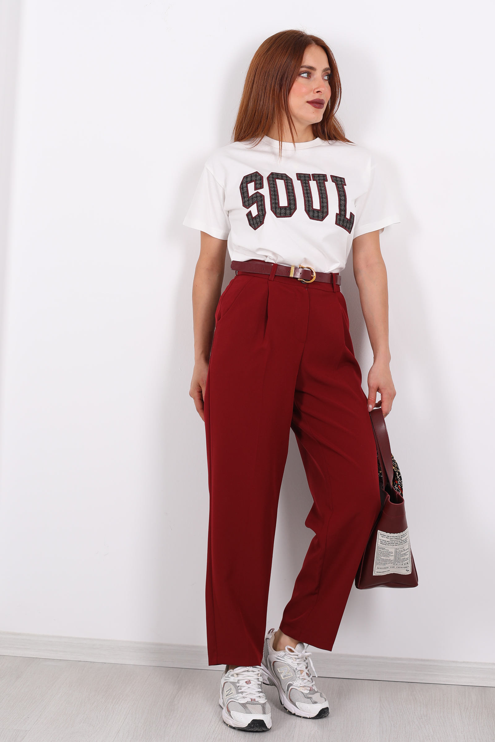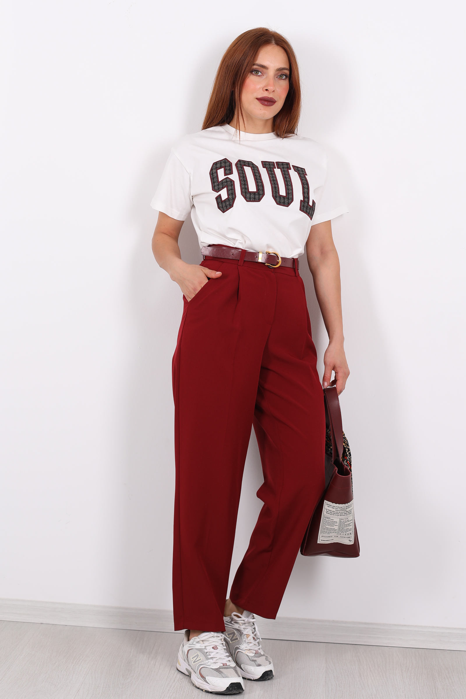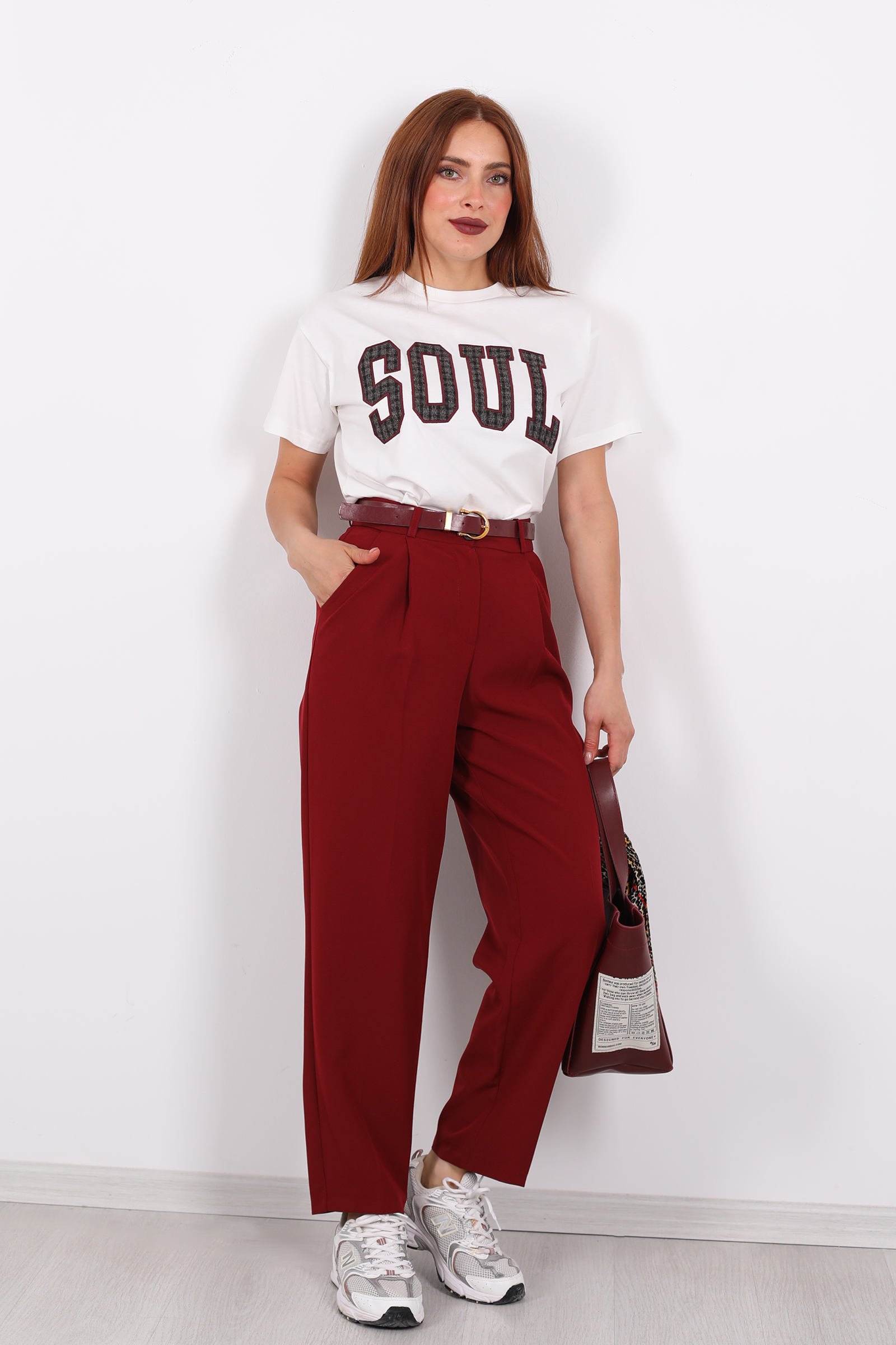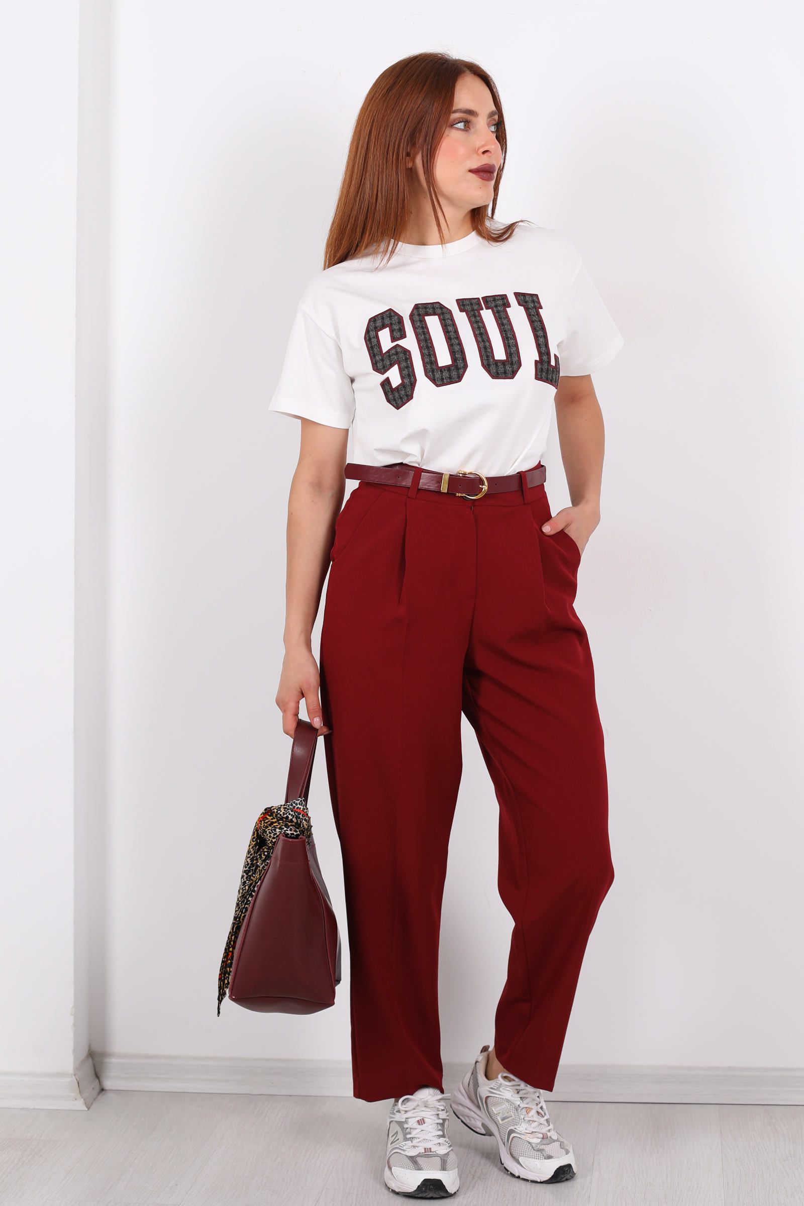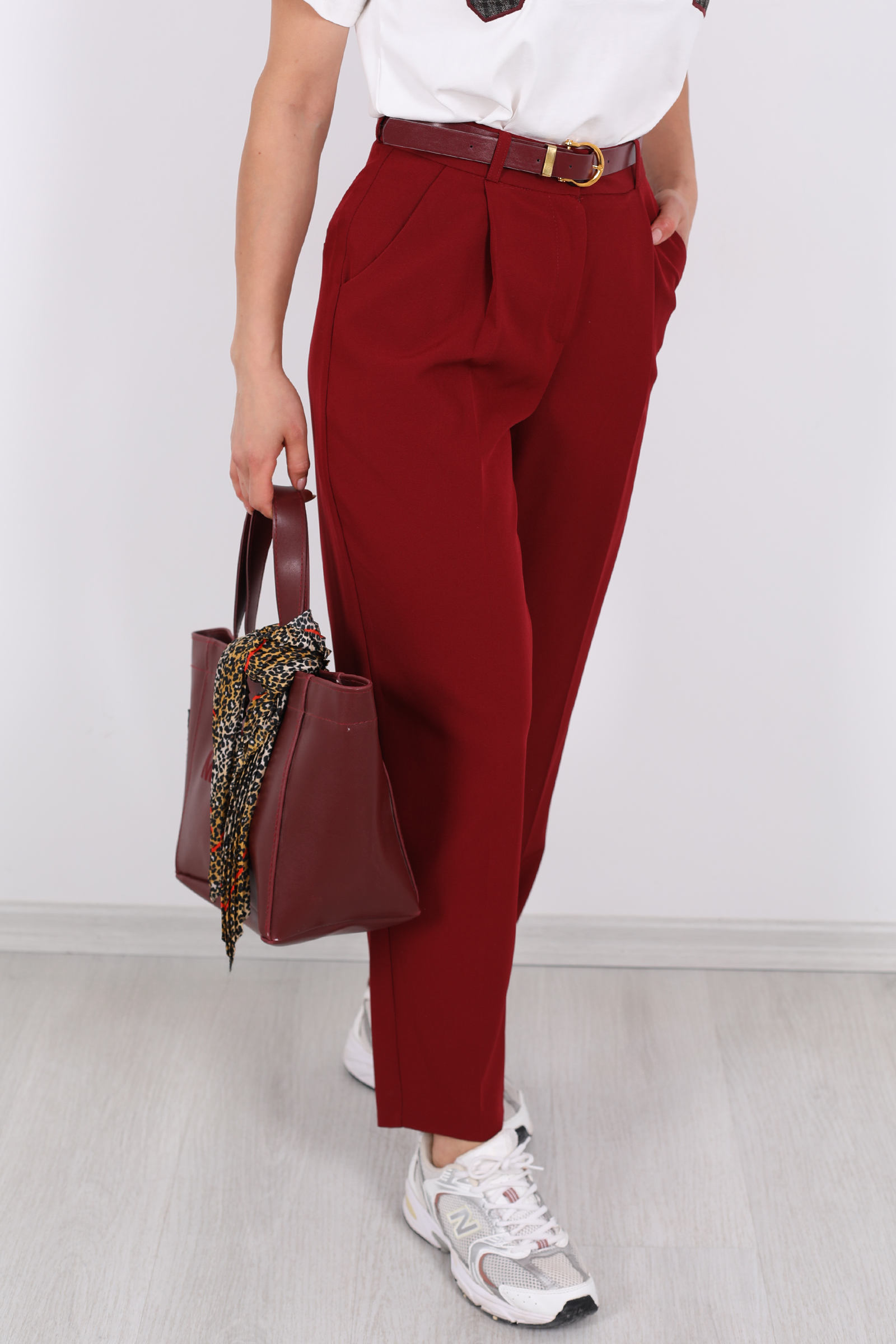 Bu bordo havuç pantolon, hem zarif hem de modern bir duruş sunan dikkat çekici bir parça. Kumaşında %87 polyester ve %13 elastan karışımı kullanılmış bu sayede hafif esneyen, cildinize nazik davranan bir yapı sunar. Polyester dokusu pantolona dayanıklılık kazandırırken, elastan esneklik sağlayarak hareket özgürlüğünüzü artırır.