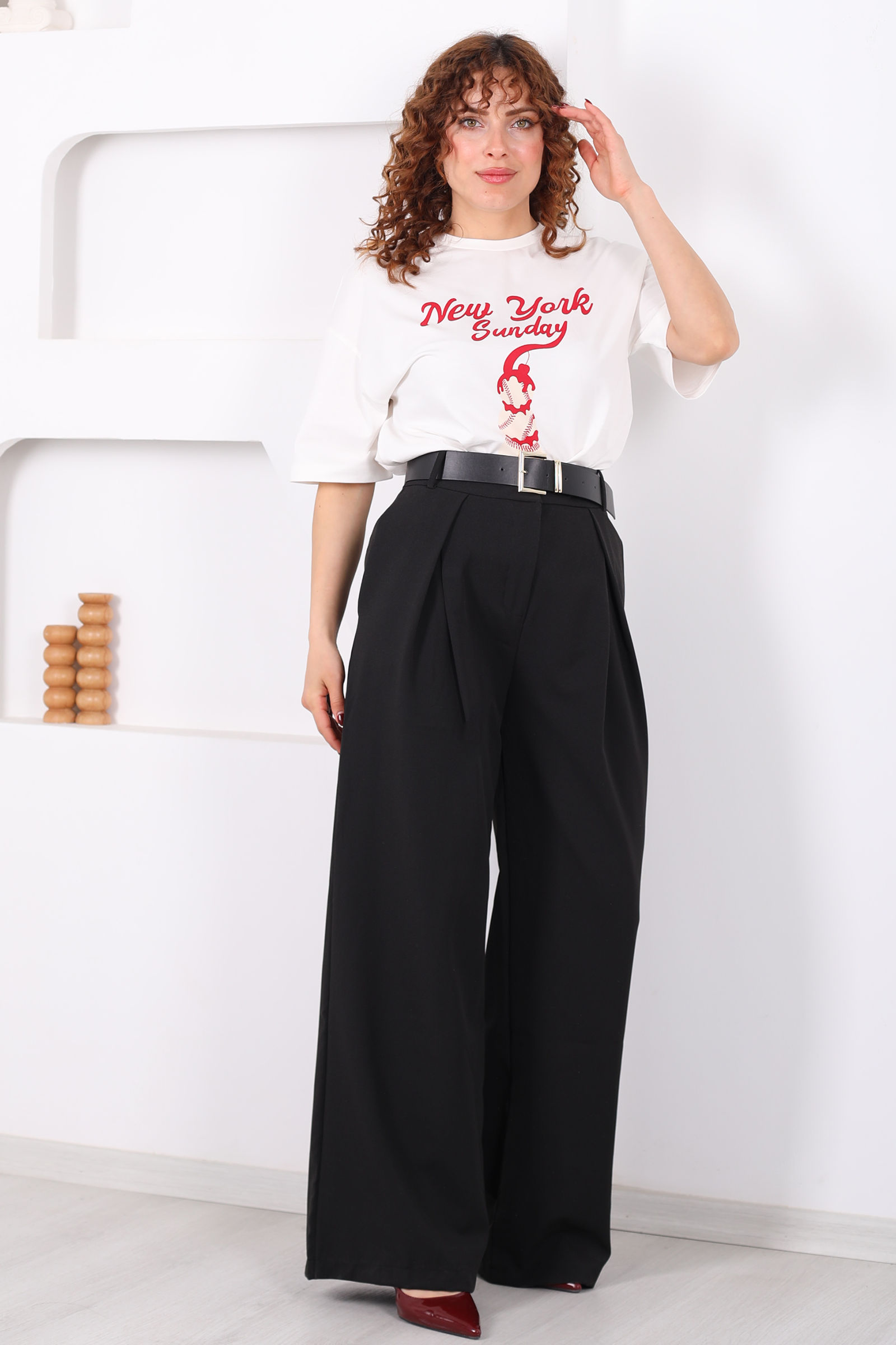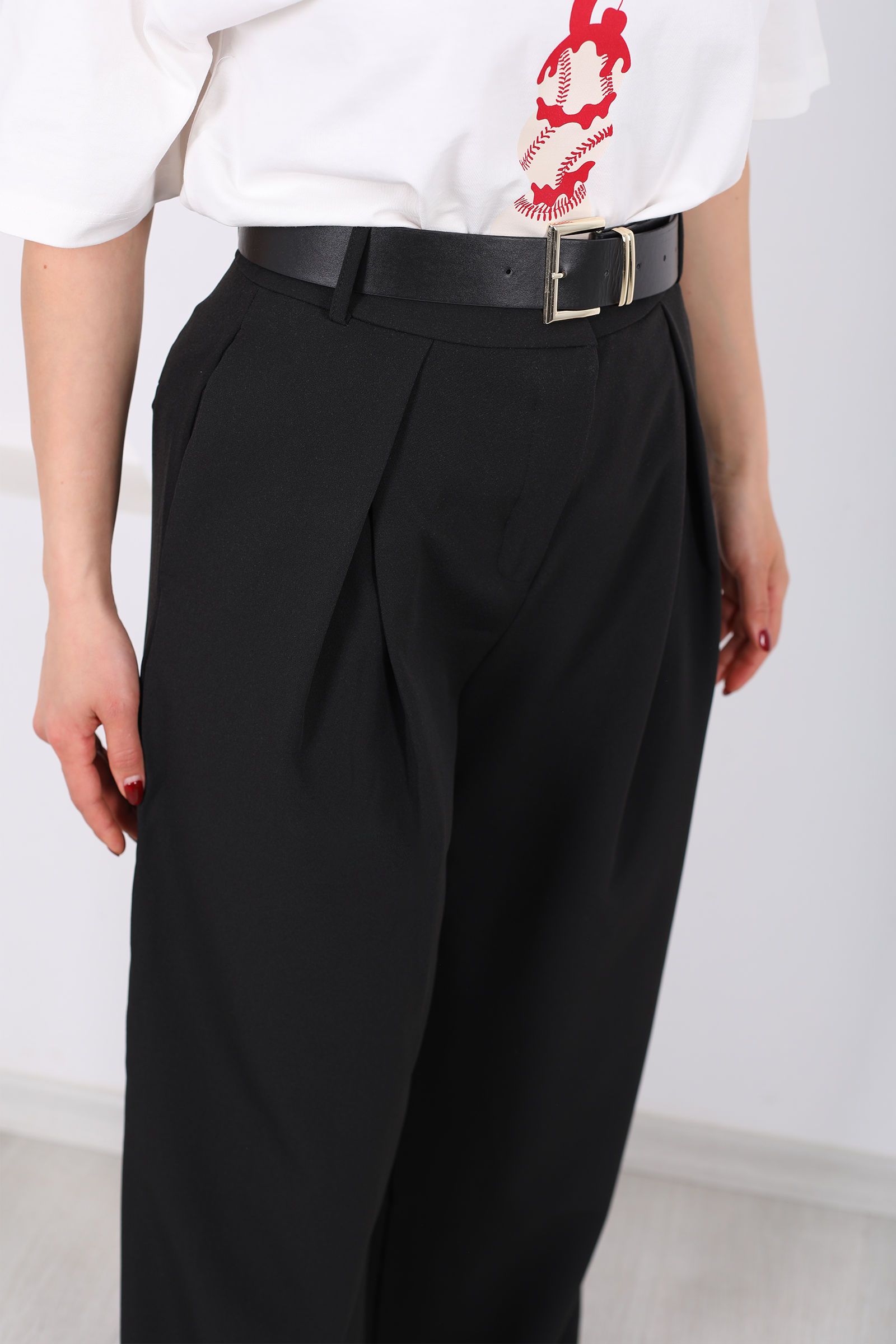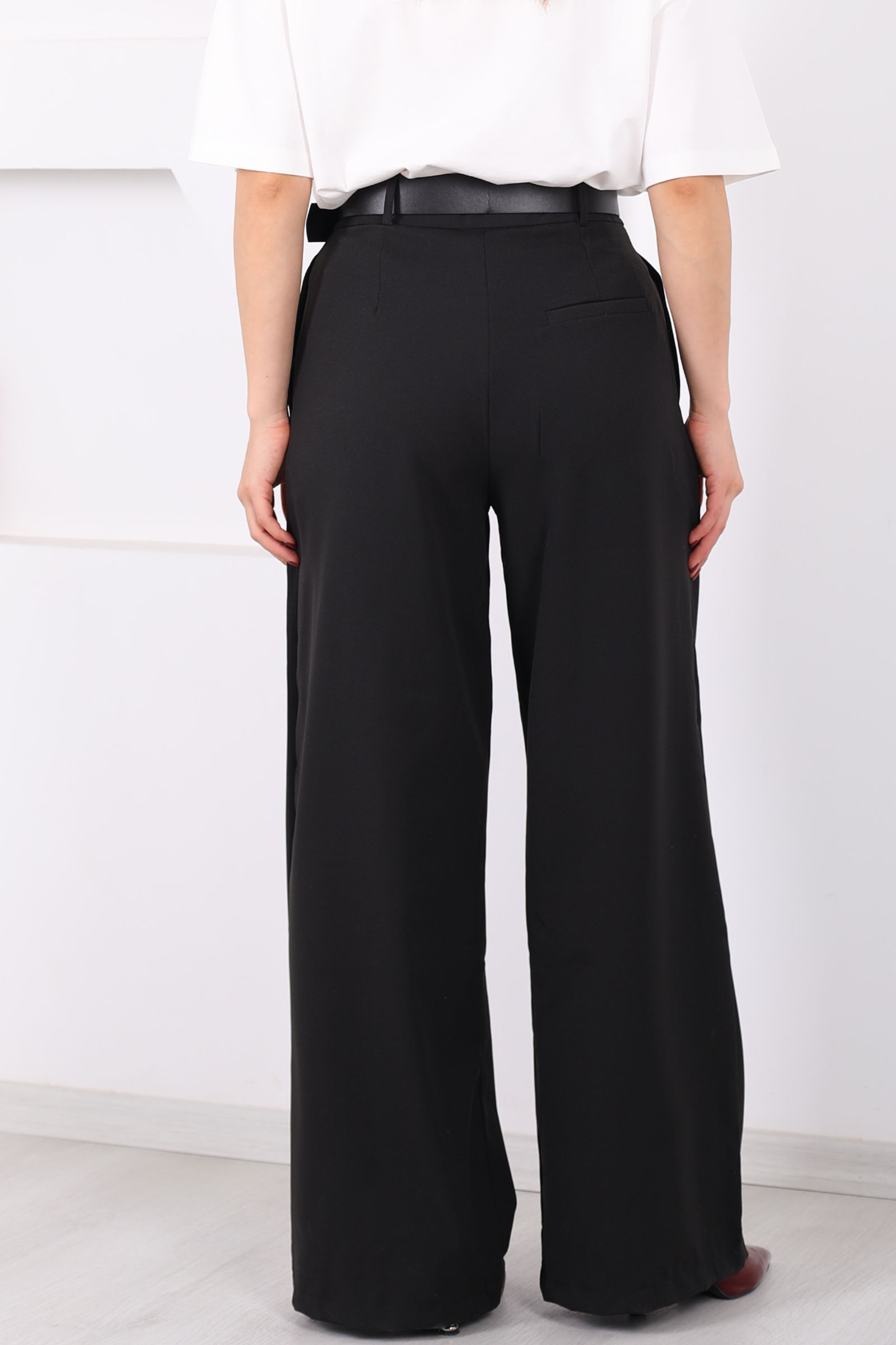 Kemerli Pile Detaylı Siyah Kadın Geniş Paça Pantolon