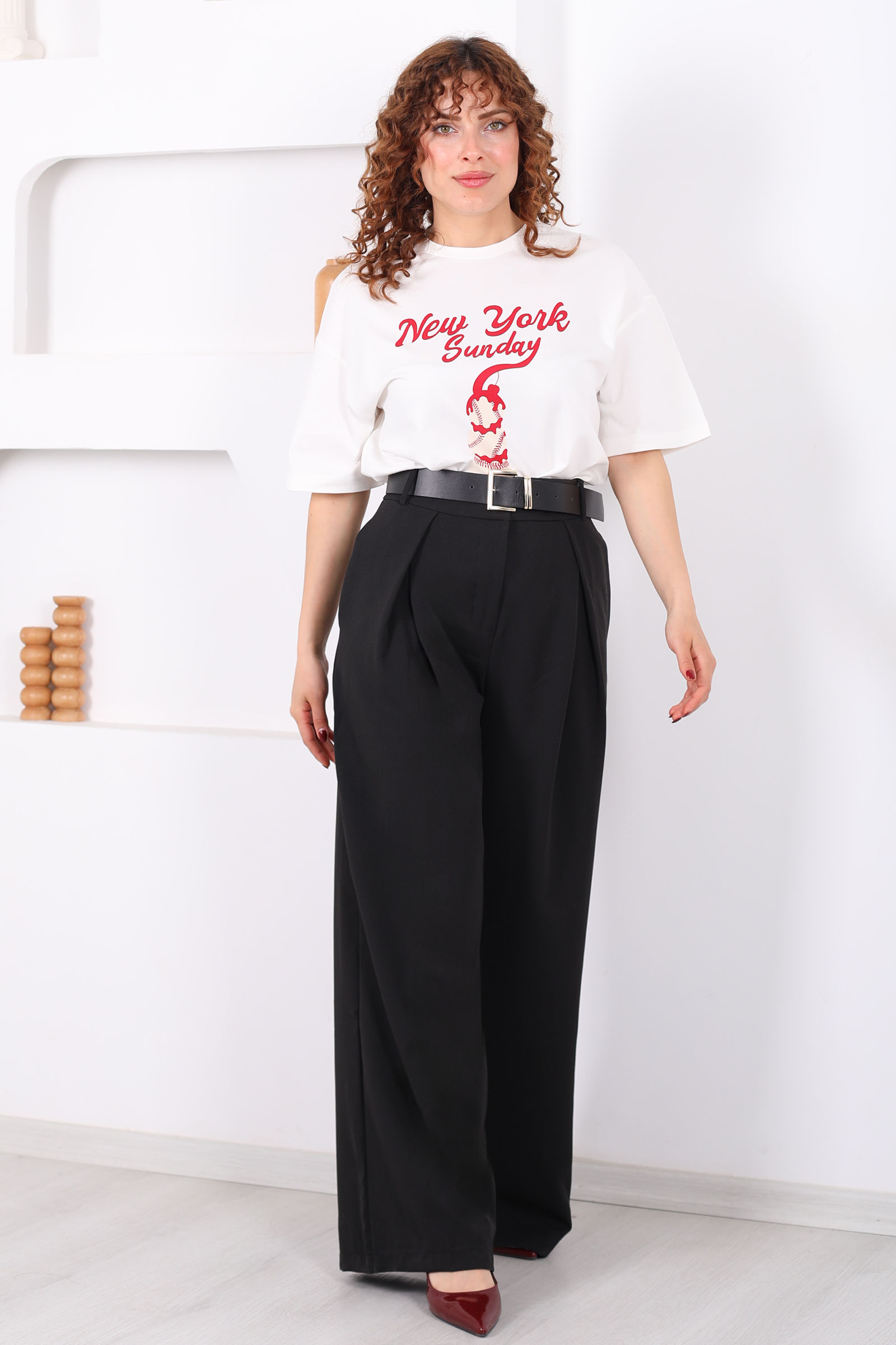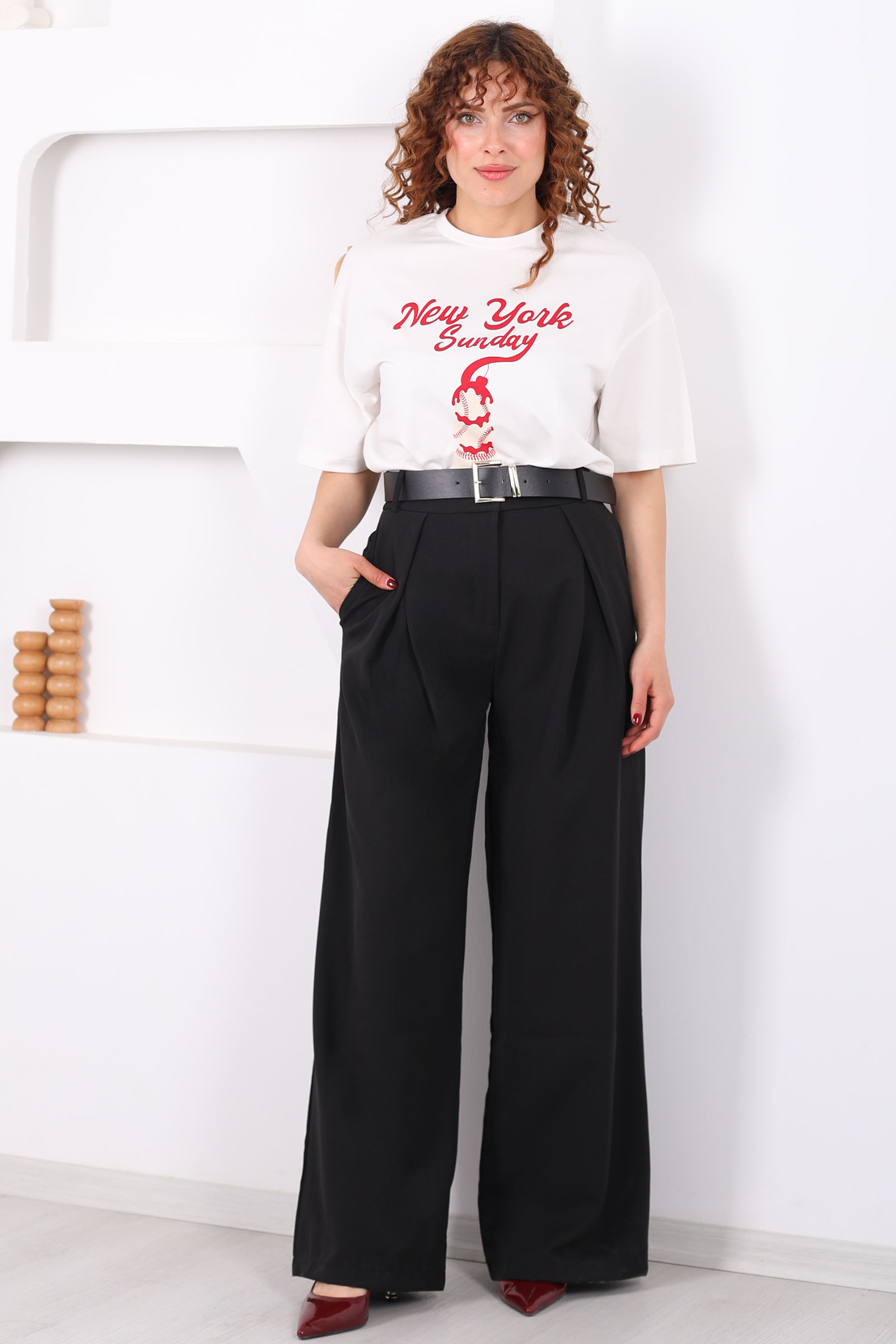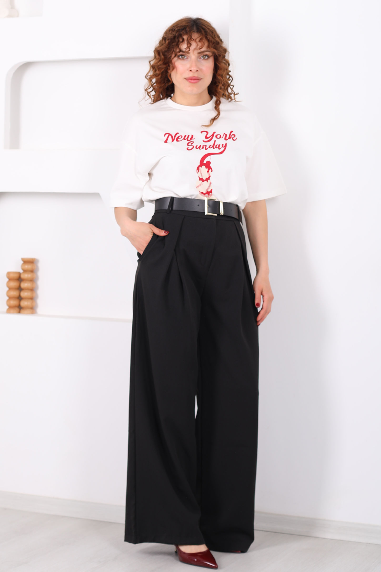 Kemerli Pile Detaylı Siyah Kadın Geniş Paça Pantolon