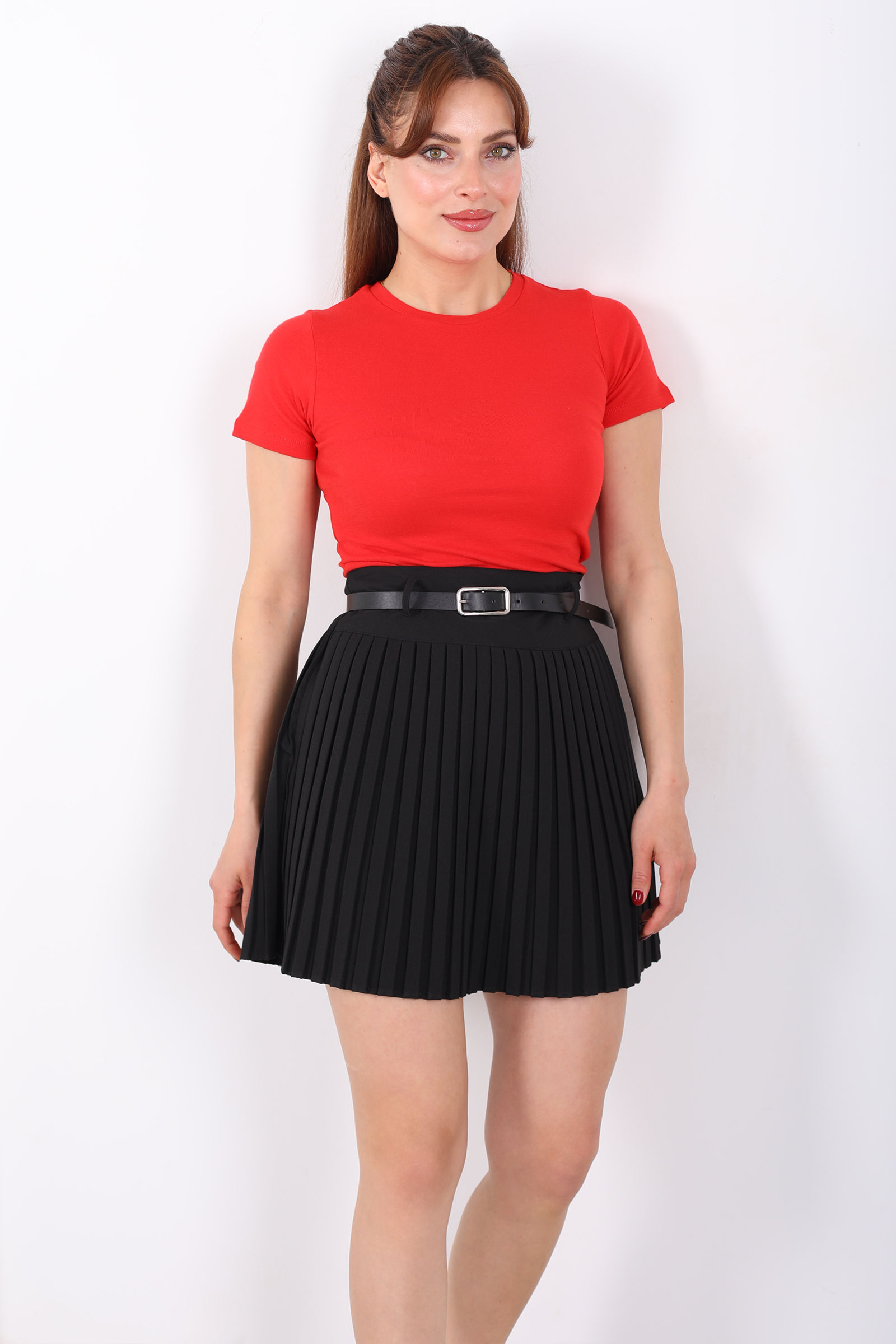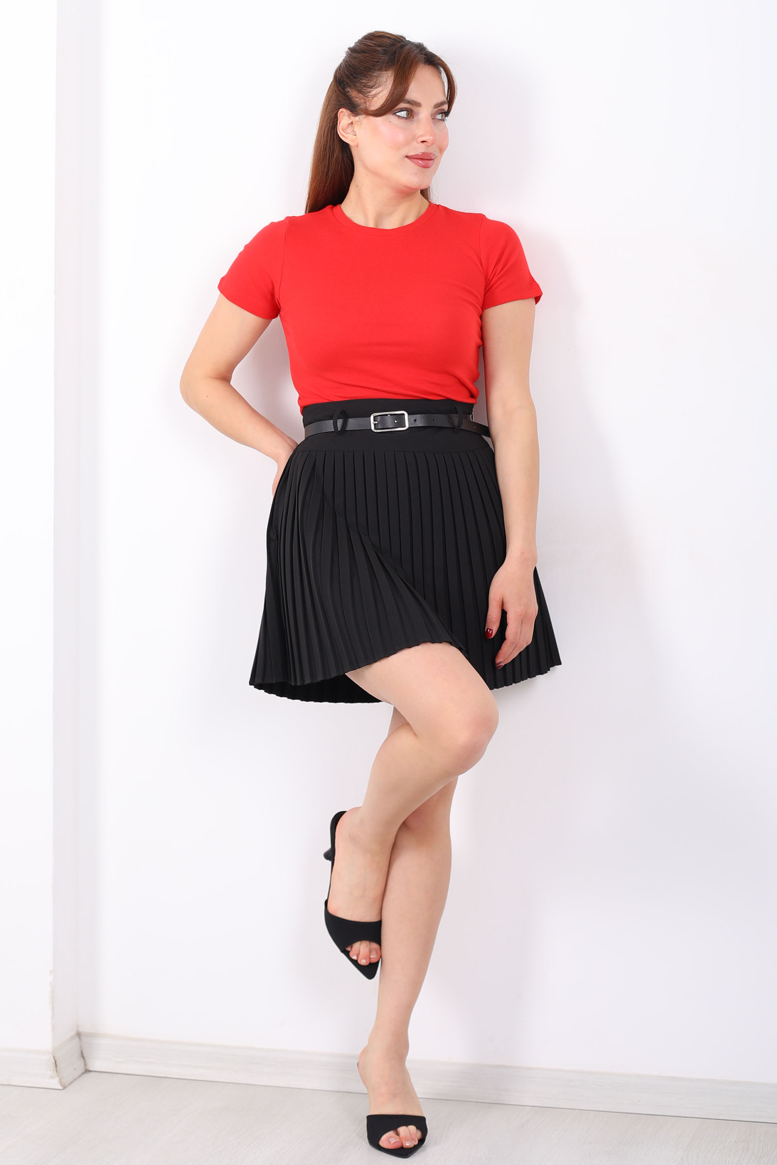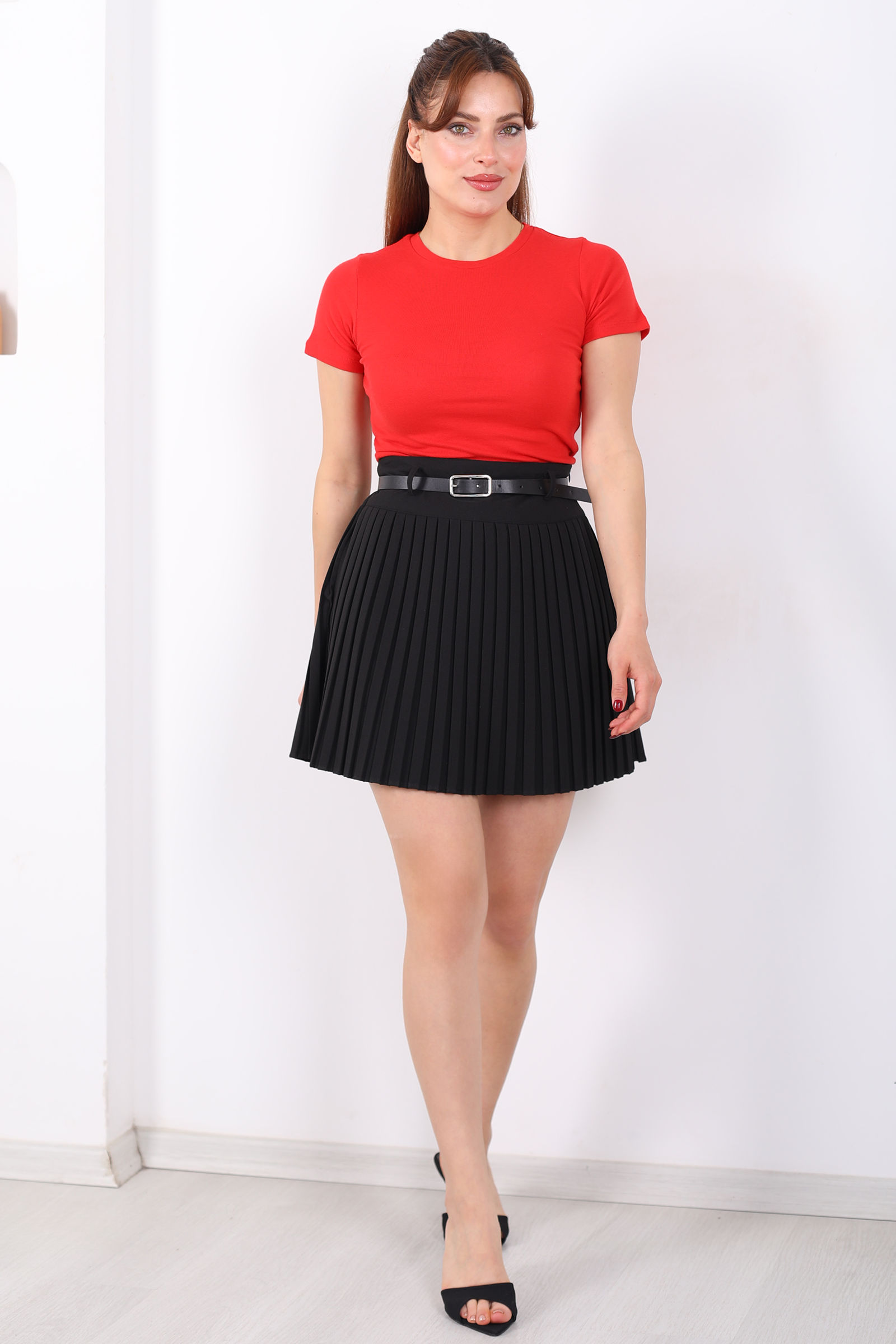 Pileli Kemerli Siyah Mini Kadın Etek