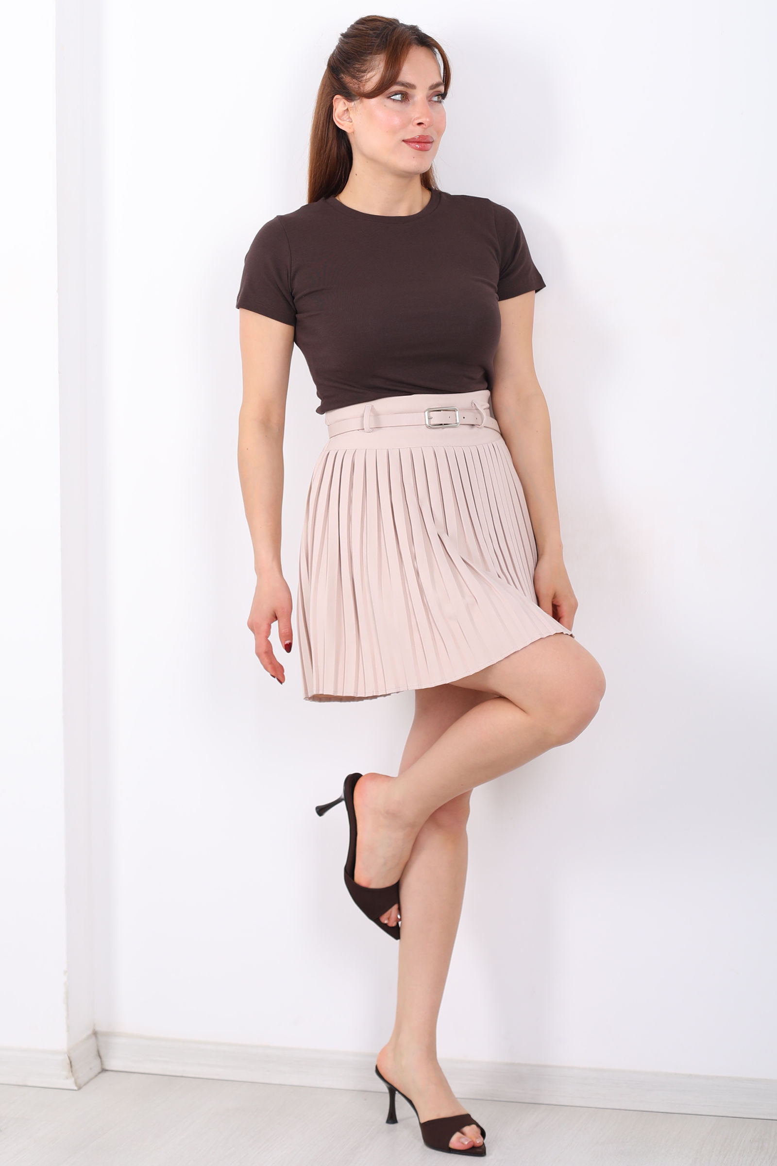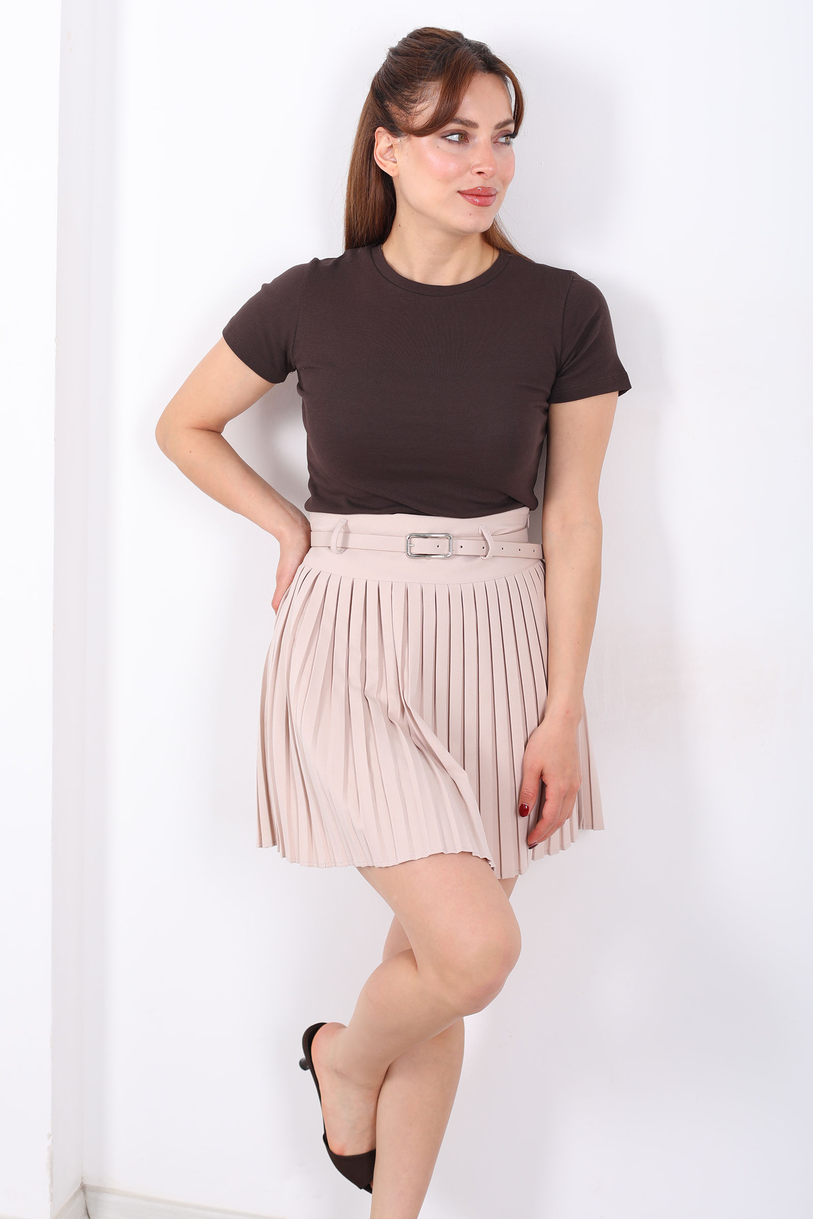 Kemerli Pileli Taş Rengi Kadın Mini Şort Etek