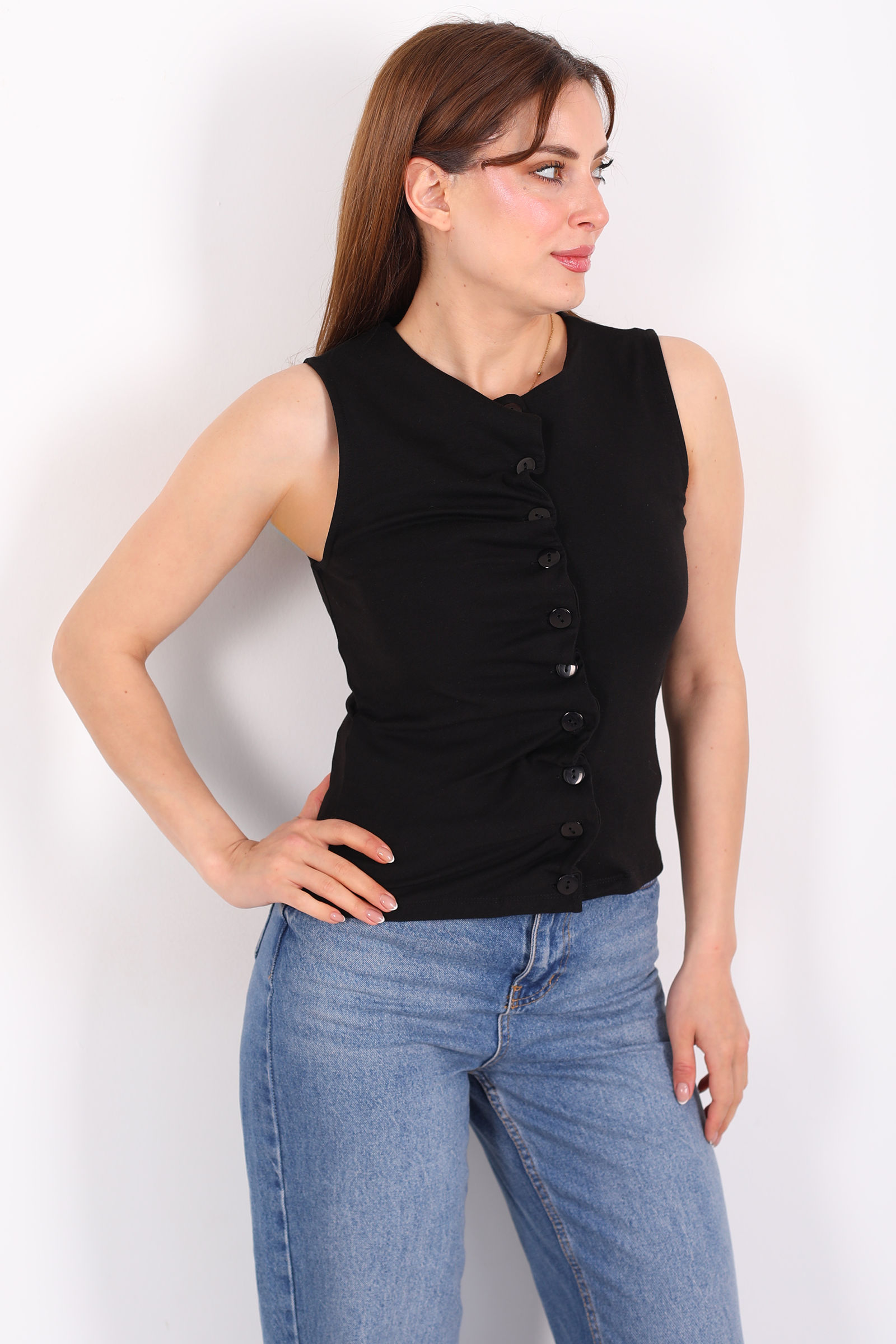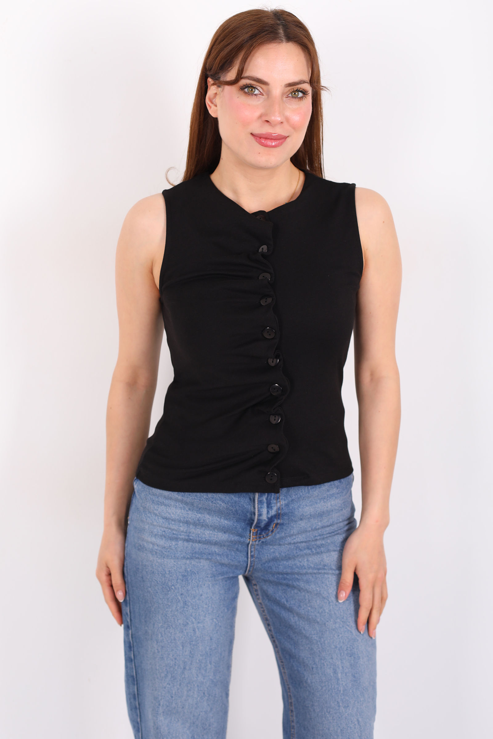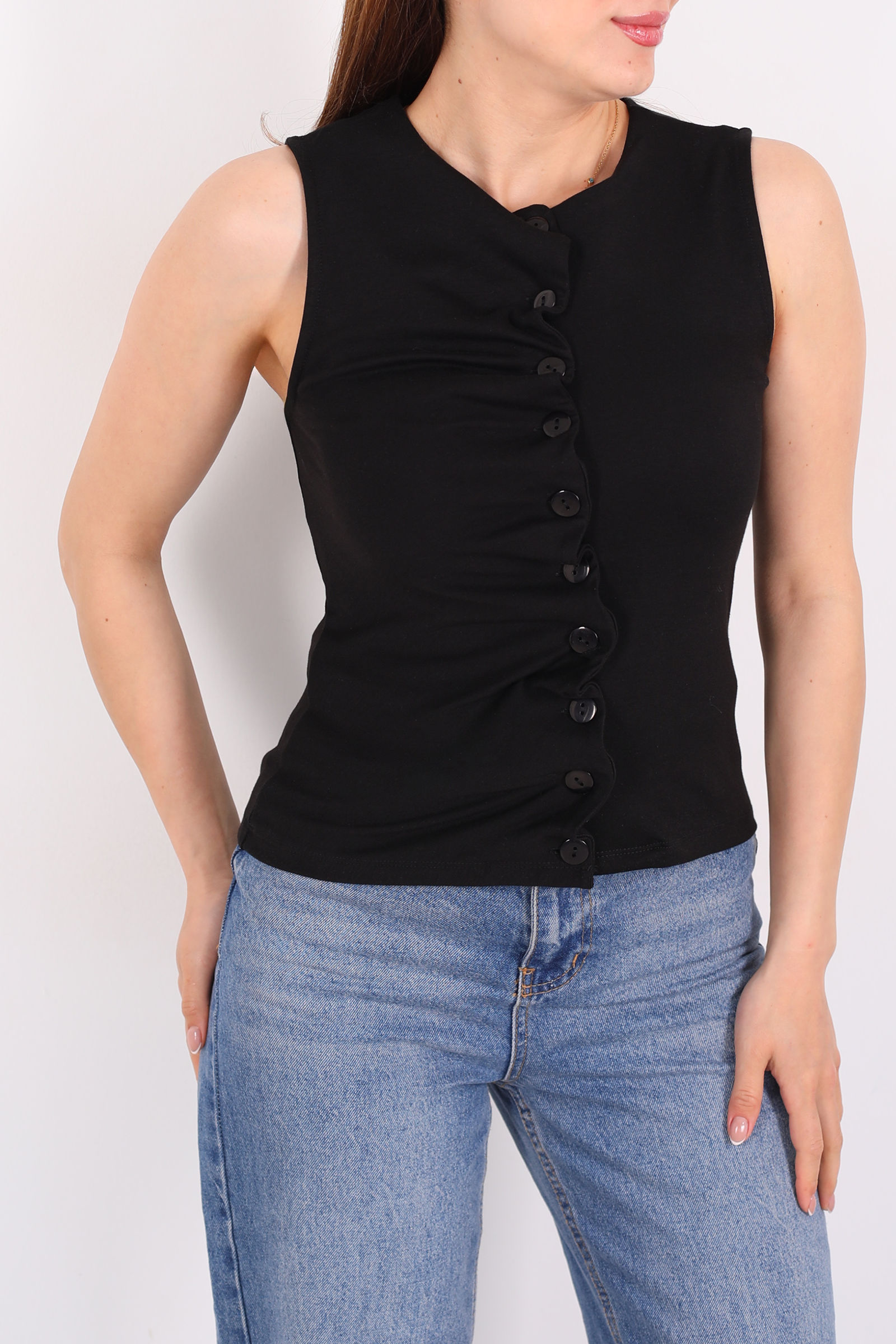 Kendinden Büzgülü Düğmeli Siyah Kadın Bluz
