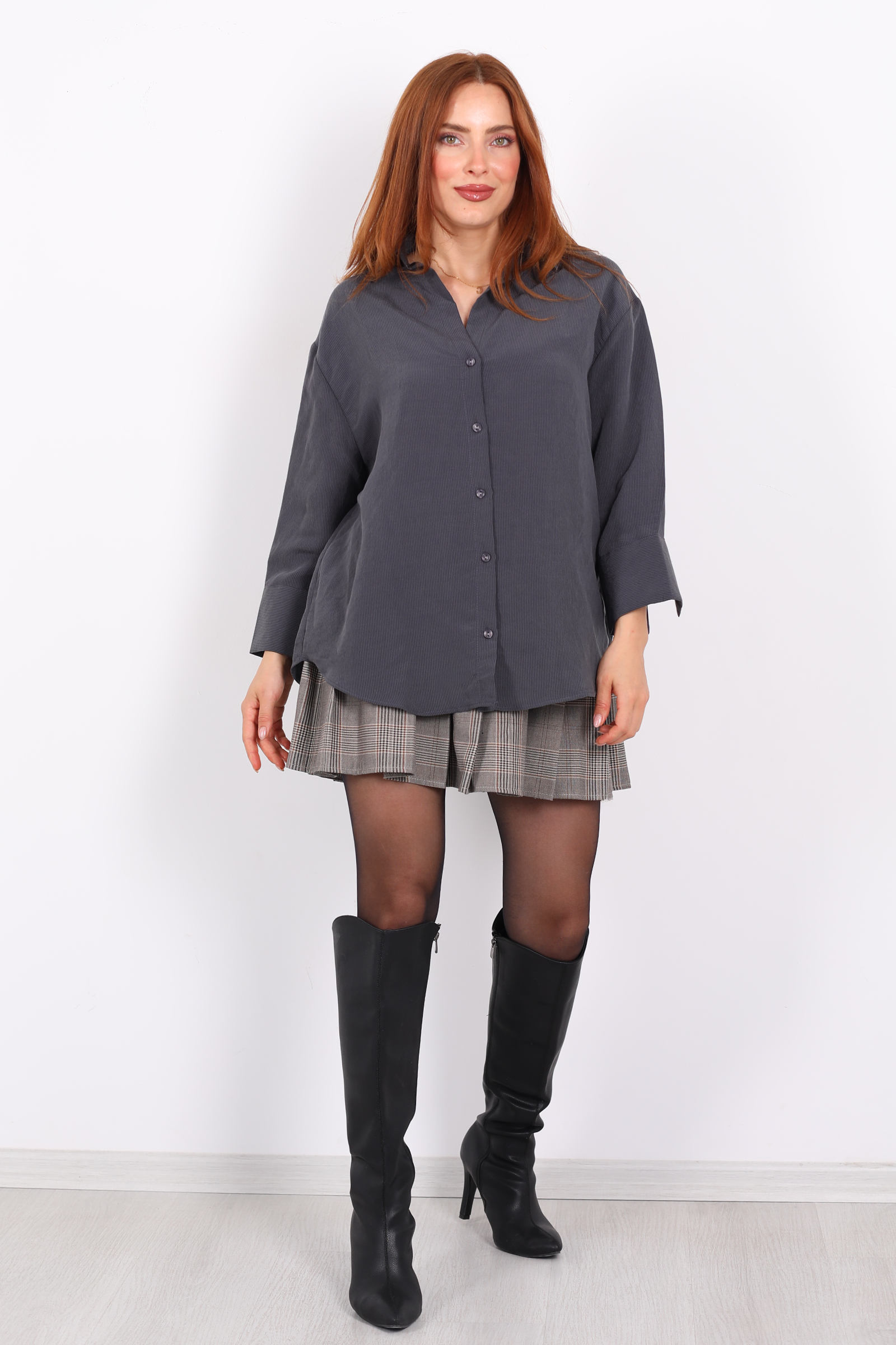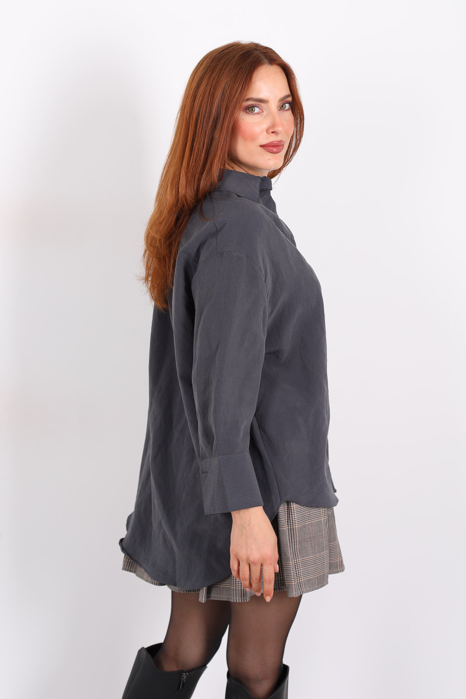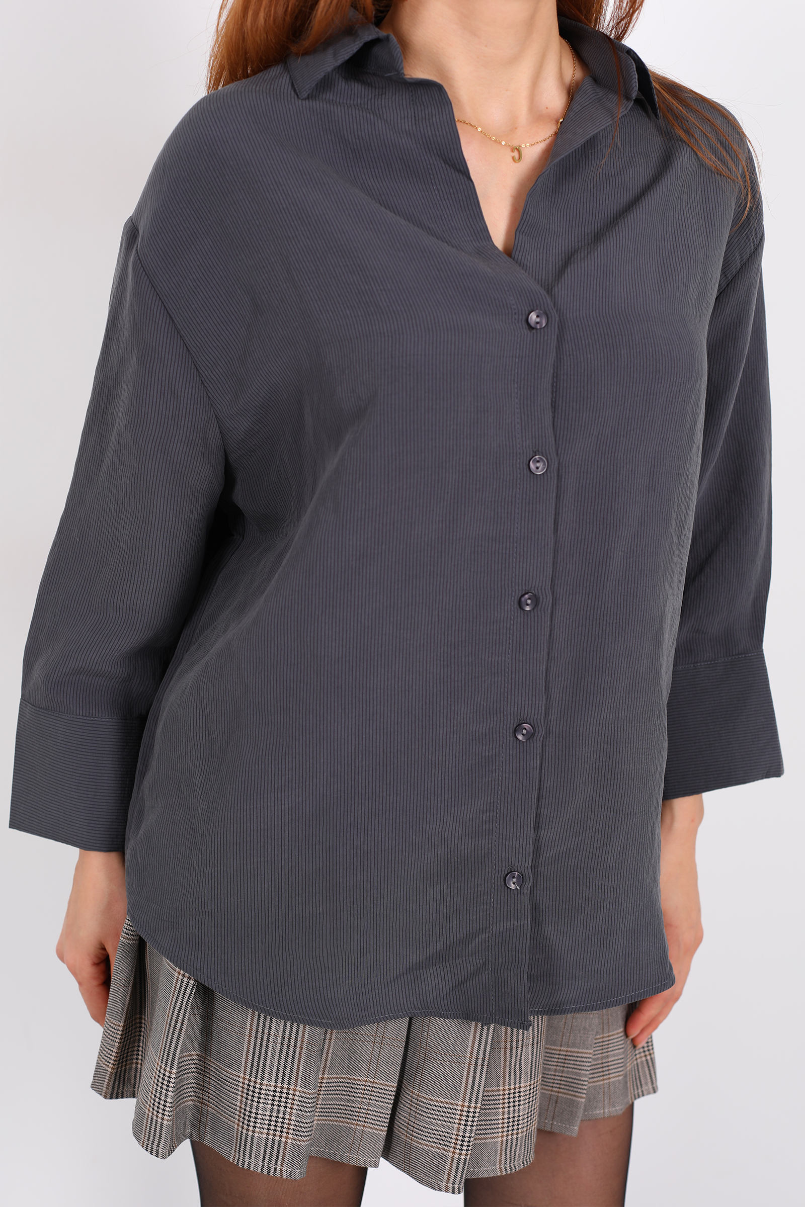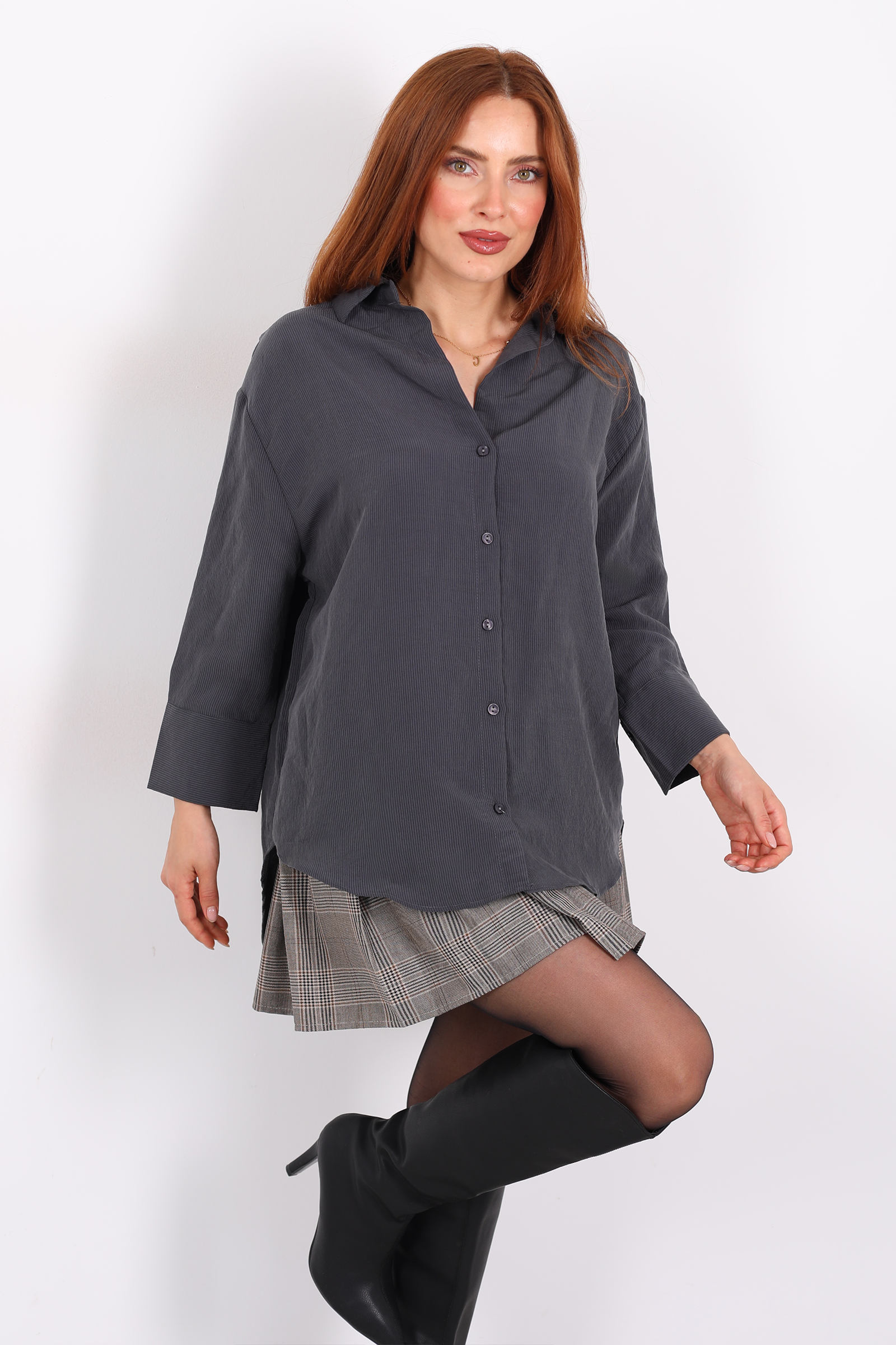 Antrasit tonunun sofistike derinliğiyle modern çizgileri bir araya getiren bu kapri kollu kadın gömlek, kendinden çizgili kumaşı sayesinde hem klasik hem de özgün bir dokunuş sunuyor. Kapri kollar, sıcak havalarda hafiflik sağlarken, ön düğmeli tasarım gömleğe casual şıklık katıyor.Bu gömleği, beyaz veya krem pantolonlarla kombinleyerek ferah ve aydınlık bir gündüz stili oluşturabilir; koyu denim veya siyah dar paça pantolonla ise ofis veya akşam buluşmaları için güçlü ve sofistike bir duruş yakalayabilirsiniz. Gömleğin nötr antrasit tonu, altın veya gümüş takılarla birlikte minimal ama etkileyici bir stil sağlar.