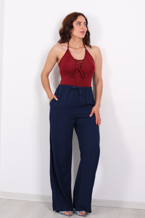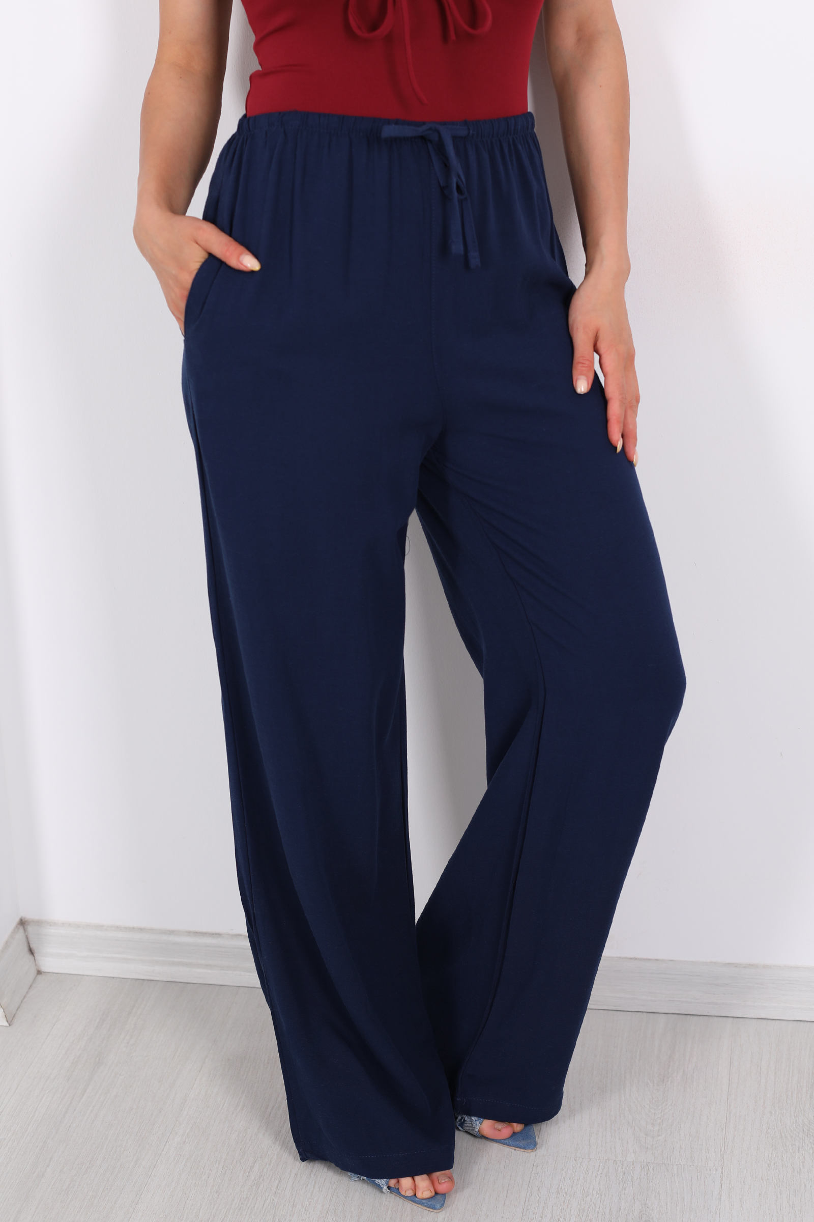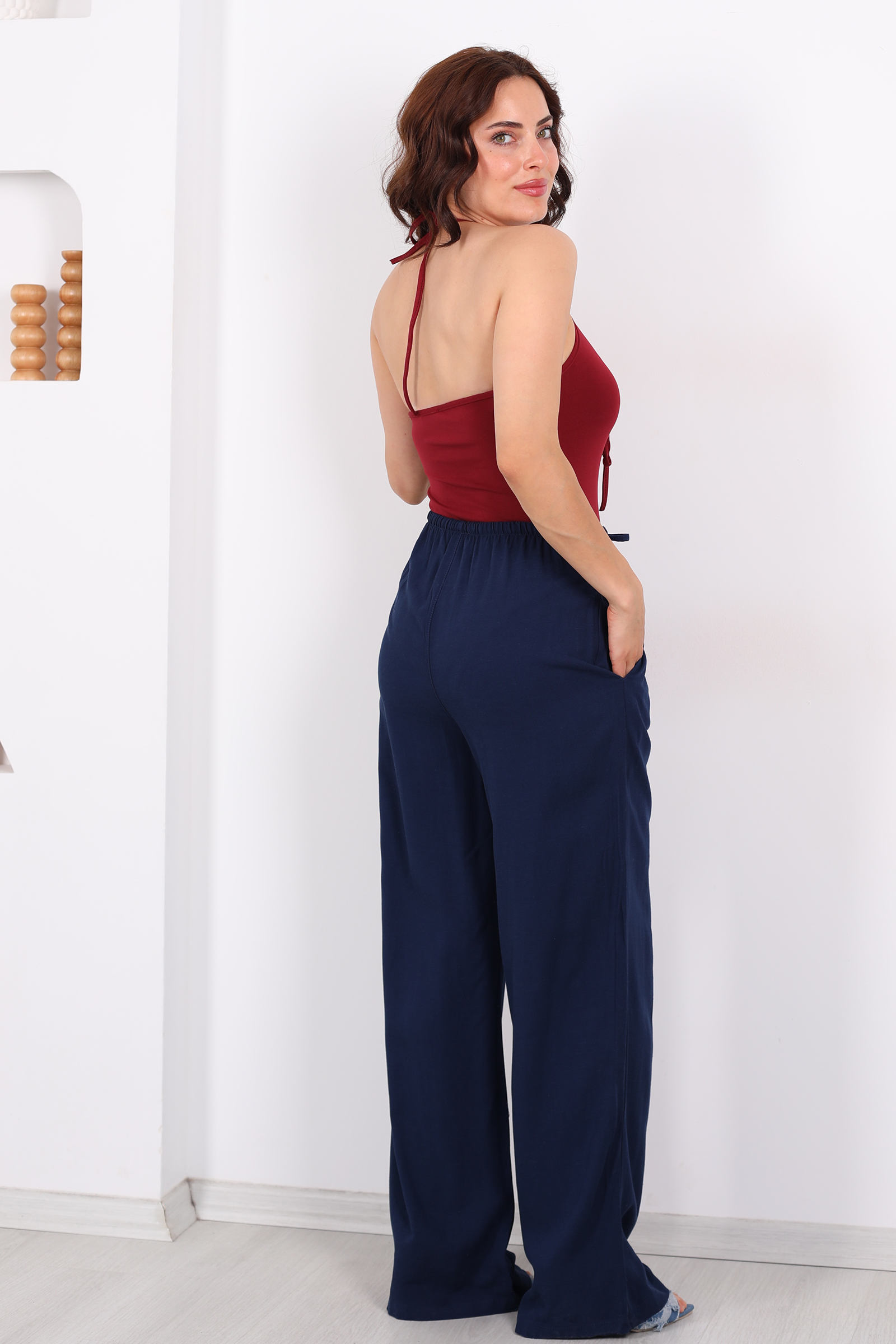 Klasik lacivert rengin zamansız şıklığını yansıtan bu boru paça pantolon, rahatlığı ve modernliği bir araya getiriyor. %50 pamuk, %45 viskon ve %5 keten karışımı kumaşı, nefes alabilen ve hafif yapısıyla gün boyu ferahlık sağlar. Beli bağlamalı detay, bele hoş bir vurgu yaparak siluetinizi belirginleştirirken, boru paça kesimi bacaklarınızı daha uzun ve ince gösterir. Normal kalıbı sayesinde hareket özgürlüğünüzü kısıtlamadan şıklık sunar.Bu lacivert pantolonu, krem tonlarında bir bluz ve sade beyaz sneakerlarla tamamlayarak rahat ve şık bir günlük kombin oluşturabilirsiniz.