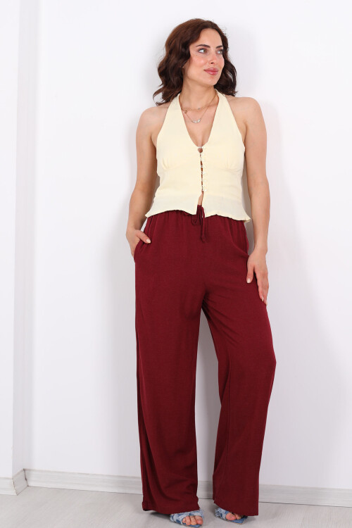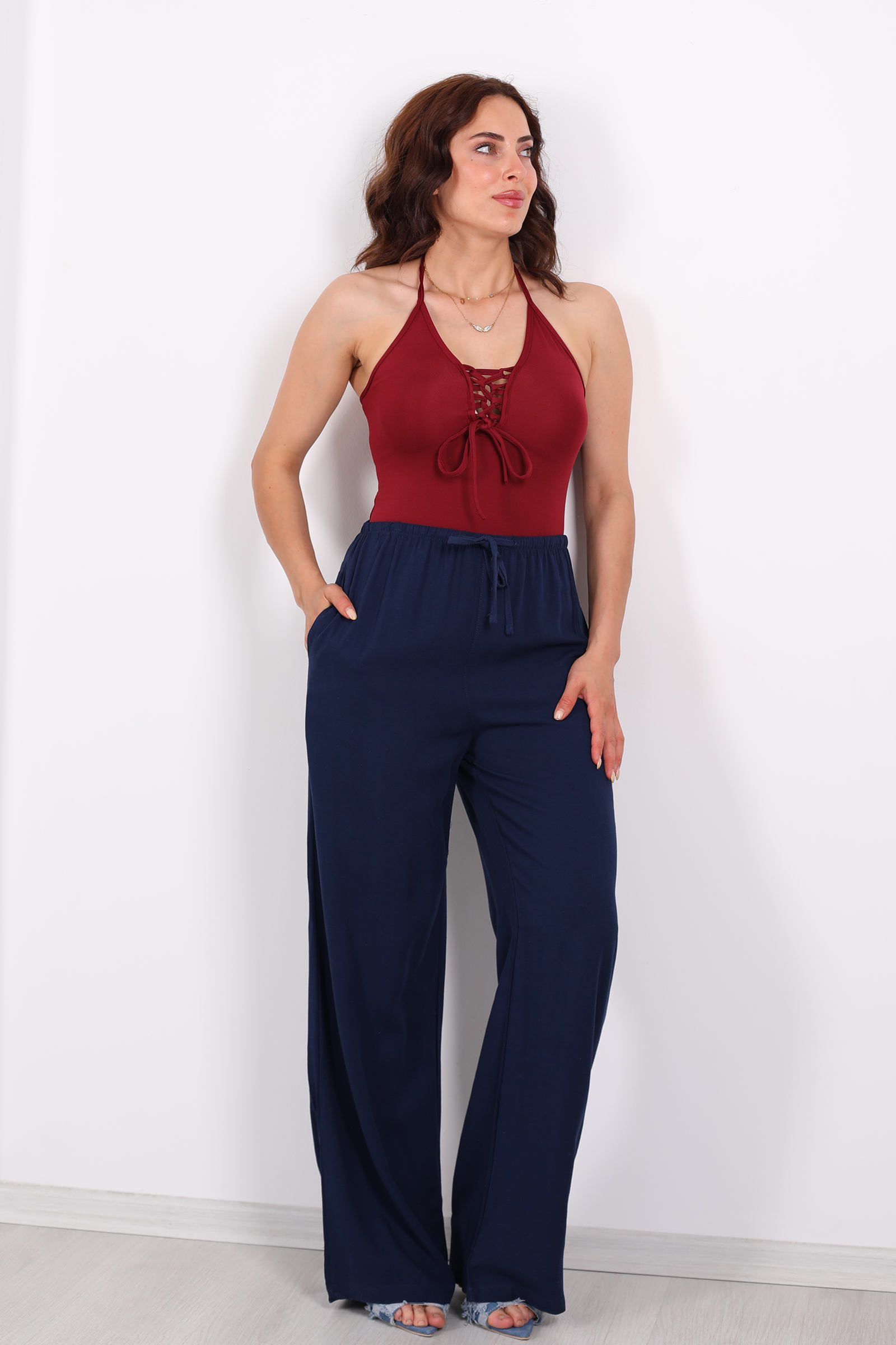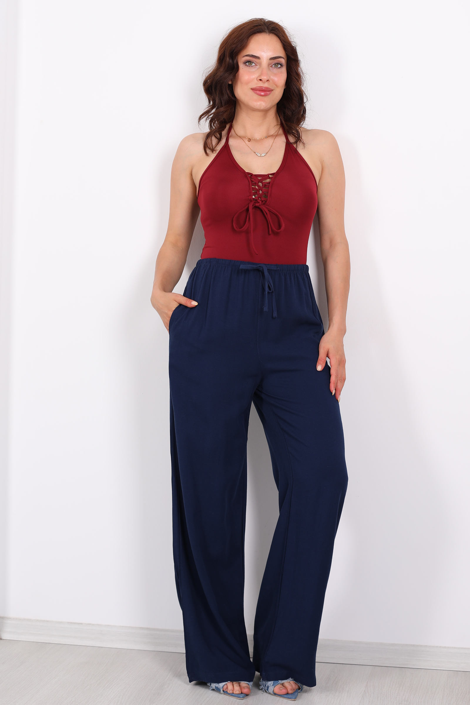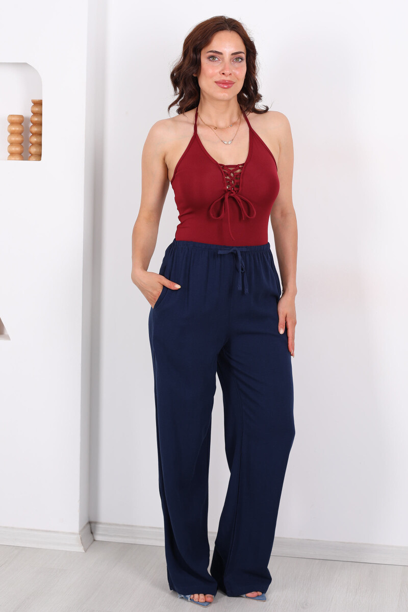 Klasik lacivert rengin zamansız şıklığını yansıtan bu boru paça pantolon, rahatlığı ve modernliği bir araya getiriyor. %50 pamuk, %45 viskon ve %5 keten karışımı kumaşı, nefes alabilen ve hafif yapısıyla gün boyu ferahlık sağlar. Beli bağlamalı detay, bele hoş bir vurgu yaparak siluetinizi belirginleştirirken, boru paça kesimi bacaklarınızı daha uzun ve ince gösterir. Normal kalıbı sayesinde hareket özgürlüğünüzü kısıtlamadan şıklık sunar.Bu lacivert pantolonu, krem tonlarında bir bluz ve sade beyaz sneakerlarla tamamlayarak rahat ve şık bir günlük kombin oluşturabilirsiniz.