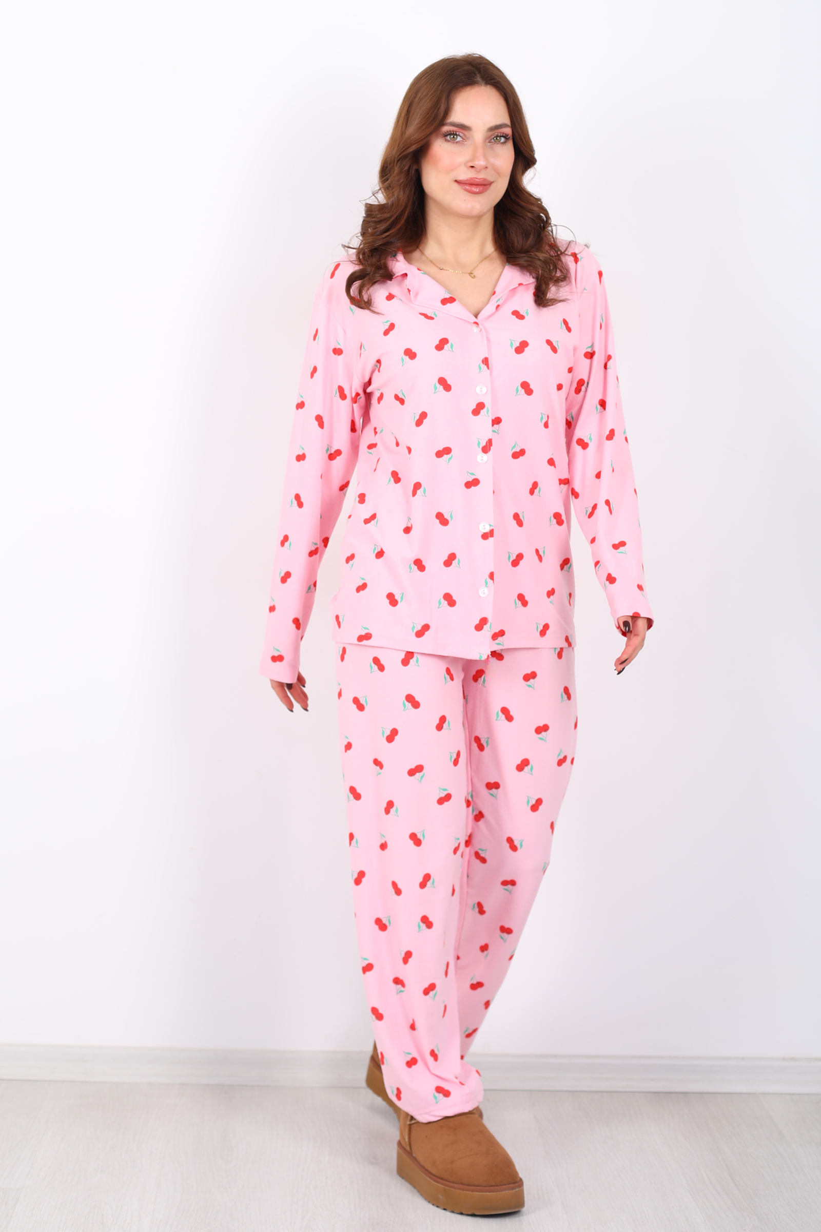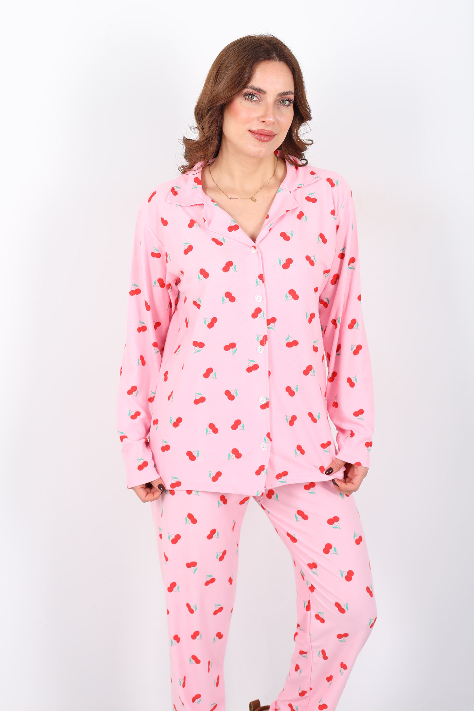 Kiraz Desenli Pembe Kadın Gömlek Pijama Takım