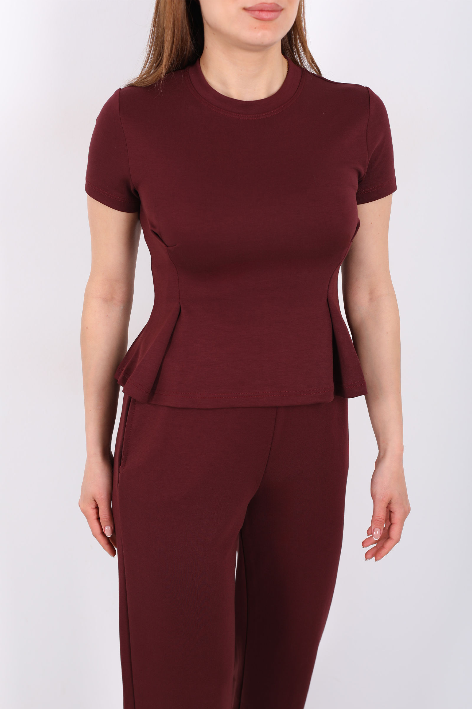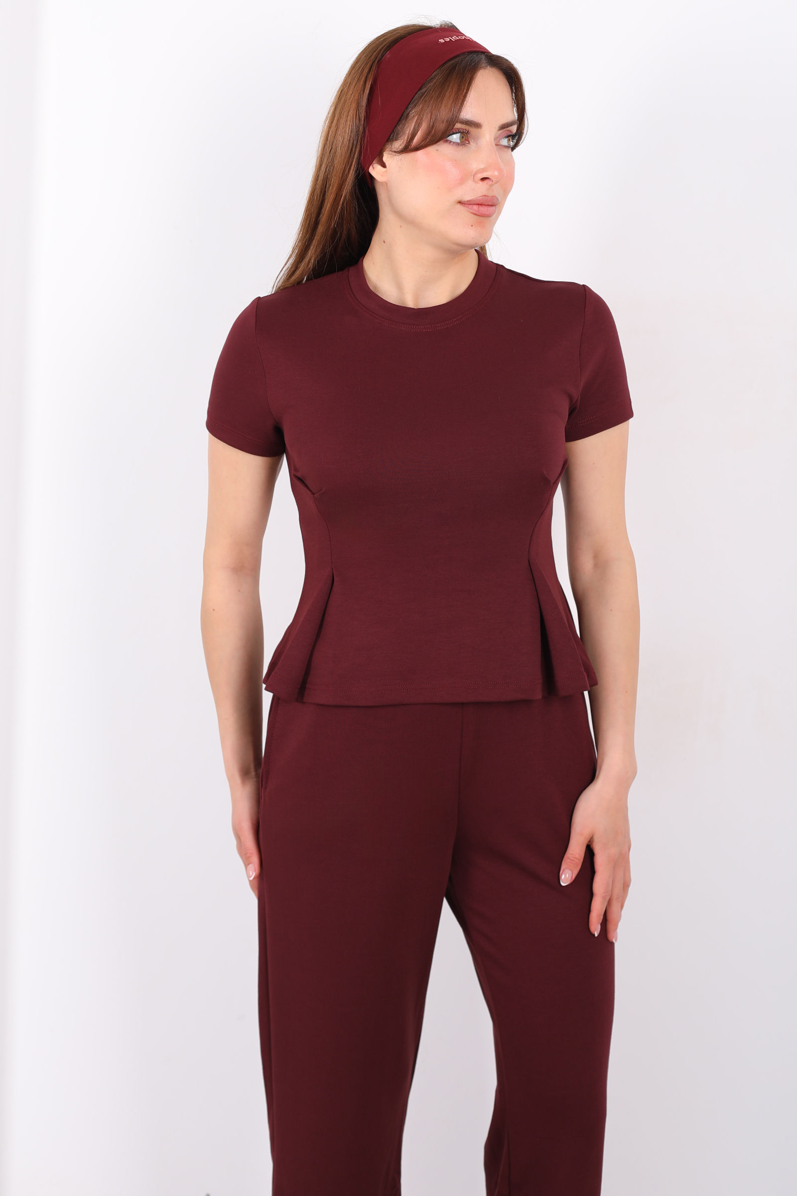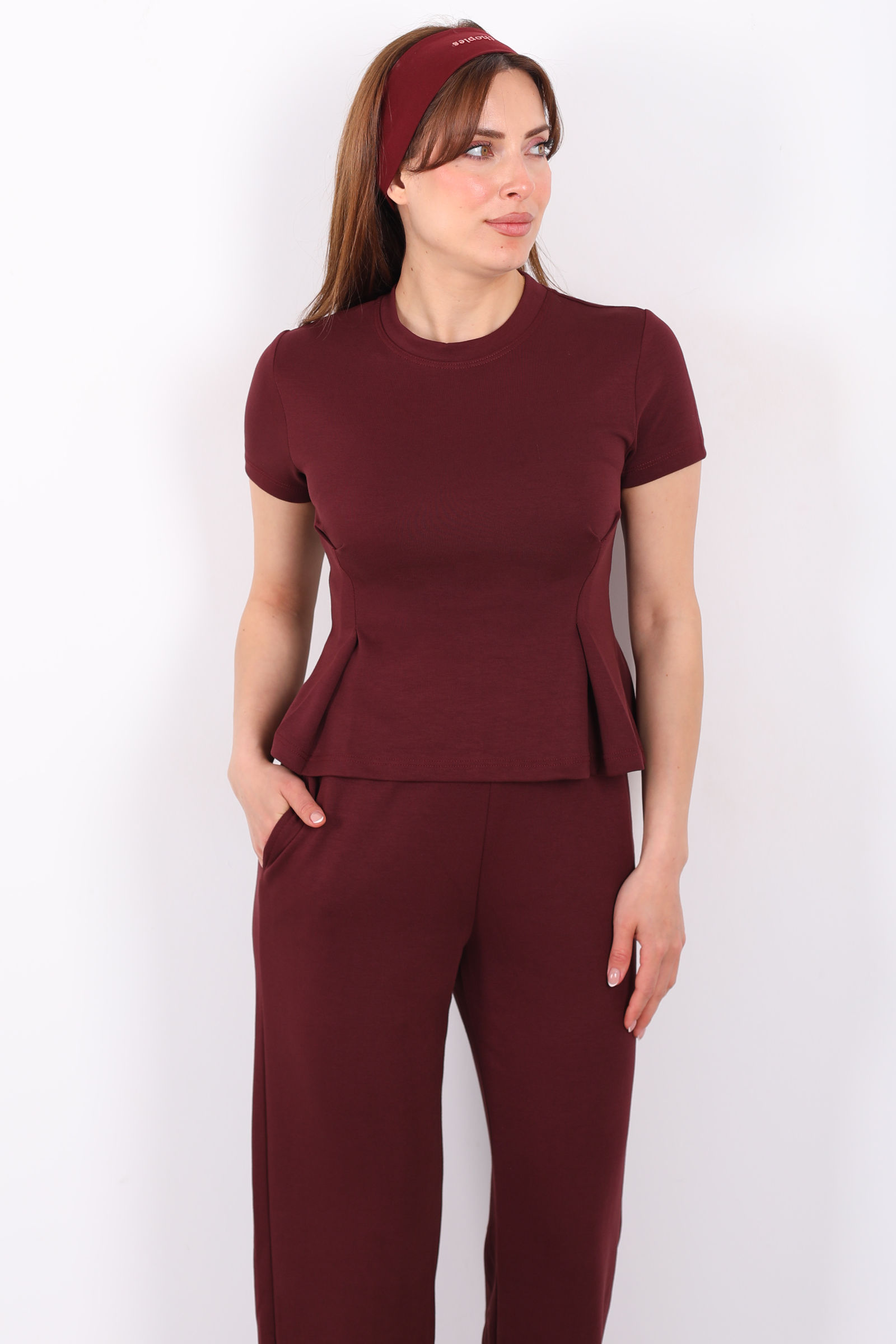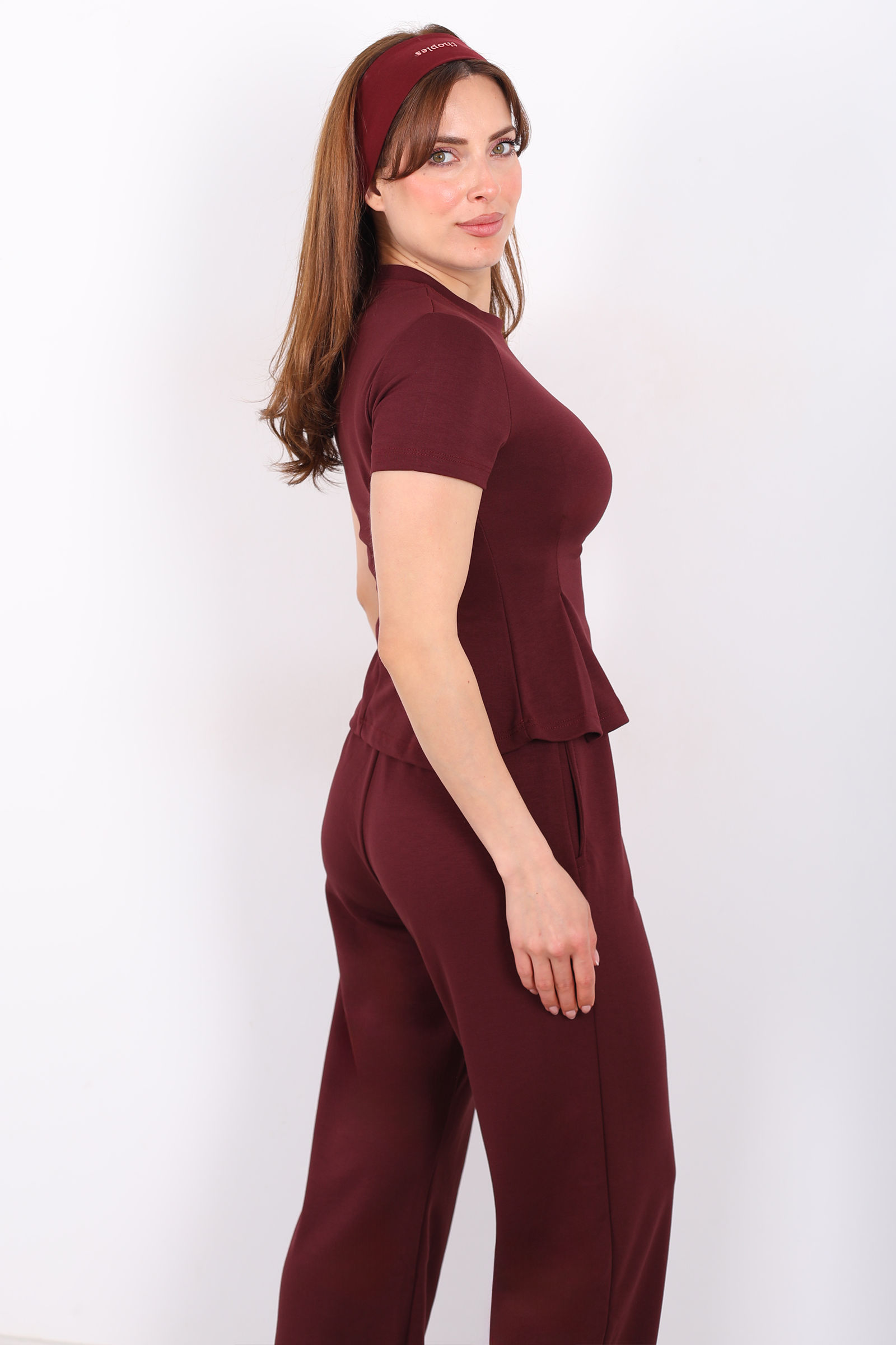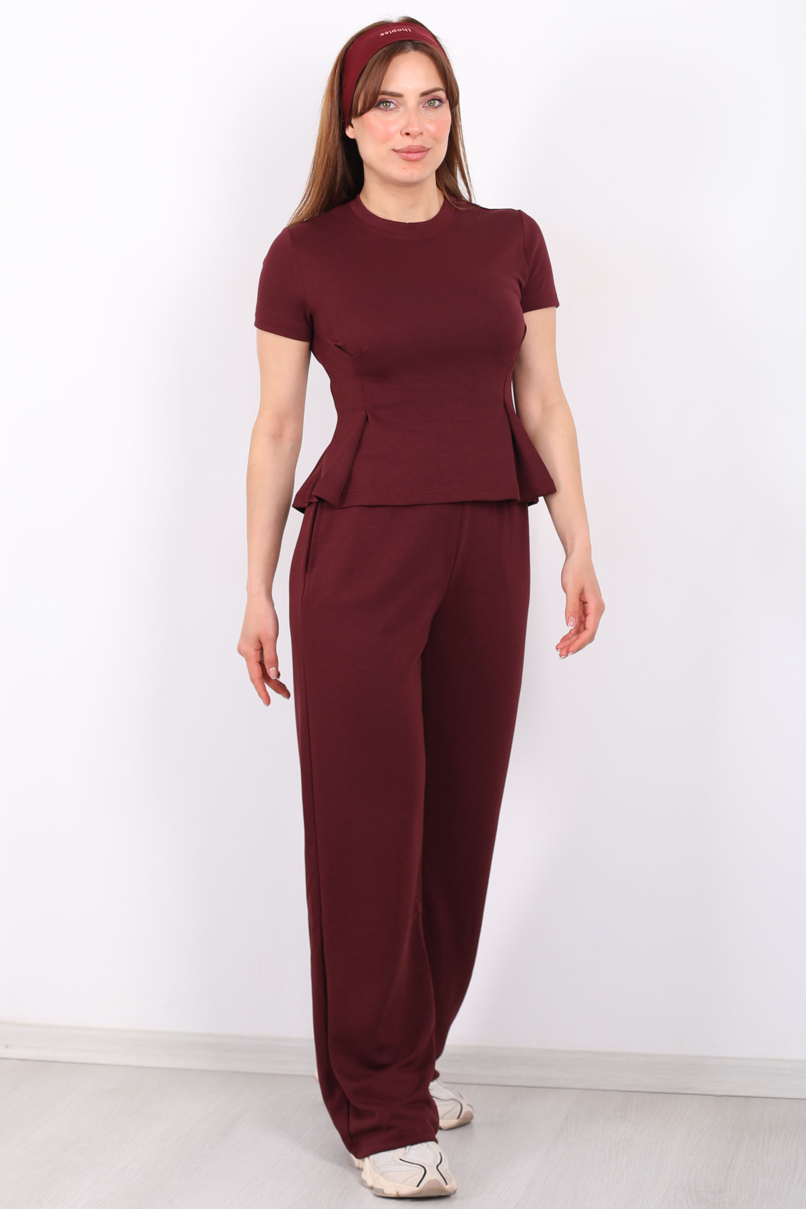 Kısa Kol Volanlı Kadın Bordo Bol Paça Pantolon Takım