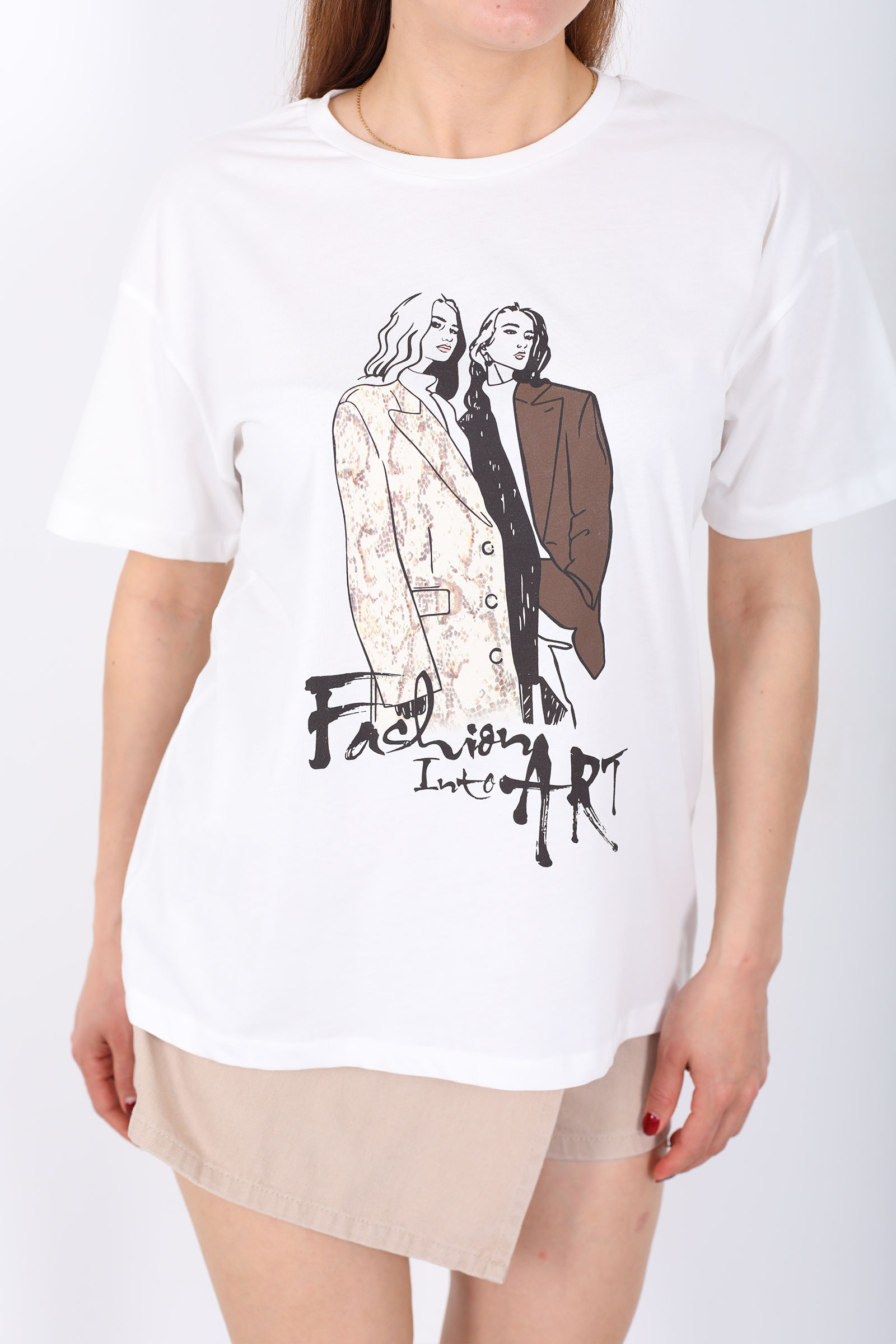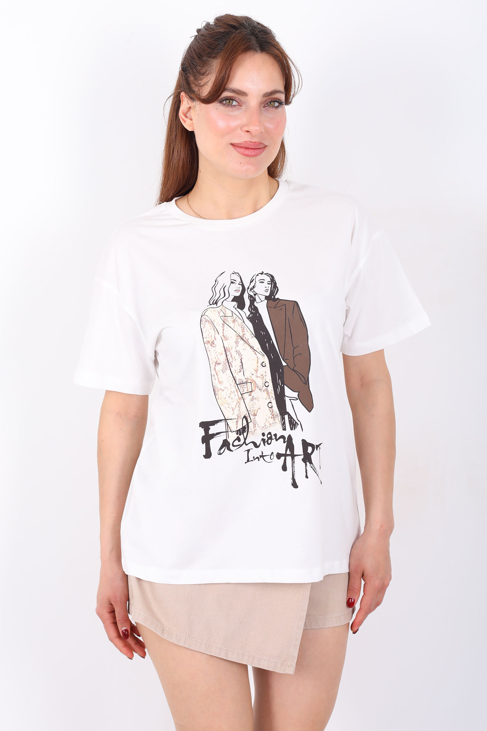Kız Figürü Baskılı Kadın Ekru T-Shirt