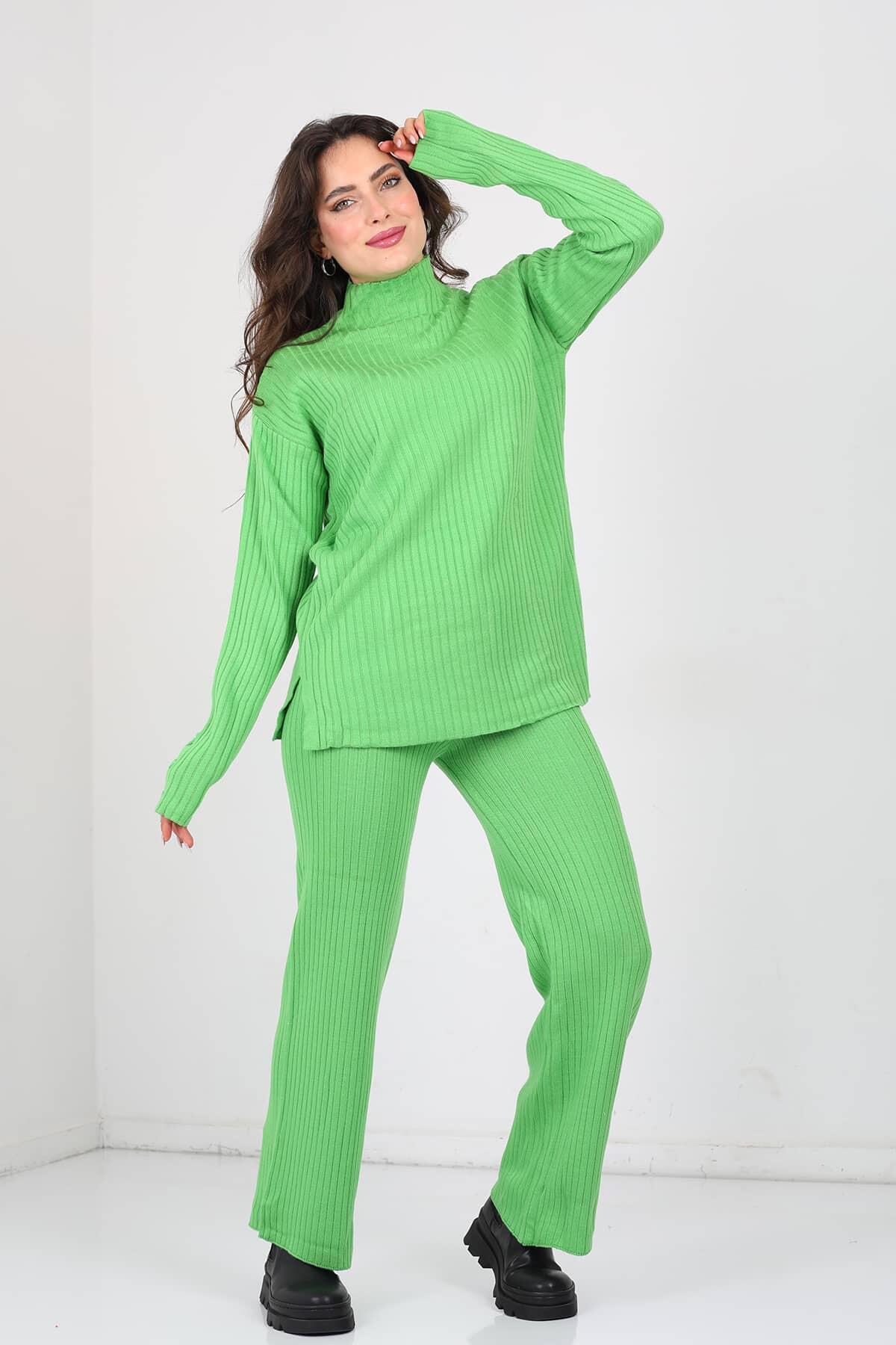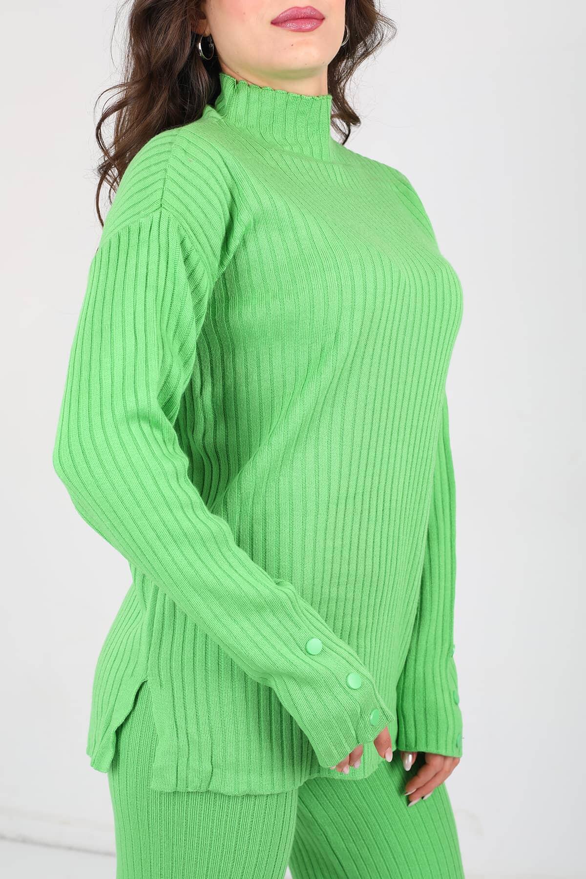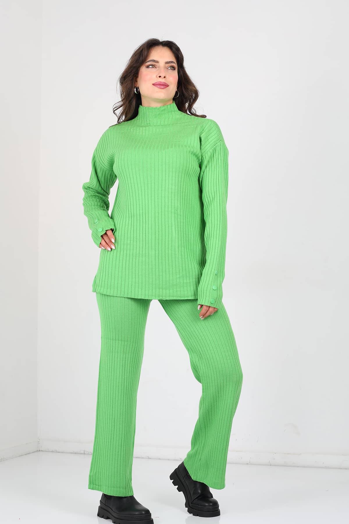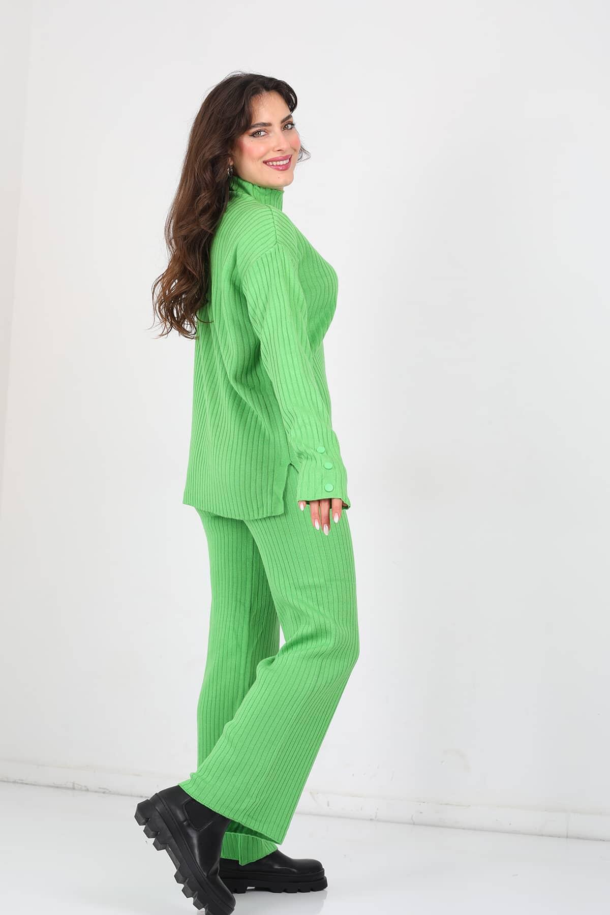 Kol Süs Düğmeli Bol Paça Yeşil Kadın Triko Takım