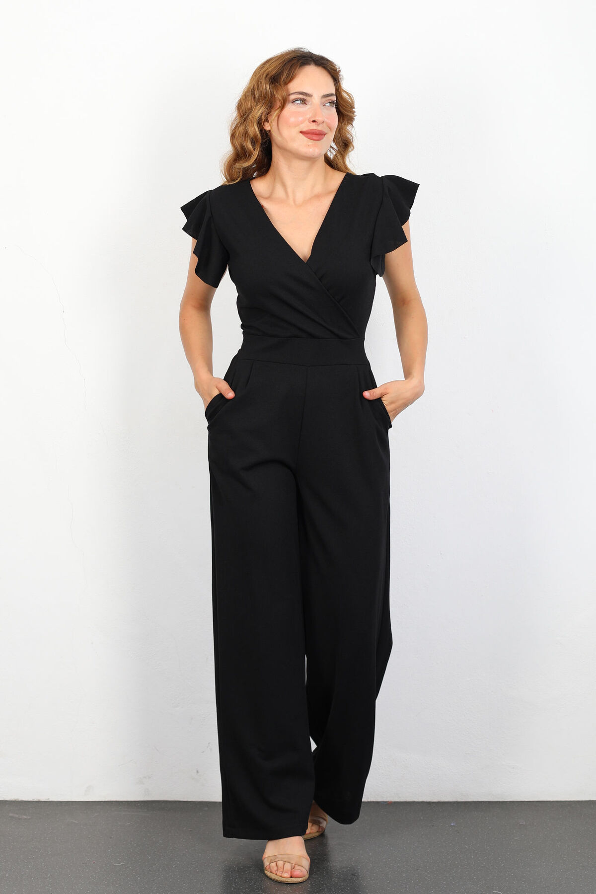 Kolları Volanlı Bol Paça Siyah Kadın Tulum, zarafeti detaylarla buluşturan, hem stil sahibi hem de konforlu bir seçenektir. Hafif atlas kumaştan üretilmiş bu tulum, kollarındaki volanlı fırfırlar sayesinde hareketli ve feminen bir hava kazandırırken, bol paça kesimi gün boyu rahatlıkla dolaşmanızı sağlar. Yüksek bel bölgesi bedeninizi zarifçe şekillendirirken, siyah rengiyle günün her anına uyum sağlar.