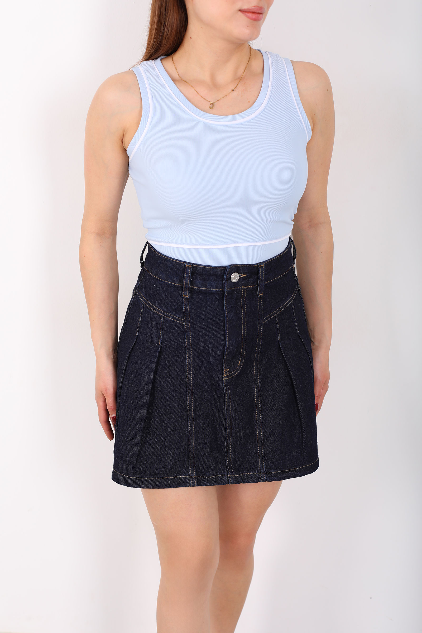 Kolsuz Biyeli Fitilli Bebe Mavi Kadın Crop Top