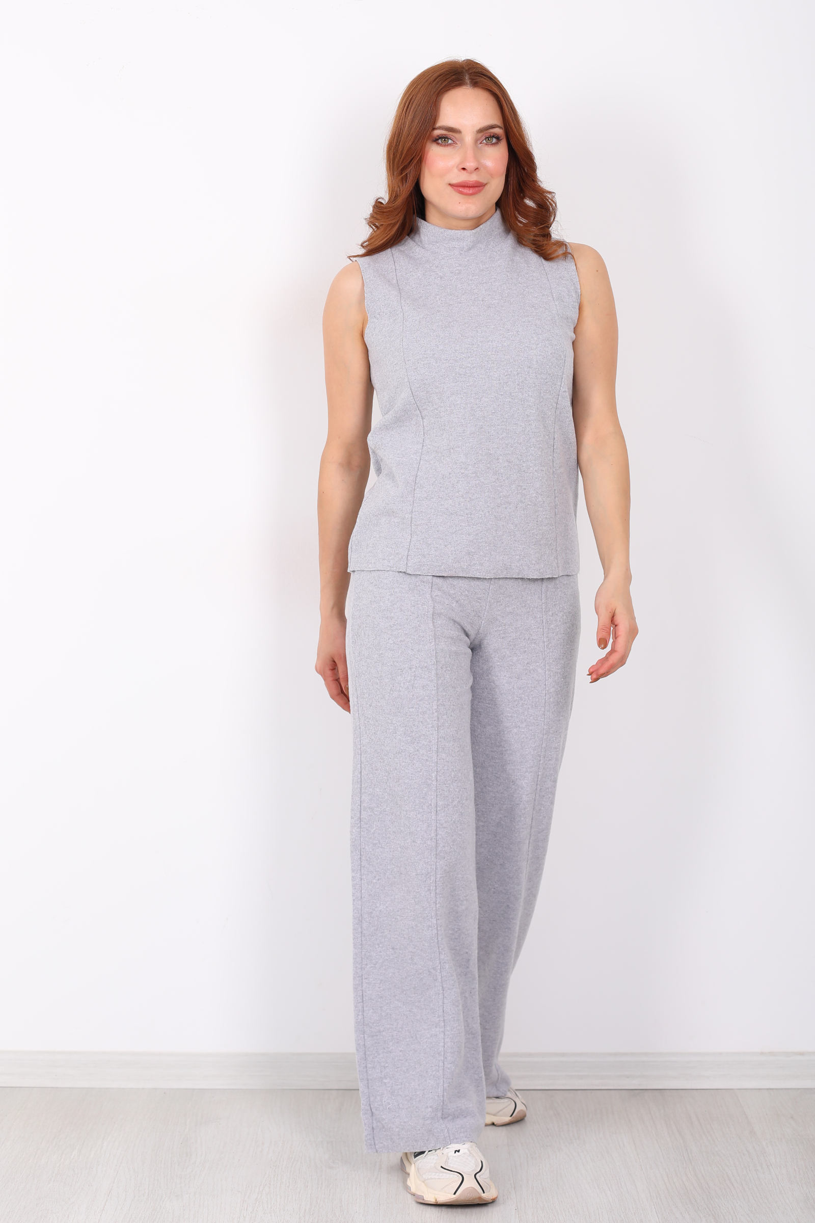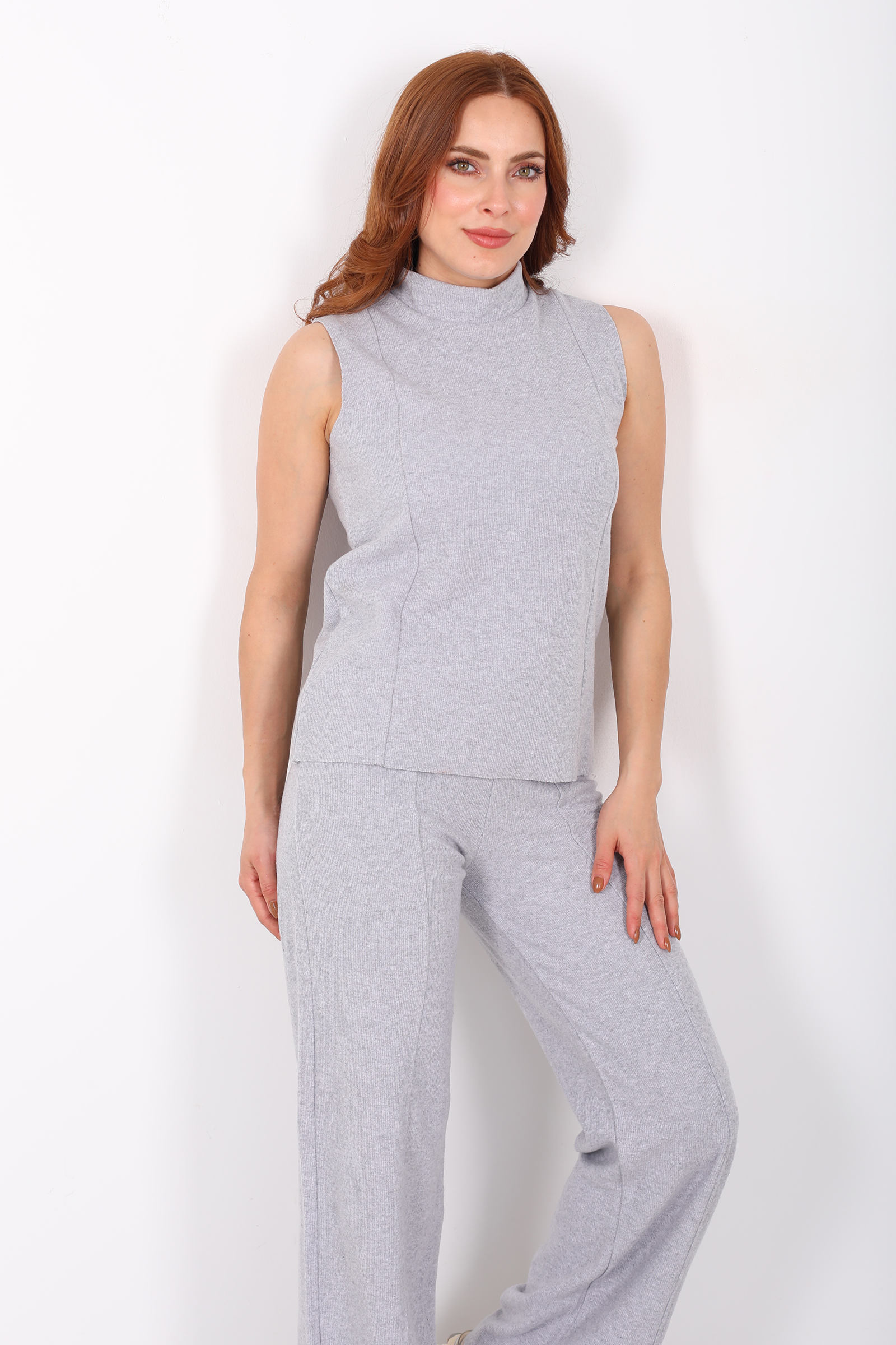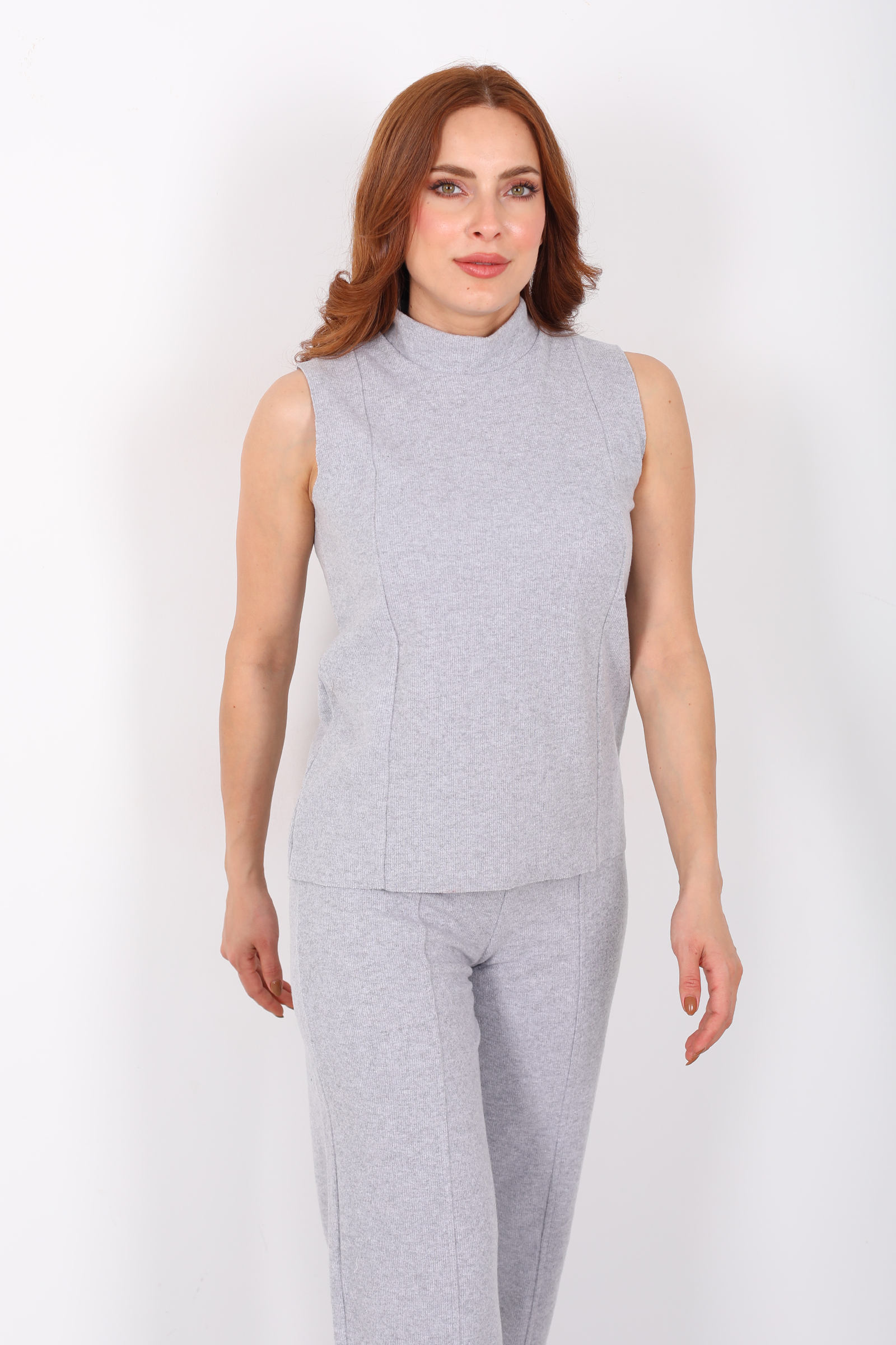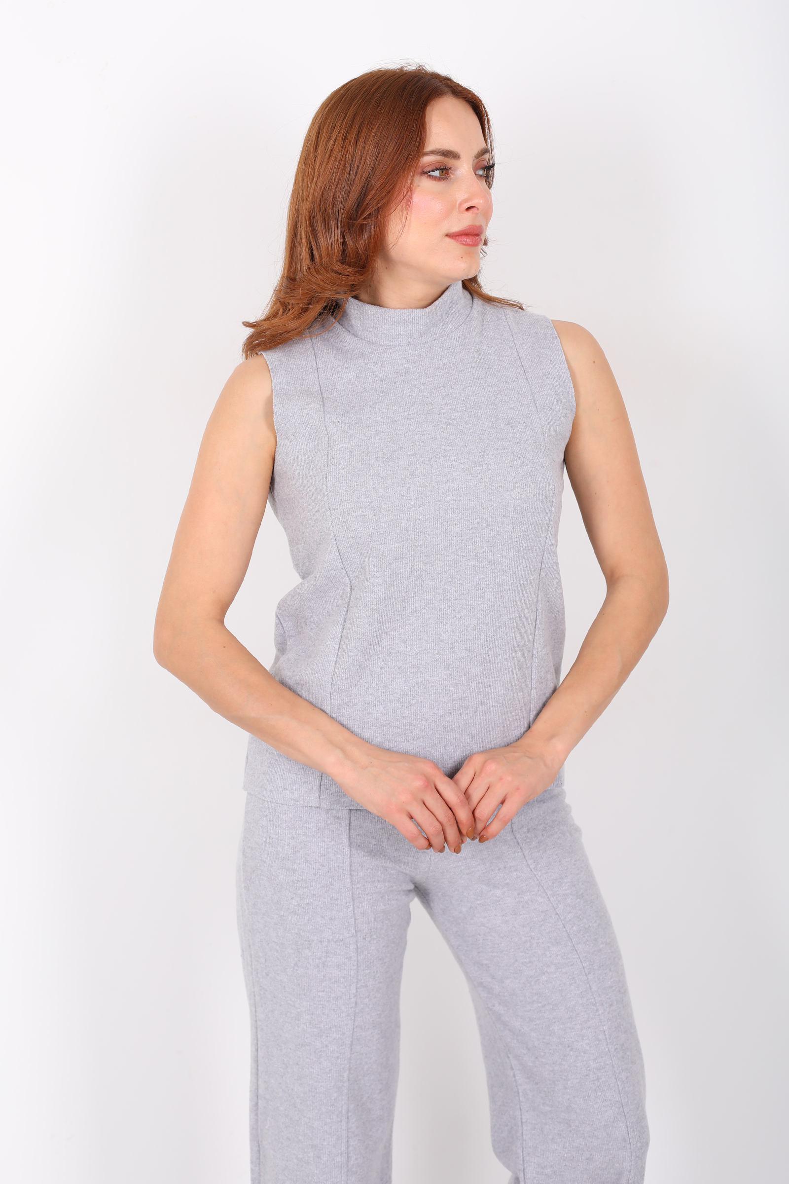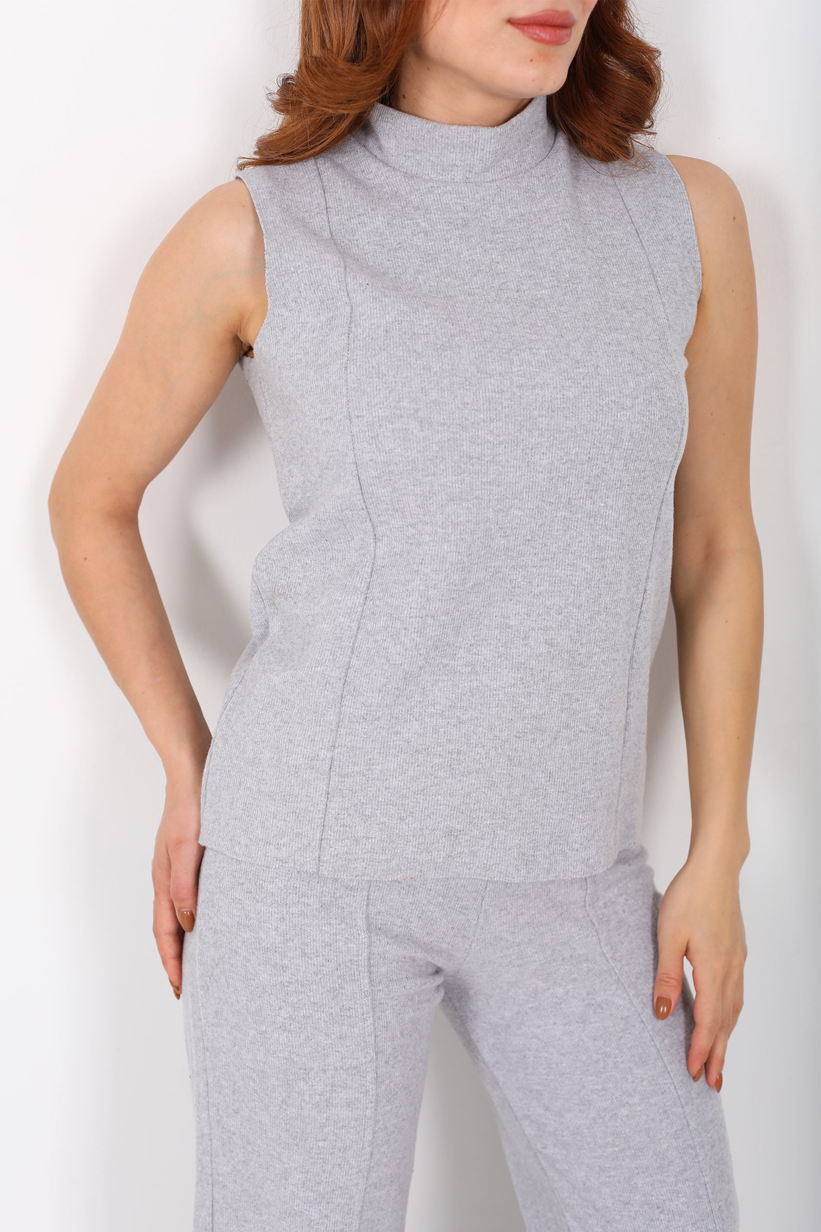 Kolsuz Dik Yaka Gri Melanj Kadın Fitilli Takım