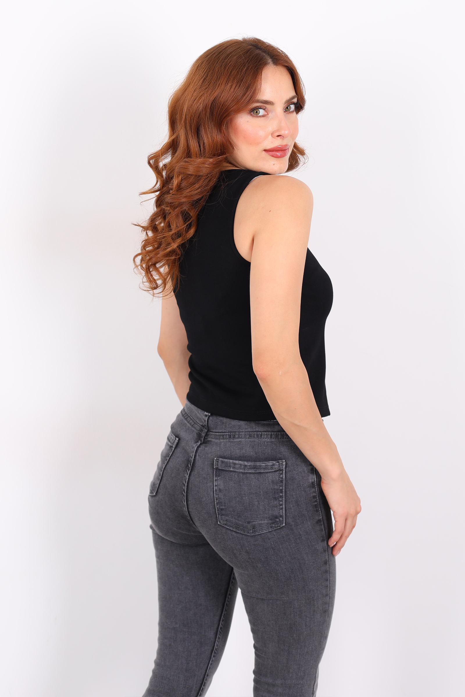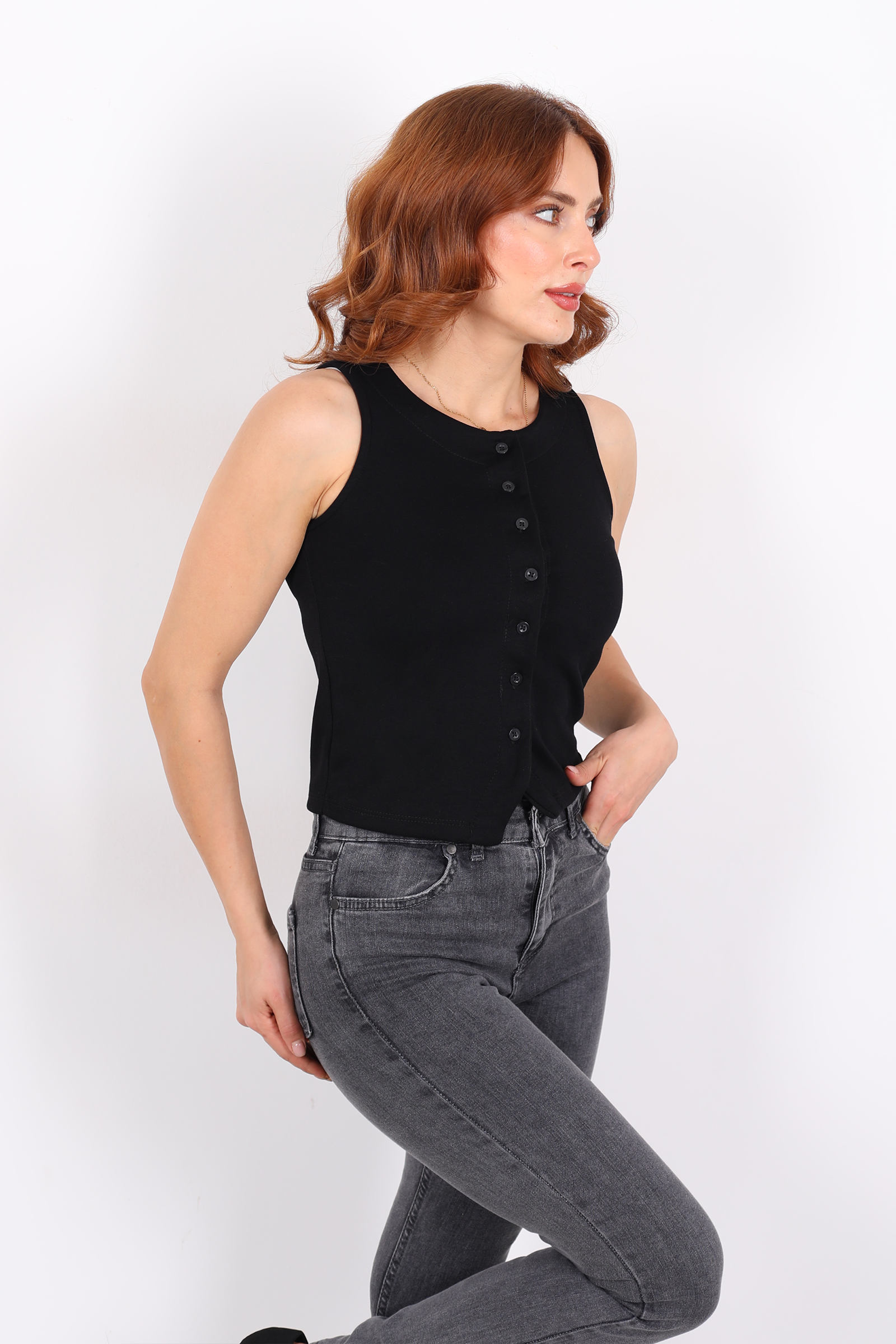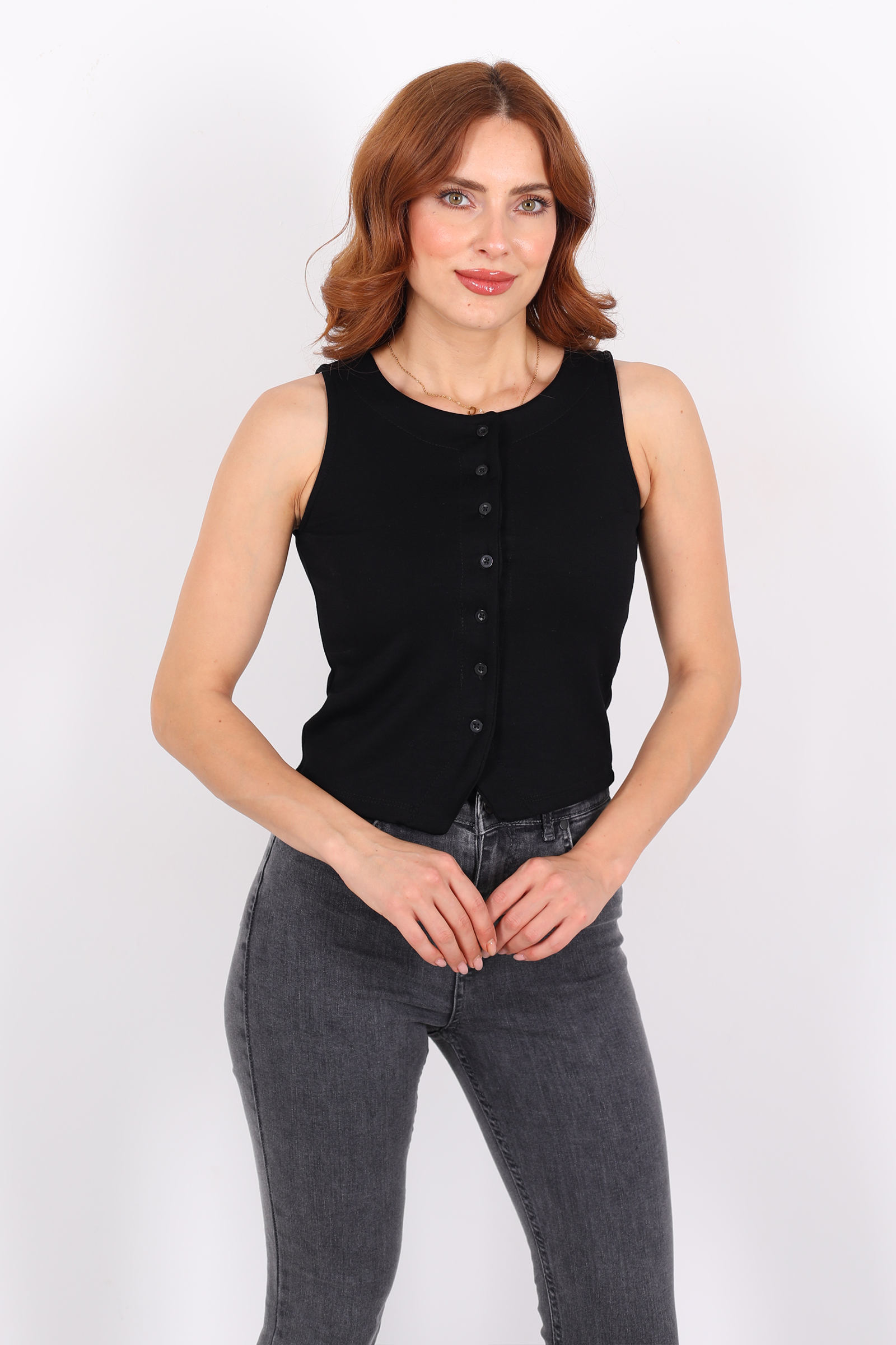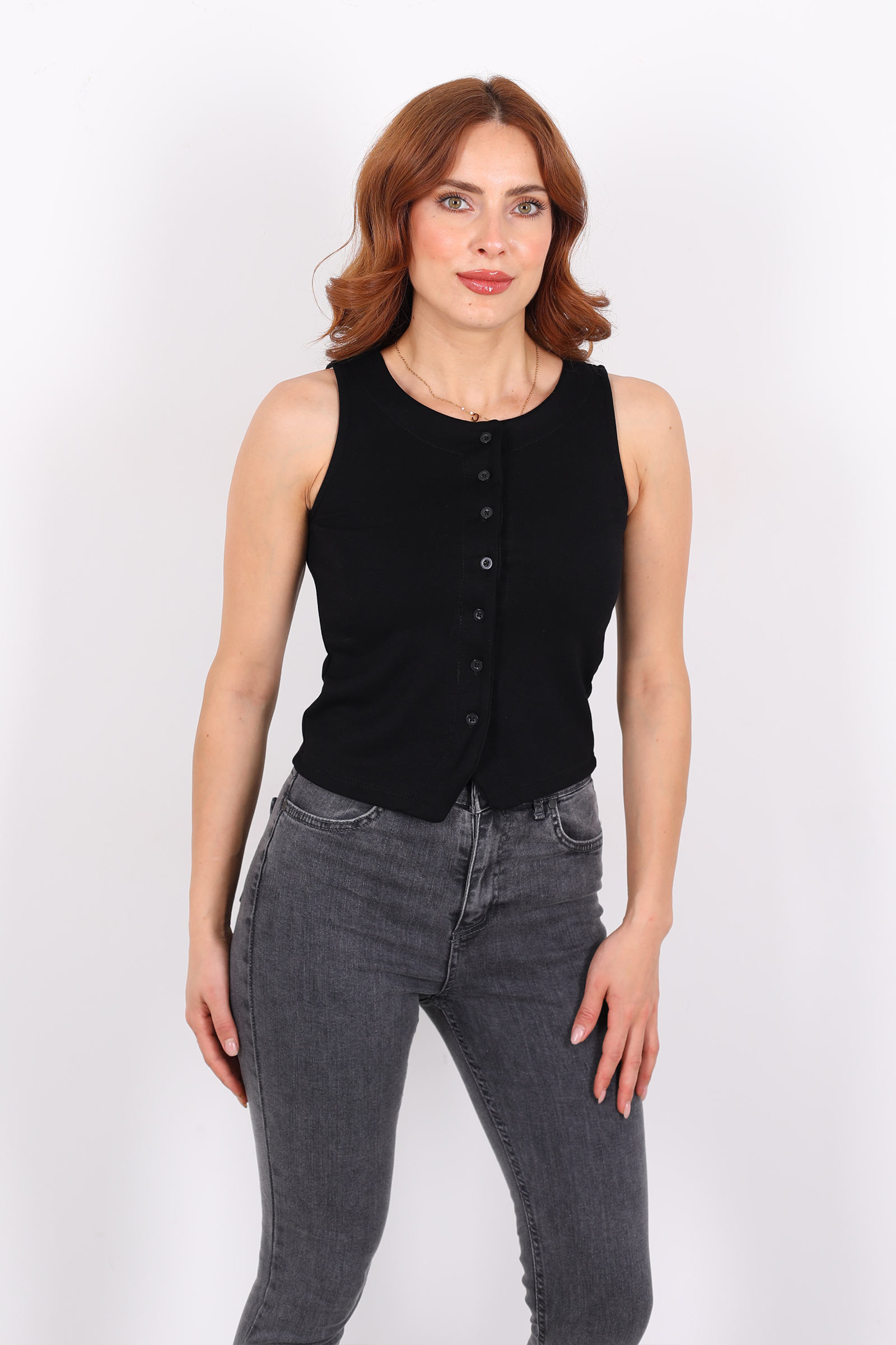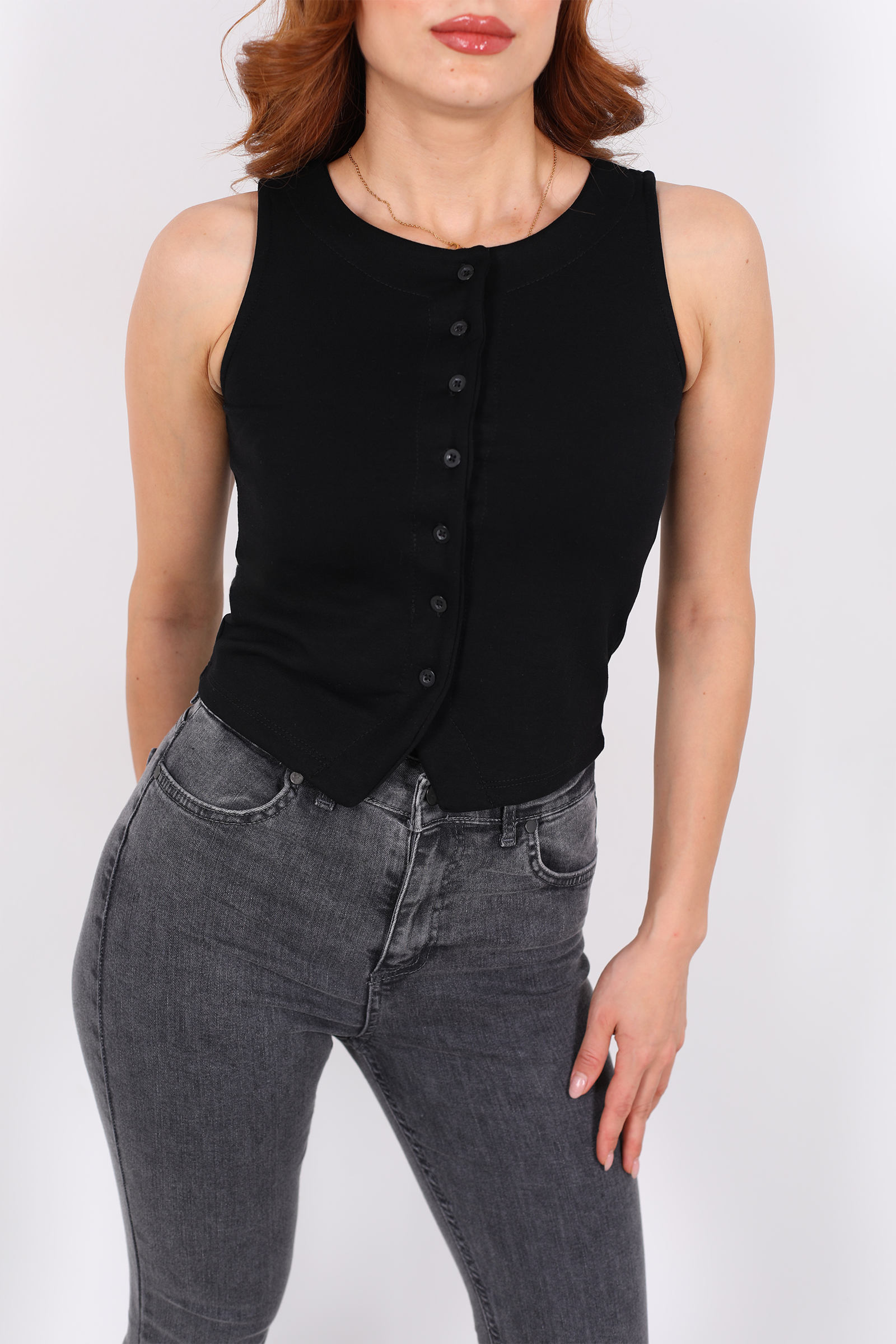 Zarif ve feminen bir duruş sunan kolsuz, düğmeli siyah modal yelek, minimal tasarımı ve yumuşak dokusuyla dikkat çekiyor. Modal kumaşın nefes alabilen yapısı, sıcak günlerde bile konfor sağlar; düğmeli front detayı ise stilinize hoş bir detay katar.