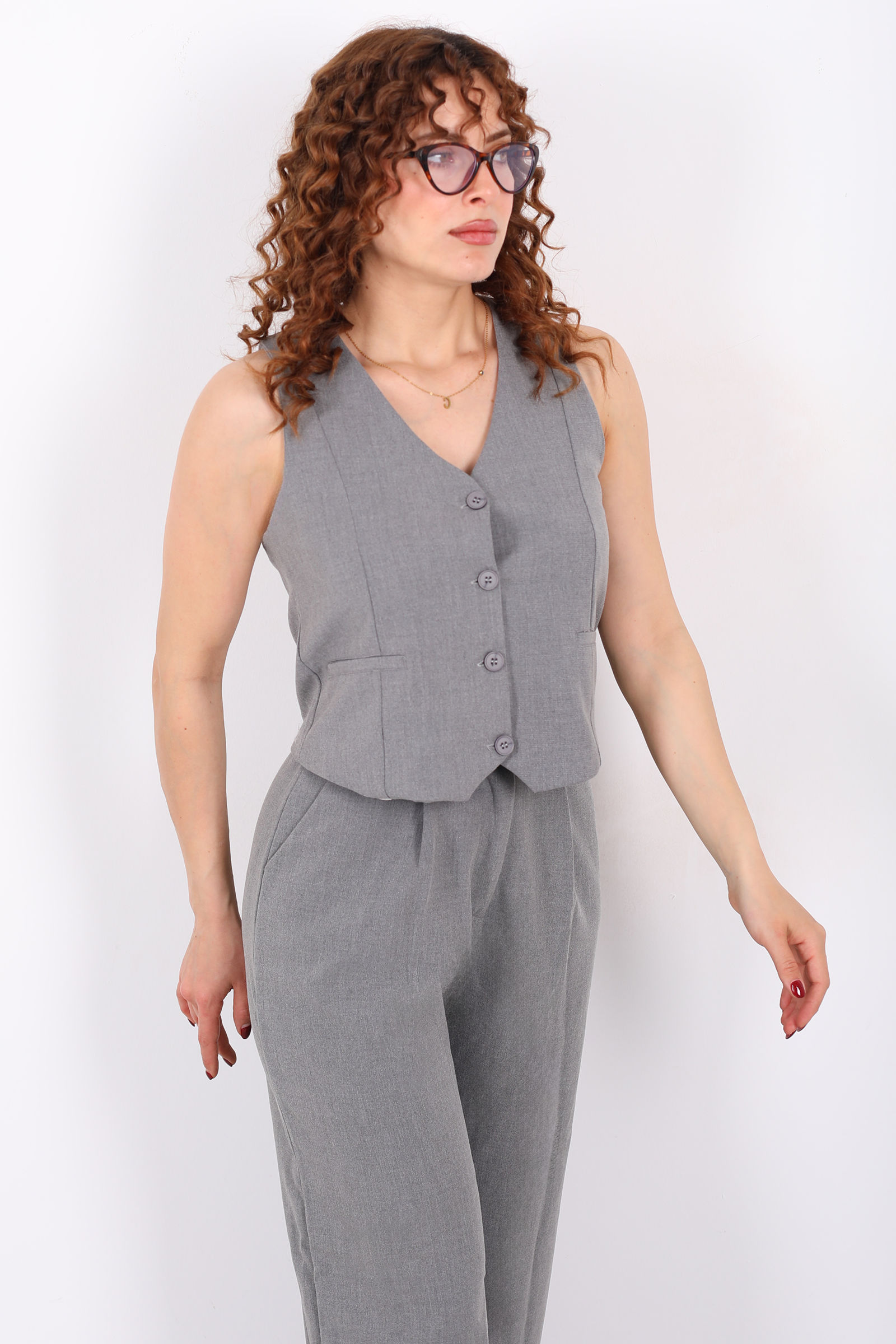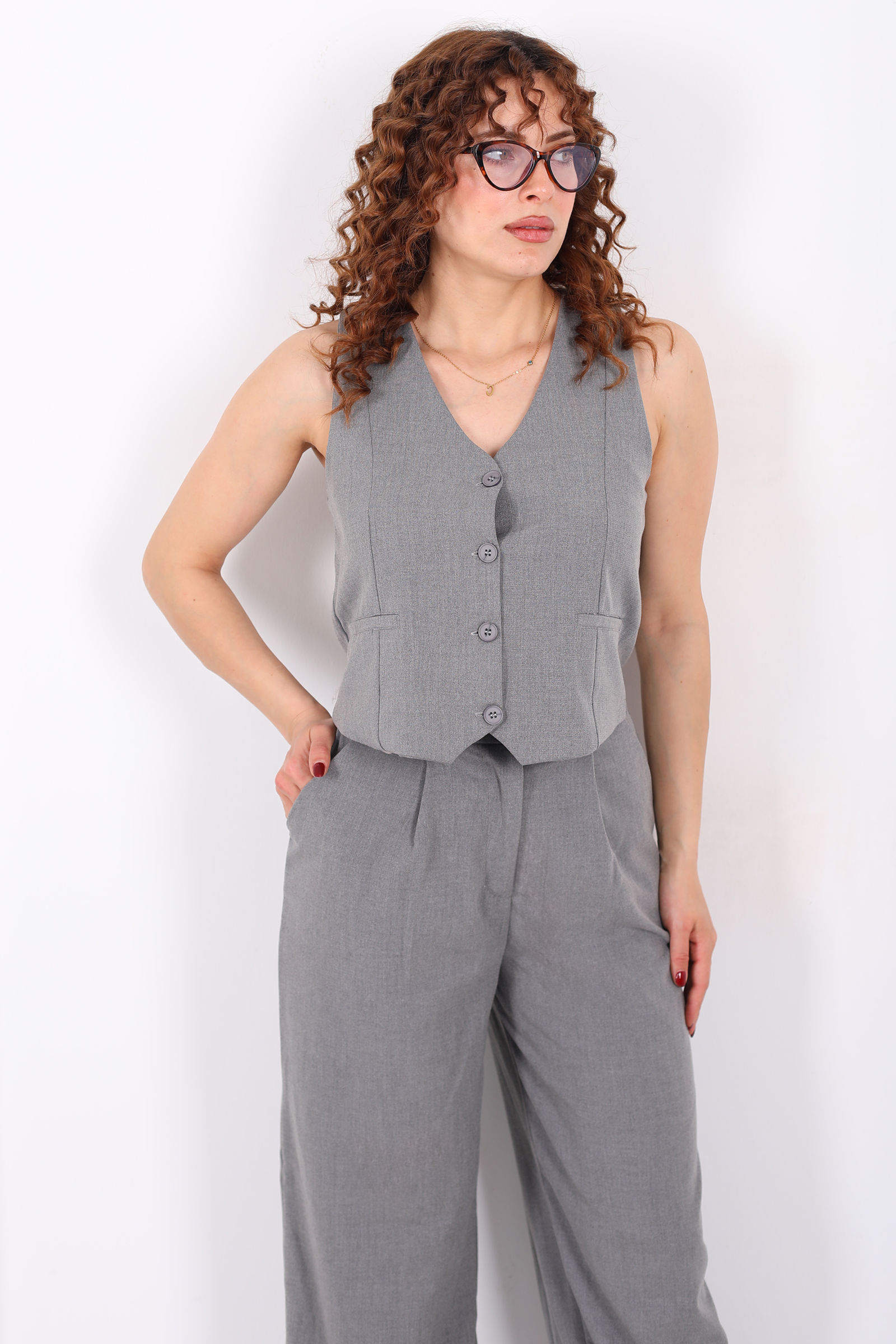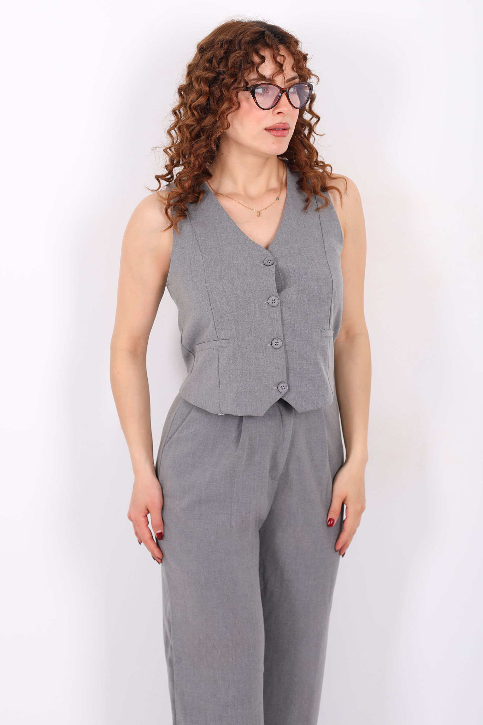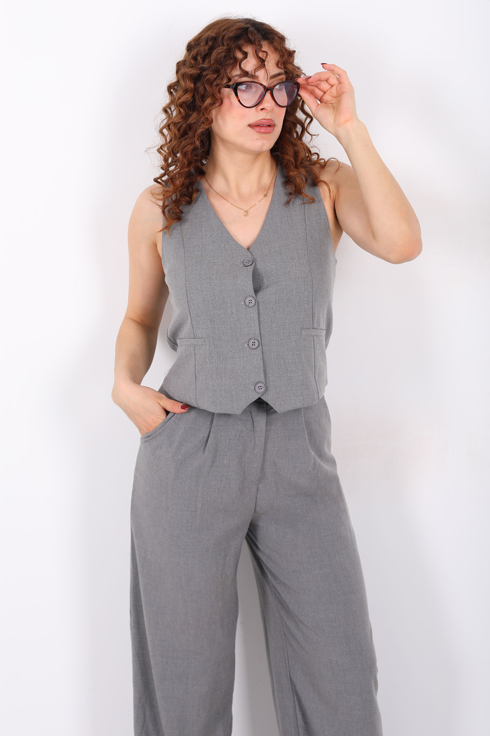 Keten Görünümlü Düğmeli Antrasit Kadın Yelek