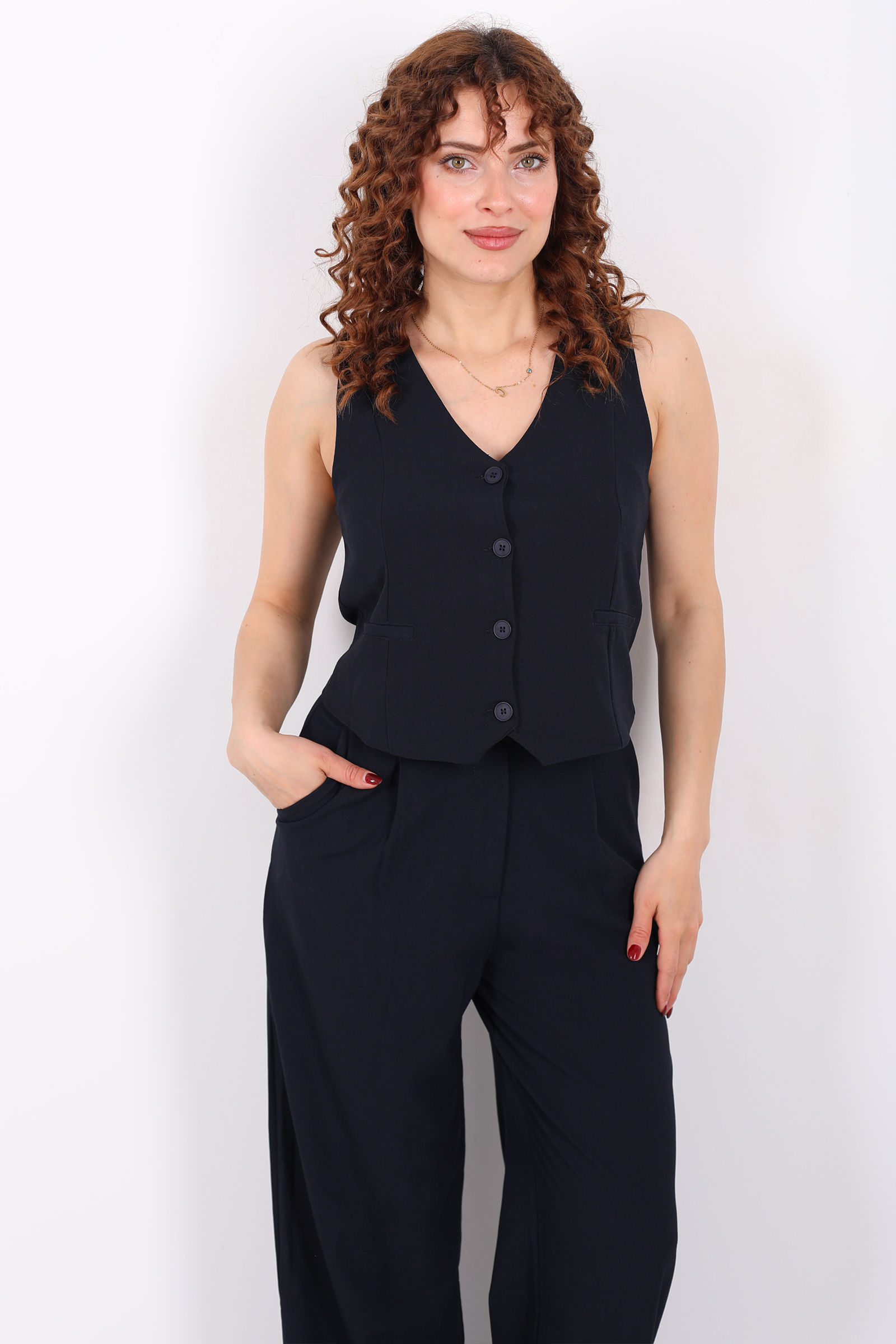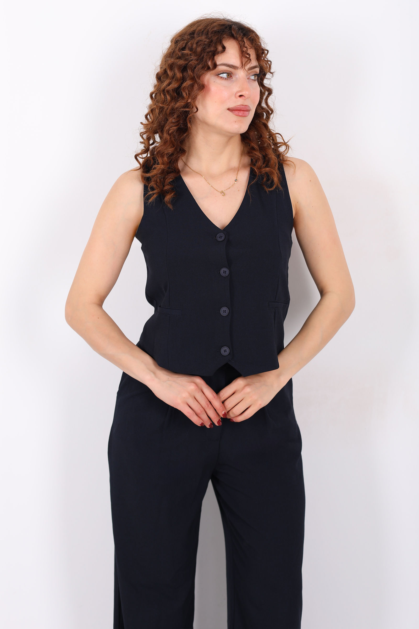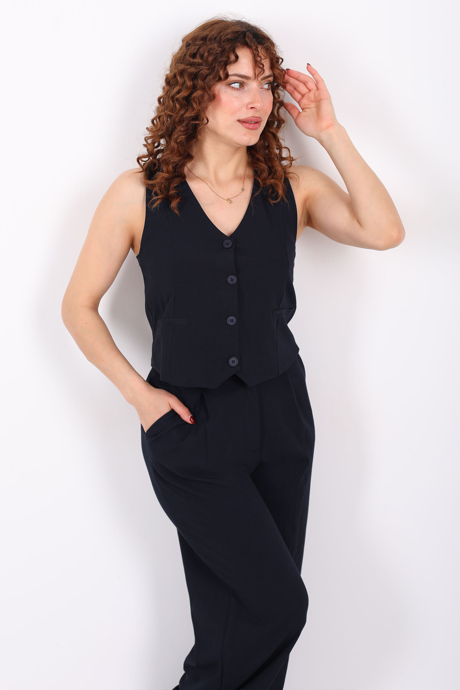 Keten Görünümlü Düğmeli Siyah Kadın Yelek