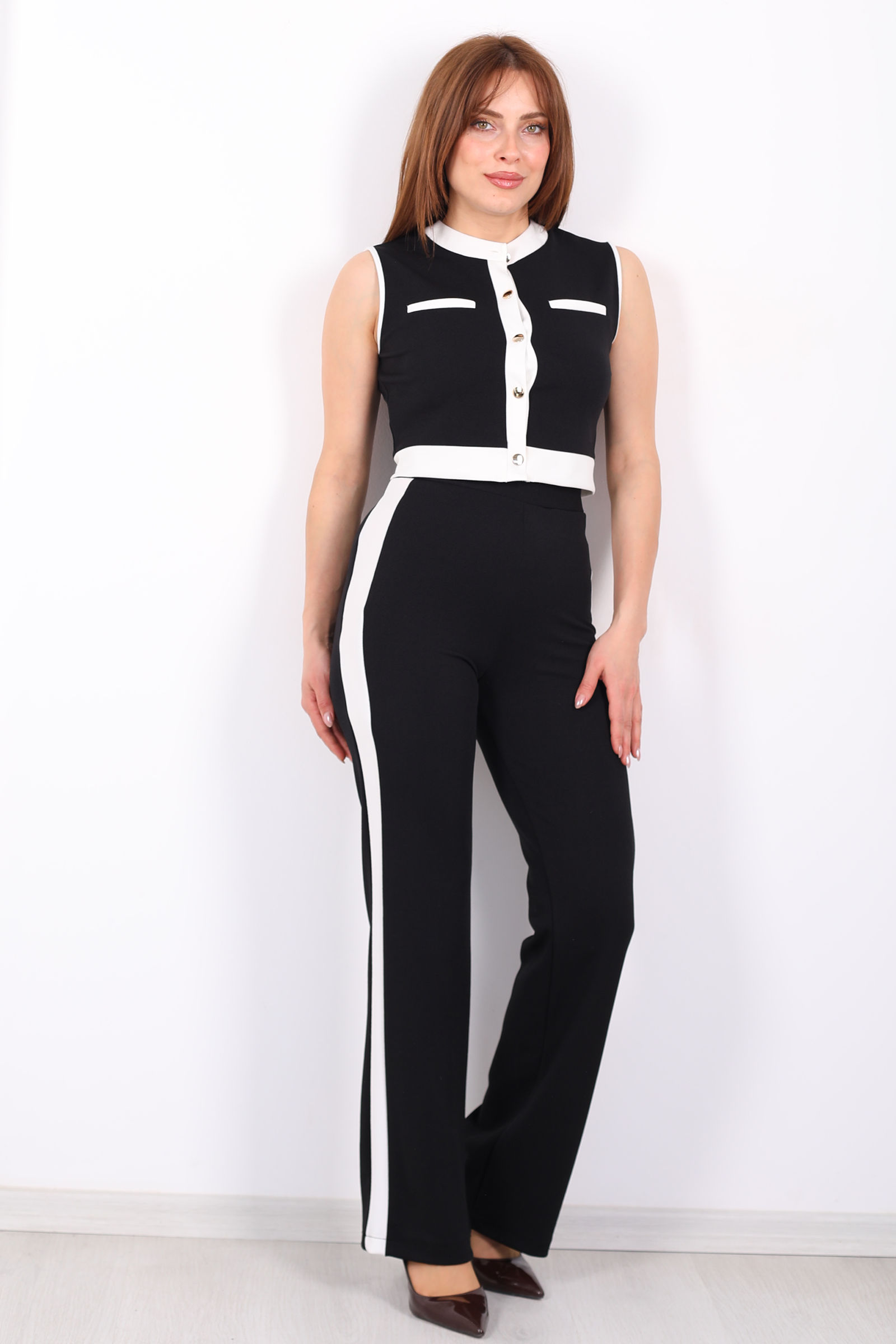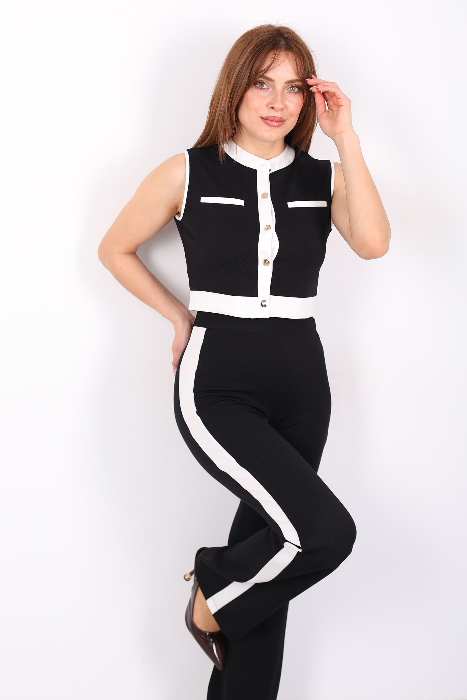 Siyah kolsuz garnılı düğmeli Venedik takım, modern tasarımı ve zarif detaylarıyla her stilin vazgeçilmezi olacak. Garnı detaylar, takıma sofistike bir hava katarken, düğme detayları şıklığına şıklık ekler. Hafif ve rahat kumaşı, sıcak günlerde konfor sağlarken, siyah renginin zamansız şıklığı her ten rengine uyum sağlar. Takım, hem gündüz hem de gece kombinlerinde rahatlıkla kullanılabilir ve her ortamda şıklığınızı ön plana çıkarır. Şık ve modern tasarımıyla, günlük stilinizde ya da özel davetlerde rahatça tercih edebilirsiniz.