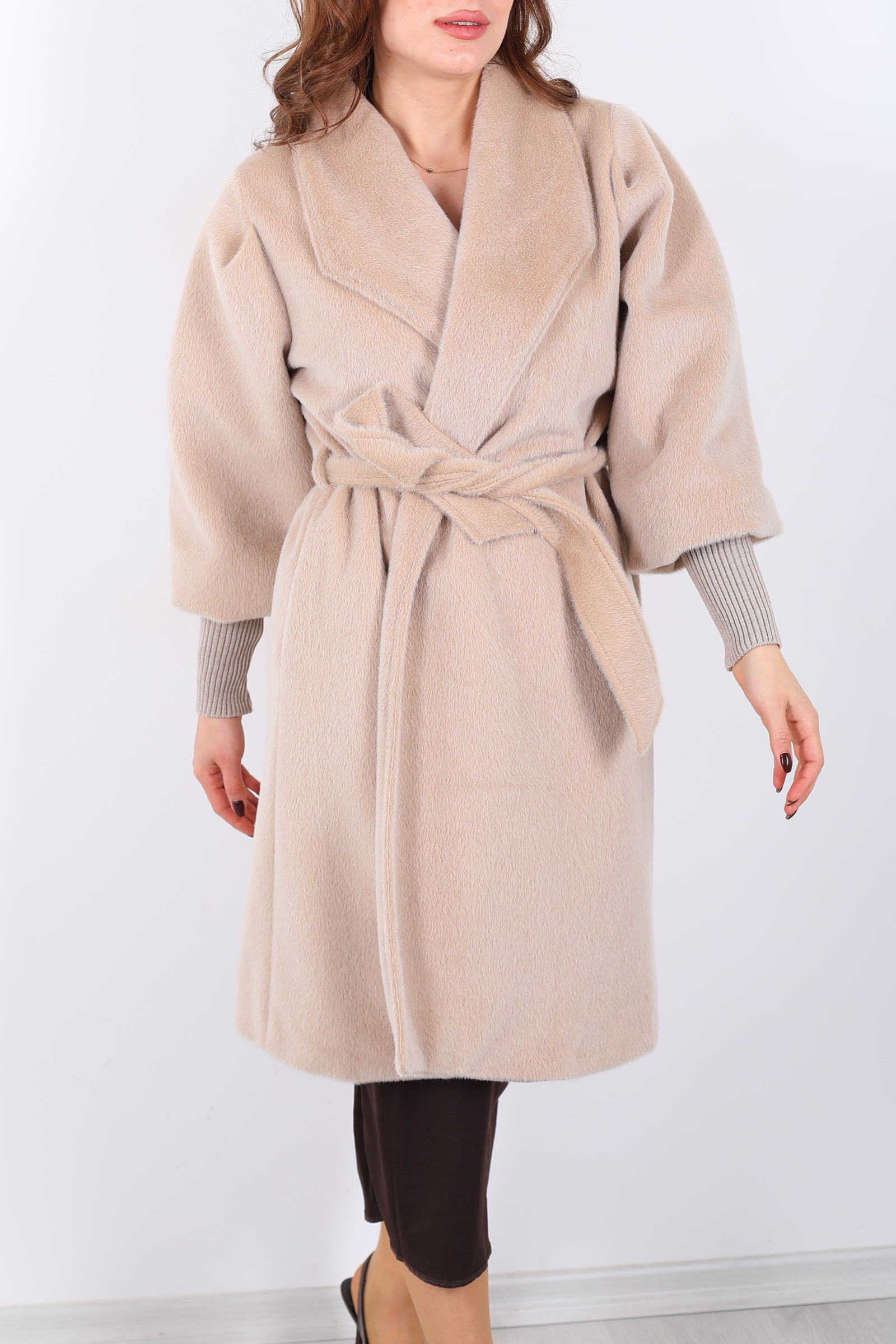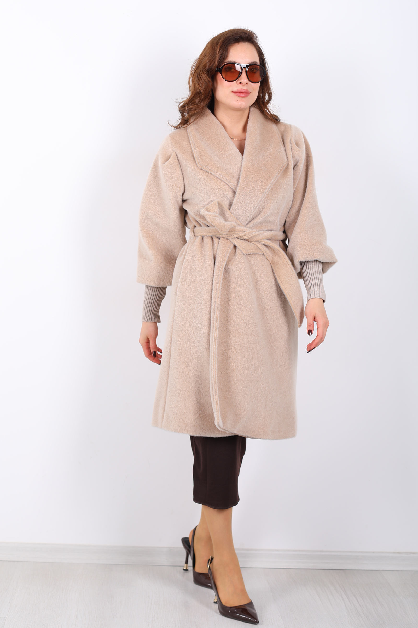 Kolu Ribanalı Kuşaklı Bej Kadın Kaban