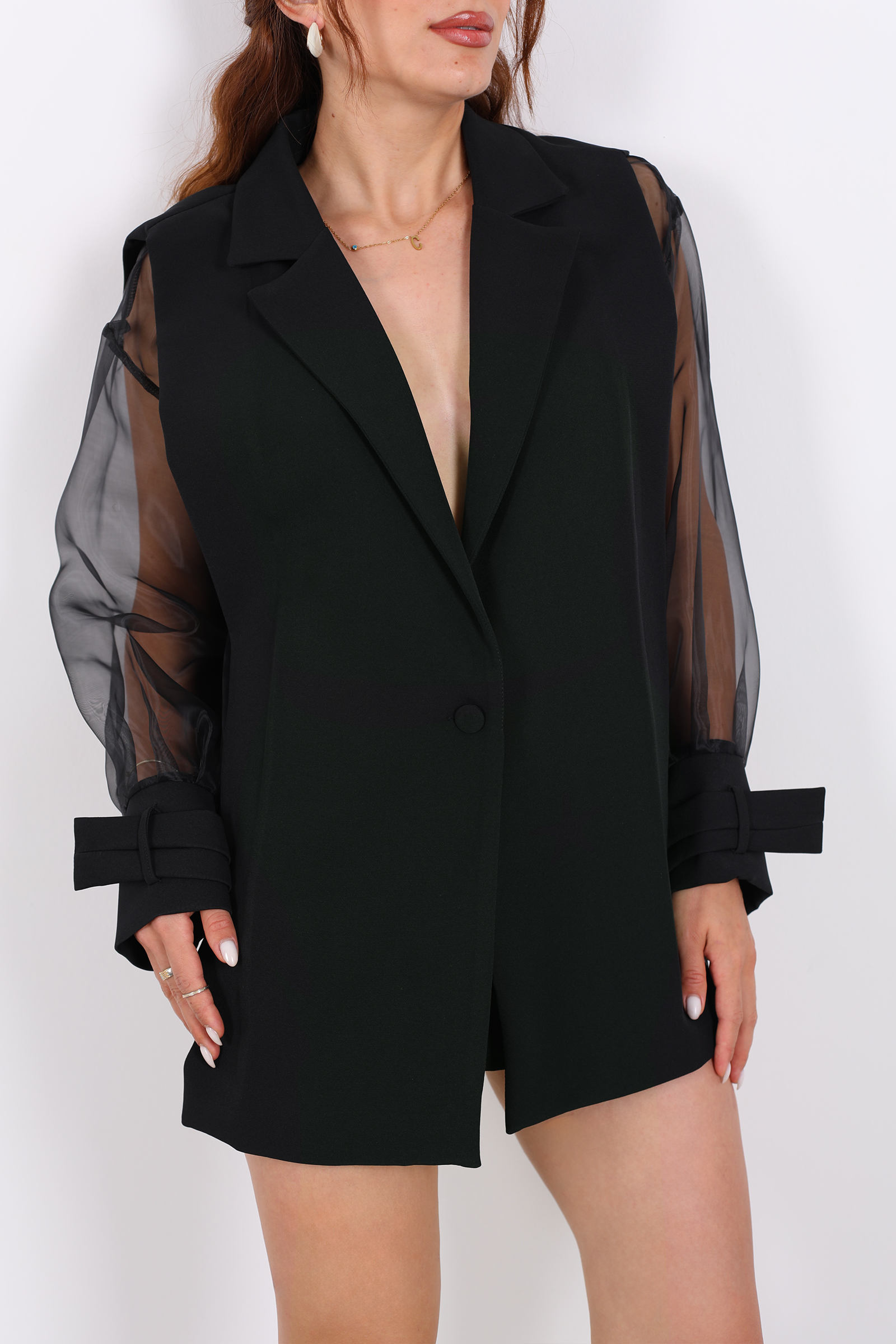 Kolu Şifon Siyah Kadın Blazer Ceket, klasik blazer şıklığını modern dokunuşlarla buluşturan zarif bir tasarımdır. Siyahın asaletiyle birleşen şifon detaylı kolları, cekete feminen bir hava katarak stilinizi ön plana çıkarır. Normal kalıp yapısı ve dokuma şifon kumaşı sayesinde hem günlük hem de şık davetlerde rahatlıkla tercih edilebilir.