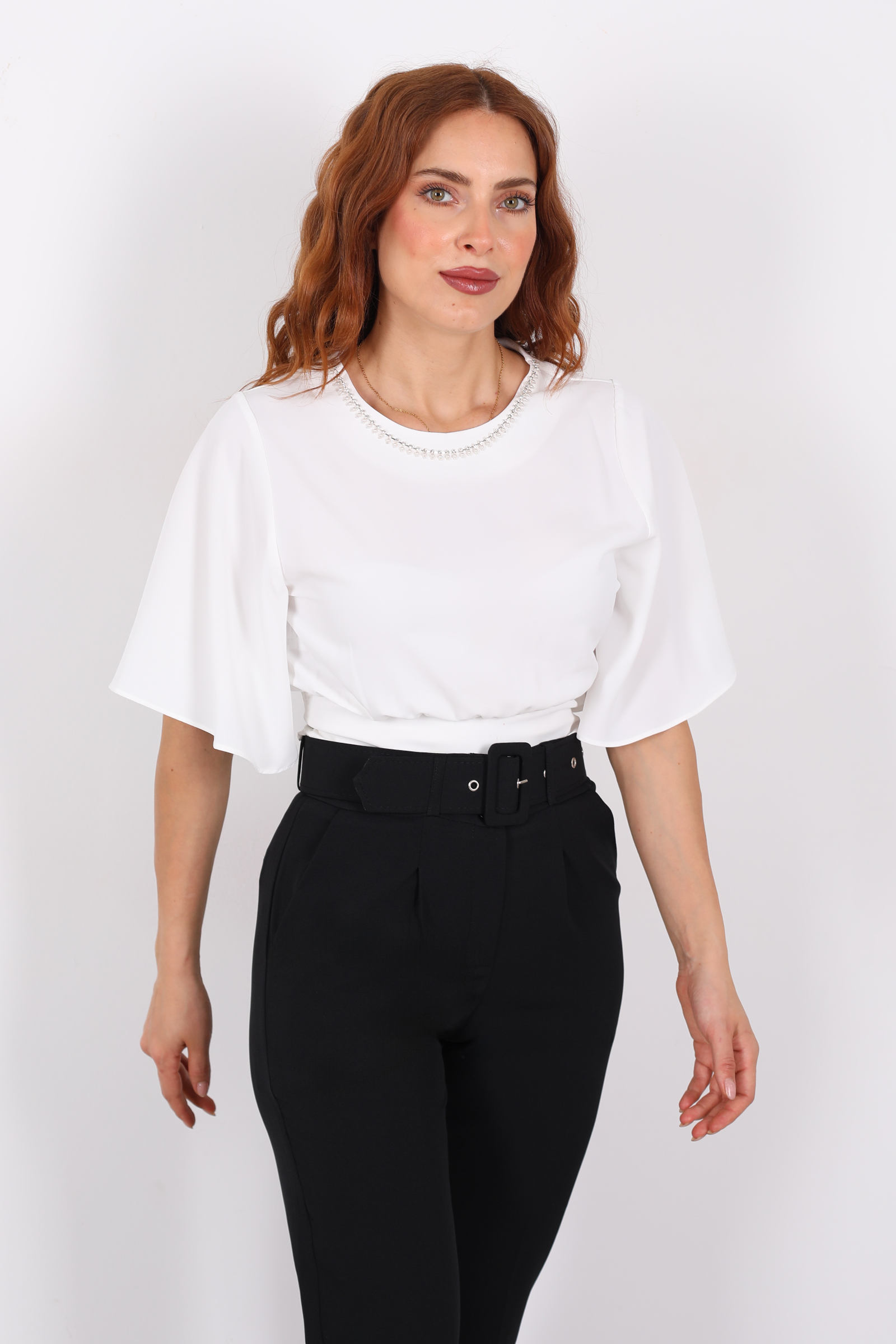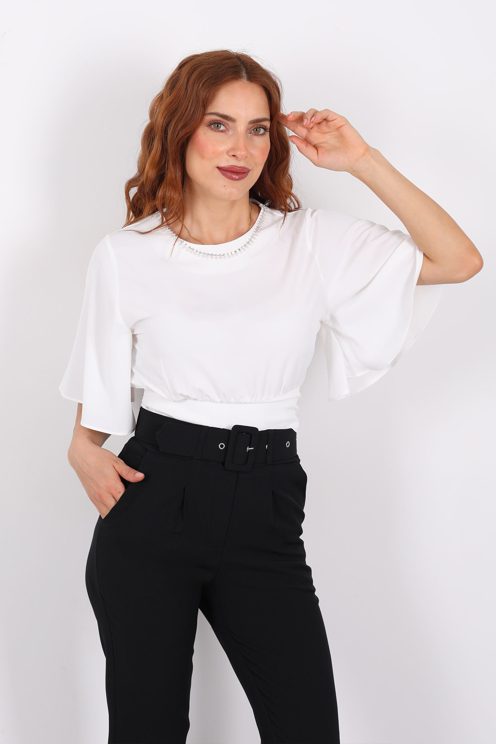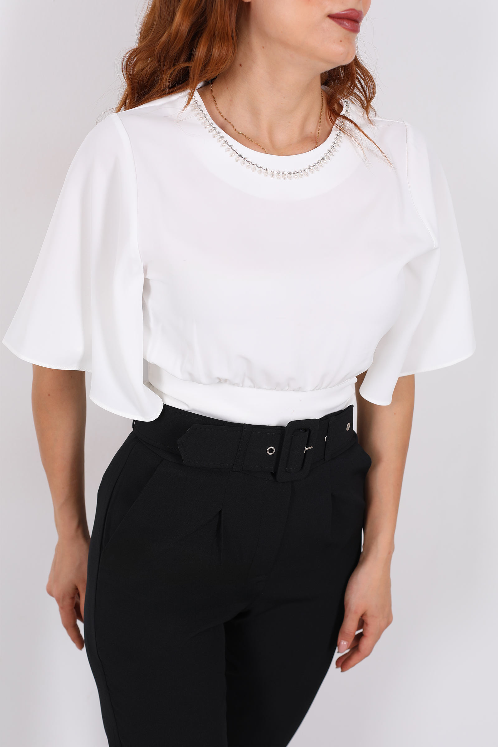 Beyaz saten bluz, zarafeti ve yumuşak parlaklığıyla ışığı nazikçe yansıtarak feminen bir duruş kazanıyor. Saten kumaş, ipeklik hissi veren dokusuyla öne çıkar; bu dokuma biçimi, ipliklerin özel şekilde “float” edilmesiyle parlak ve akıcı bir yüzey sağlar.Kolye detayı, bluzun yakasında zarif bir vurgu oluşturur. İnce, metalik veya inci görünümlü bir zincir veya kolye benzeri aksesuar, bluzun sade zarafetini daha da güçlendirir ve boyun hattına dikkat çekici bir estetik katmanı ekler.