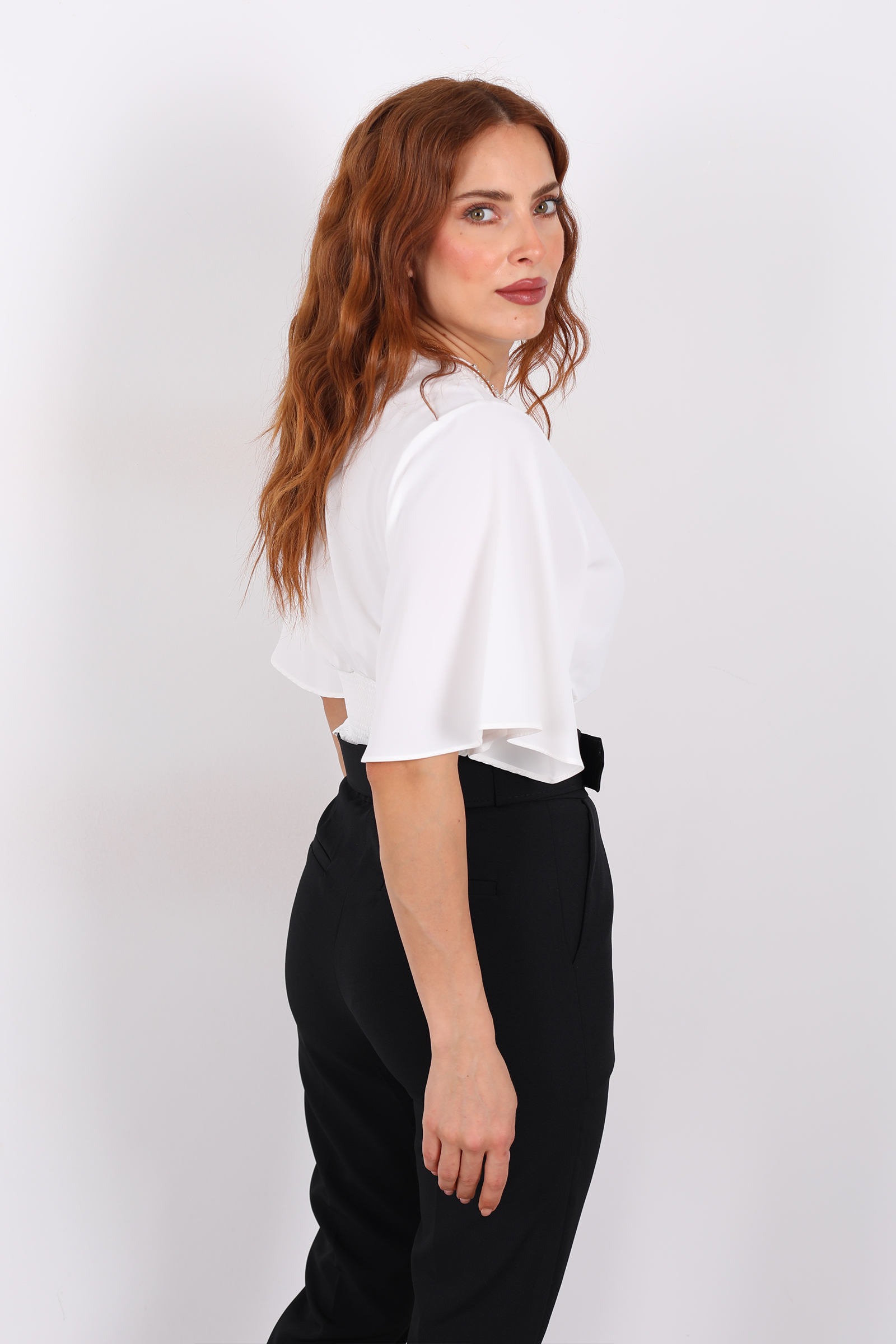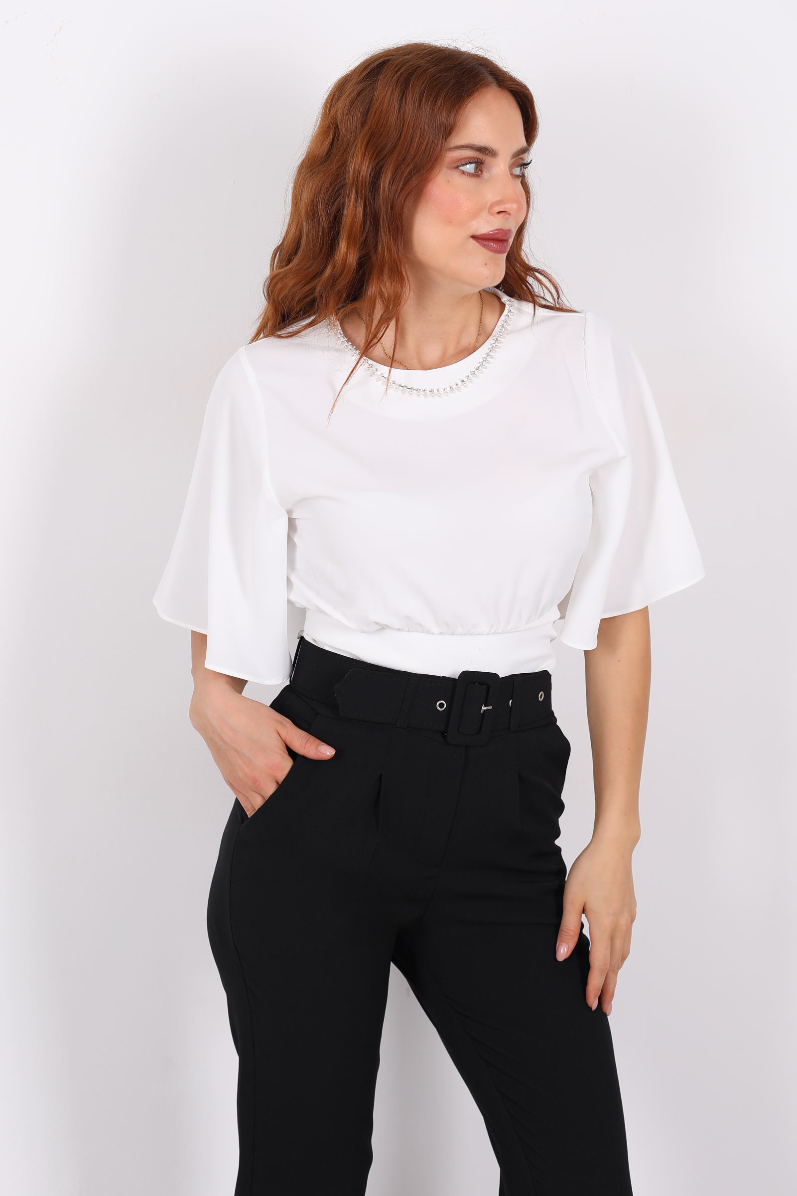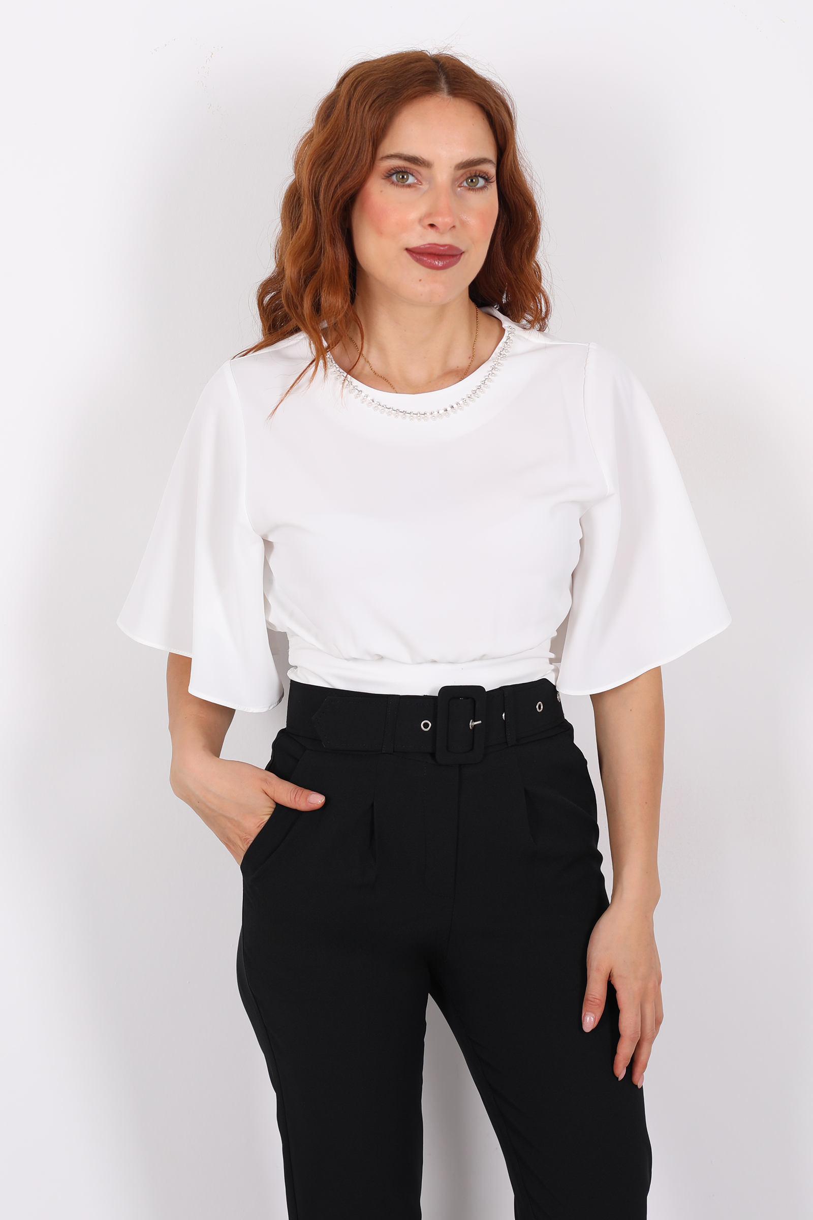Beyaz saten bluz, zarafeti ve yumuşak parlaklığıyla ışığı nazikçe yansıtarak feminen bir duruş kazanıyor. Saten kumaş, ipeklik hissi veren dokusuyla öne çıkar; bu dokuma biçimi, ipliklerin özel şekilde “float” edilmesiyle parlak ve akıcı bir yüzey sağlar.Kolye detayı, bluzun yakasında zarif bir vurgu oluşturur. İnce, metalik veya inci görünümlü bir zincir veya kolye benzeri aksesuar, bluzun sade zarafetini daha da güçlendirir ve boyun hattına dikkat çekici bir estetik katmanı ekler.