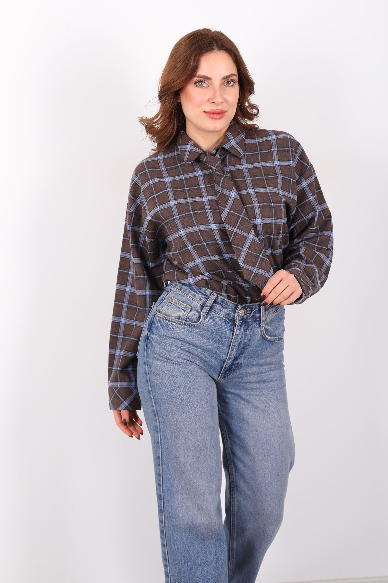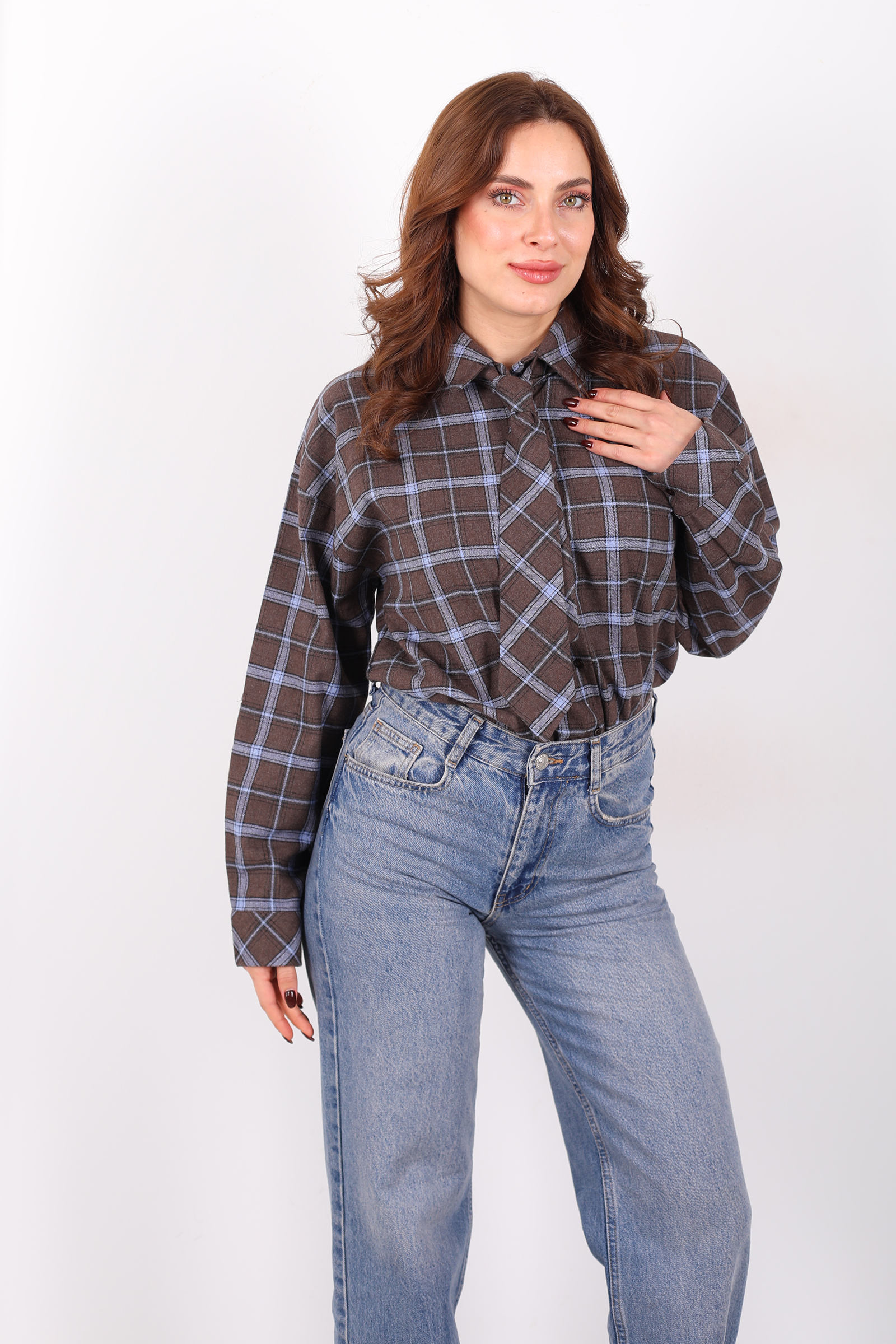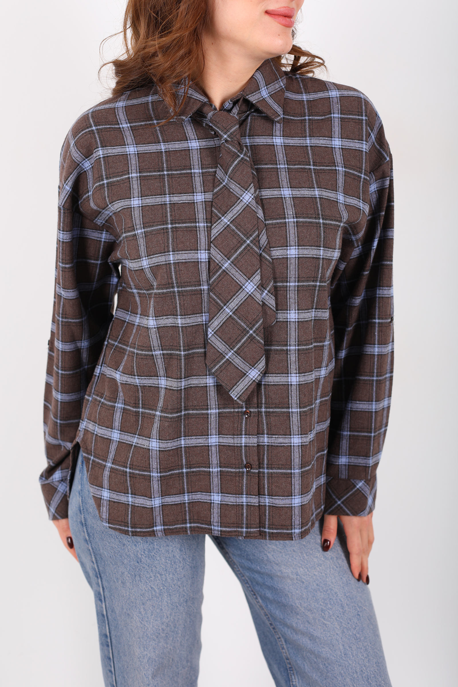Kravatlı Ekose Kahverengi Kadın Gömlek
