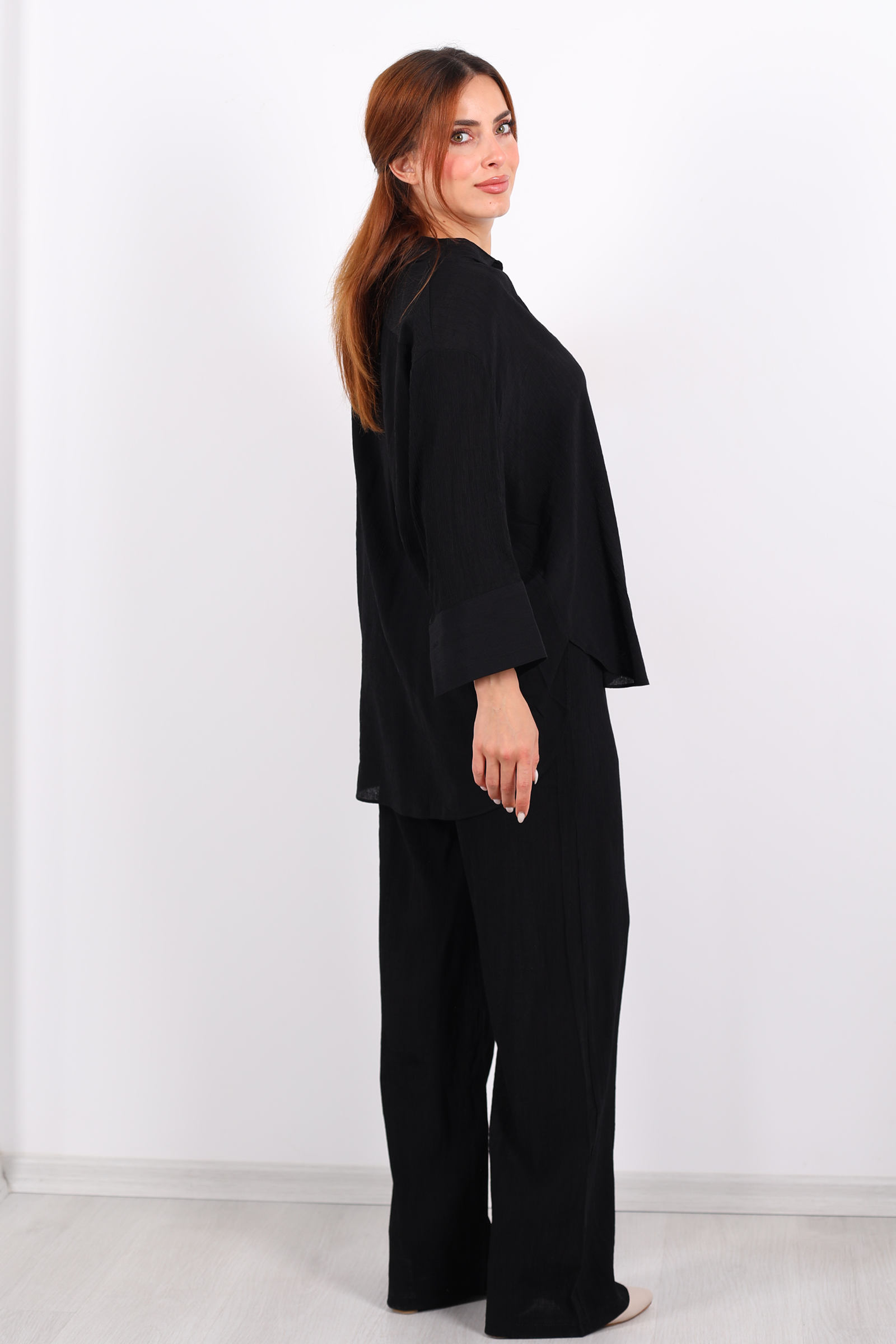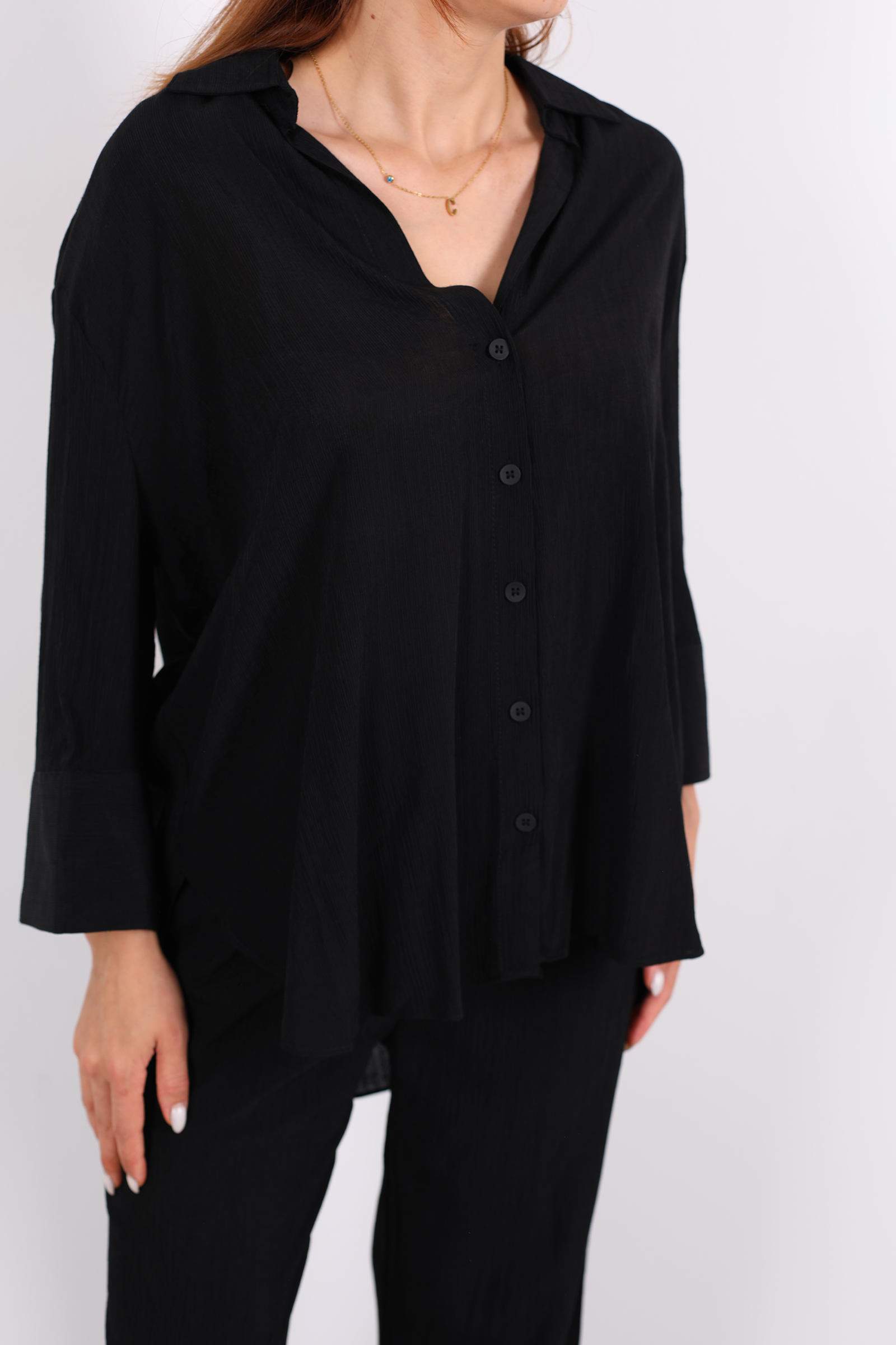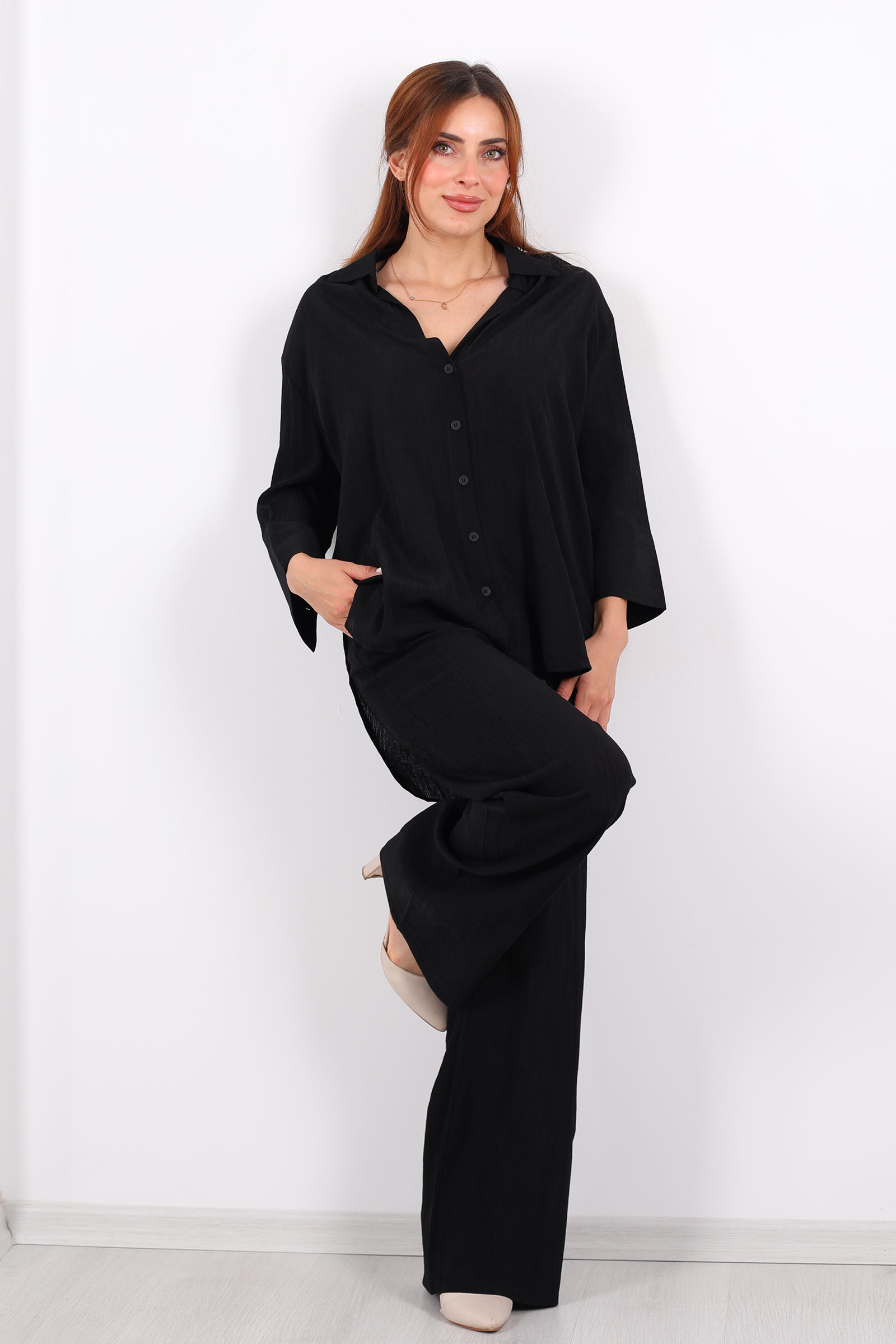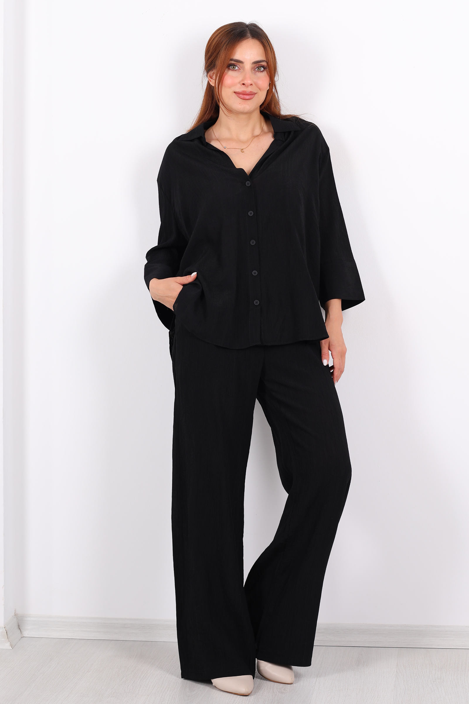 Bu siyah krinkıl kadın takımı, oversize gömlek ve pantolon kombinasyonu ile şıklığı ve rahatlığı bir arada sunuyor. Krinkıl kumaşın hafif dokusu, vücuda oturmadan rahatça düşen kesimiyle gün boyu konfor sağlar. Gömlek, klasik yaka ve düğmeli tasarımıyla zarif bir görünüm sunarken, pantolon geniş paça kesimiyle modern ve rahat bir stil oluşturur.