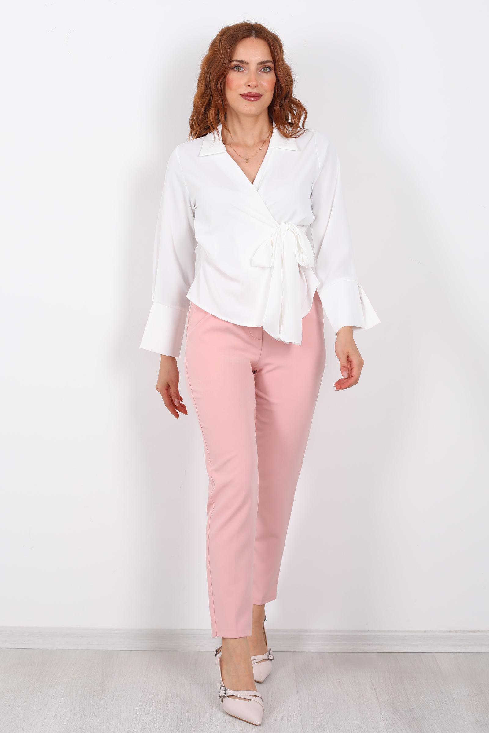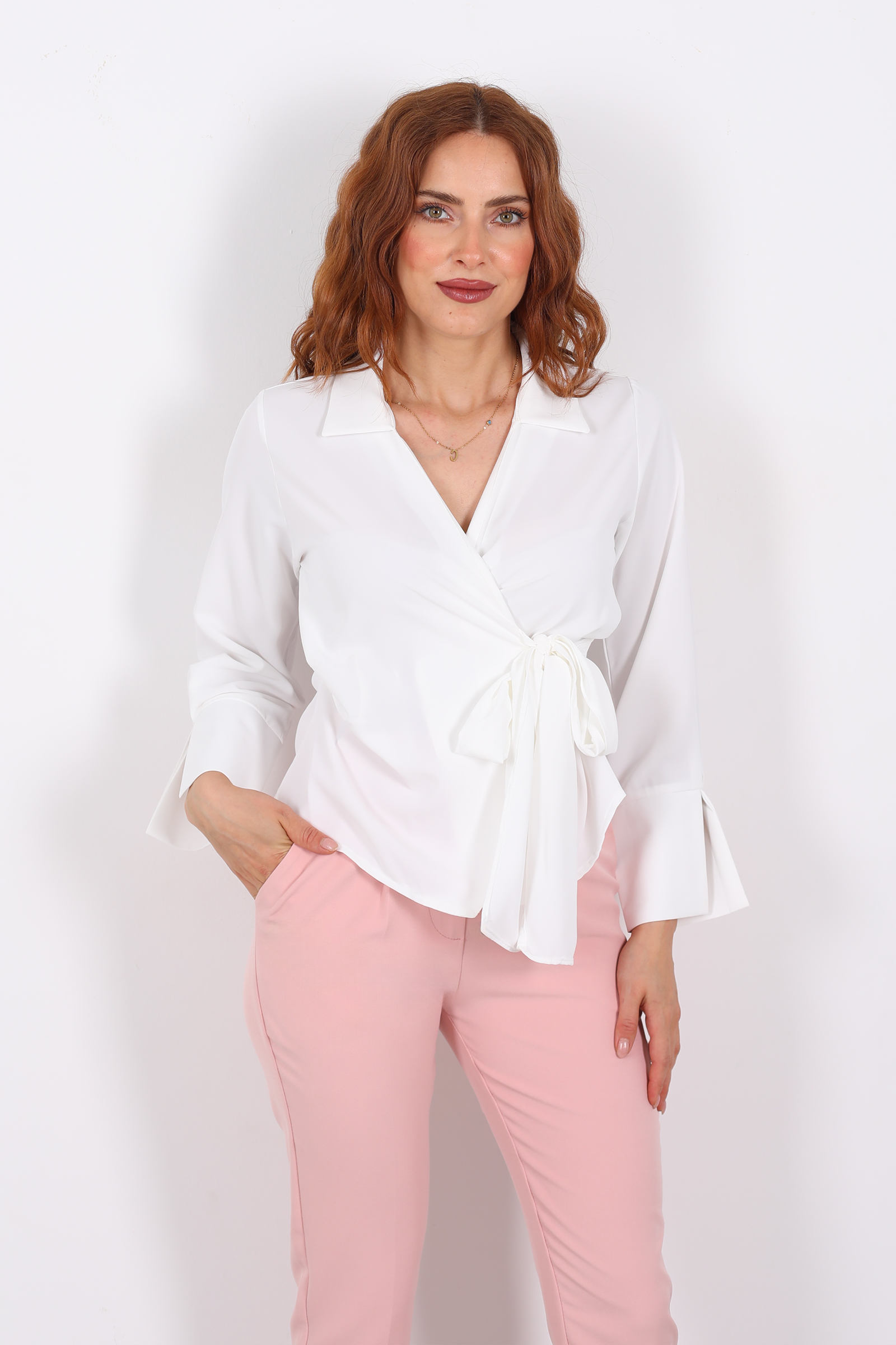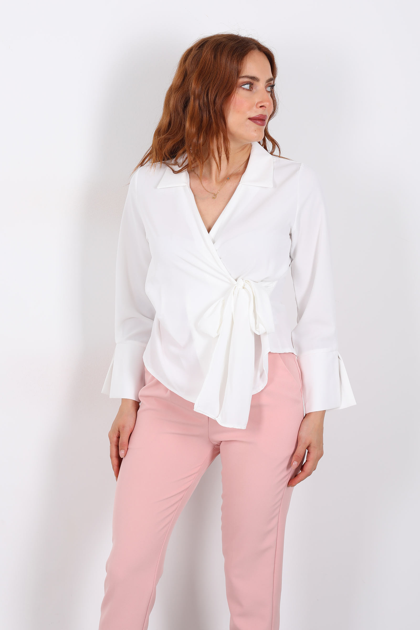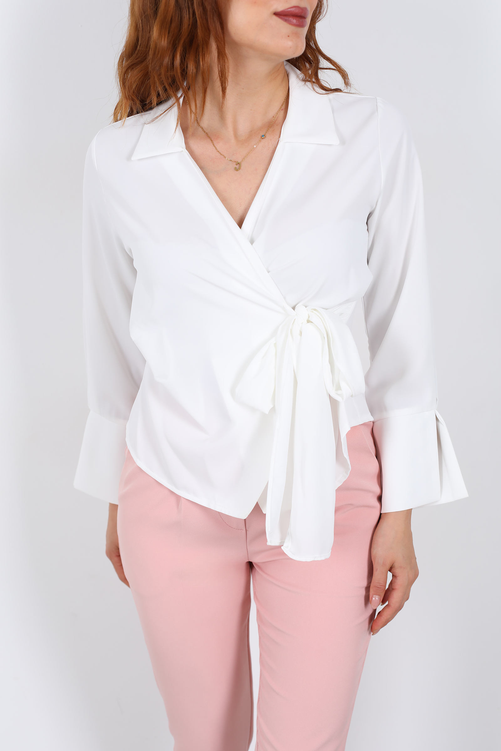 Saflığın zarafetiyle parlayan bir zarafet parçası… Bu beyaz saten gömlek, kruvaze yaka ve bağlama detayıyla kadınsı bir duruş sunuyor. Işıkta zarifçe yansıyan saten kumaş, hem gündüz ofiste hem de akşam buluşmalarında stilinizi vurgulayan bir dokunuş getiriyor. Bağlama detayı sayesinde vücut hatlarınızı narin bir şekilde sarar ve kullanıcısına ince bir feminenlik kazandırır.