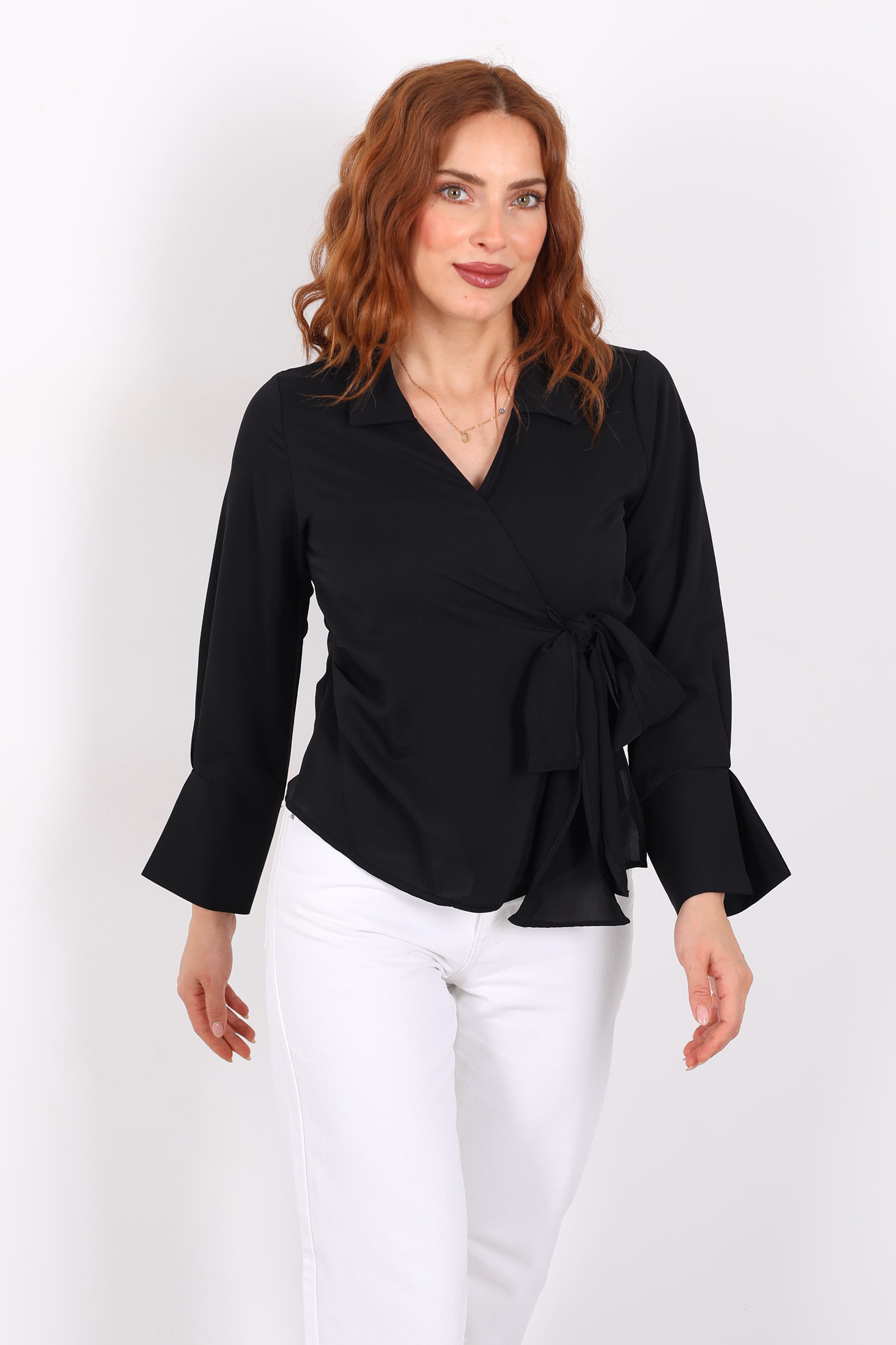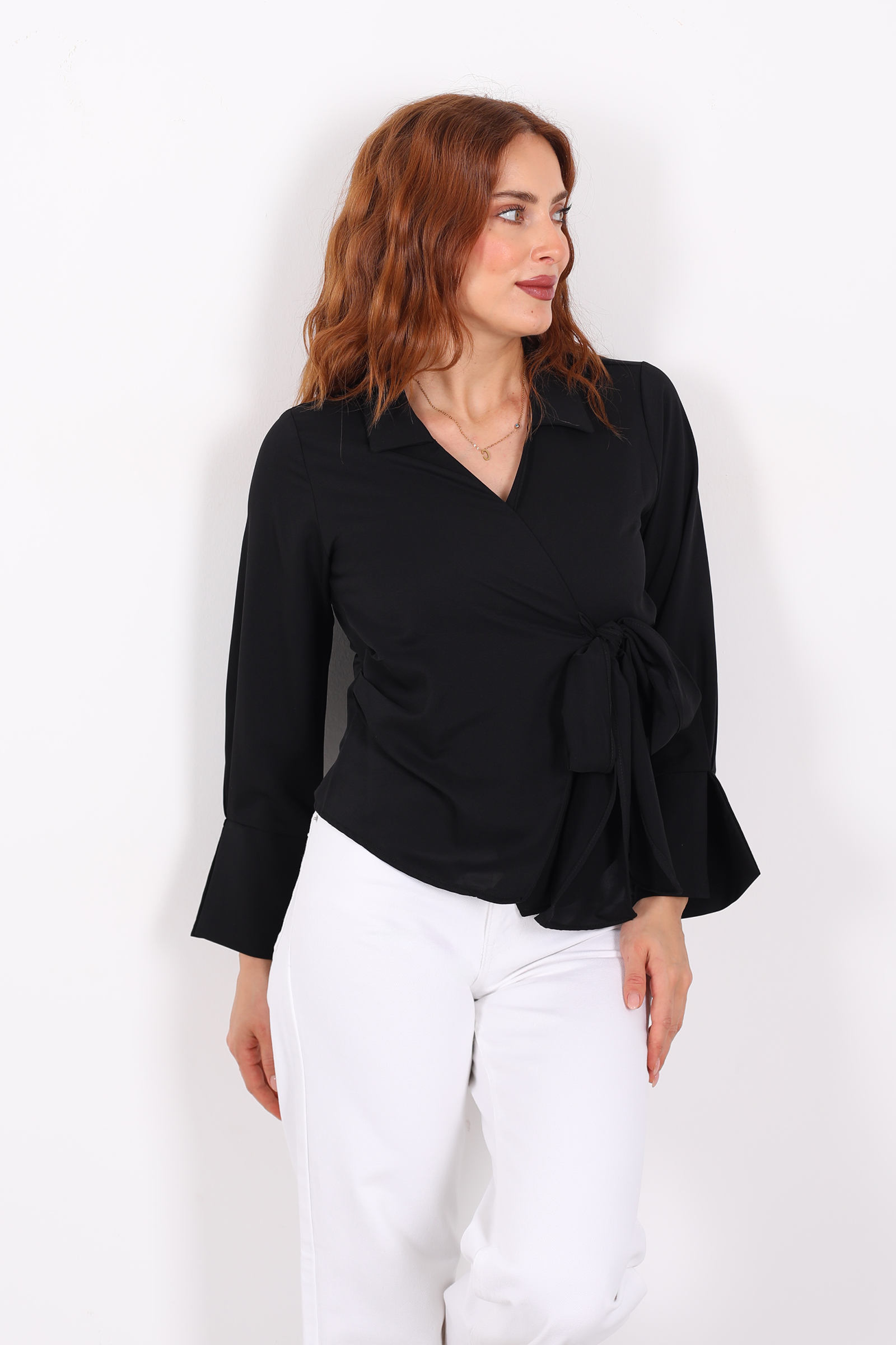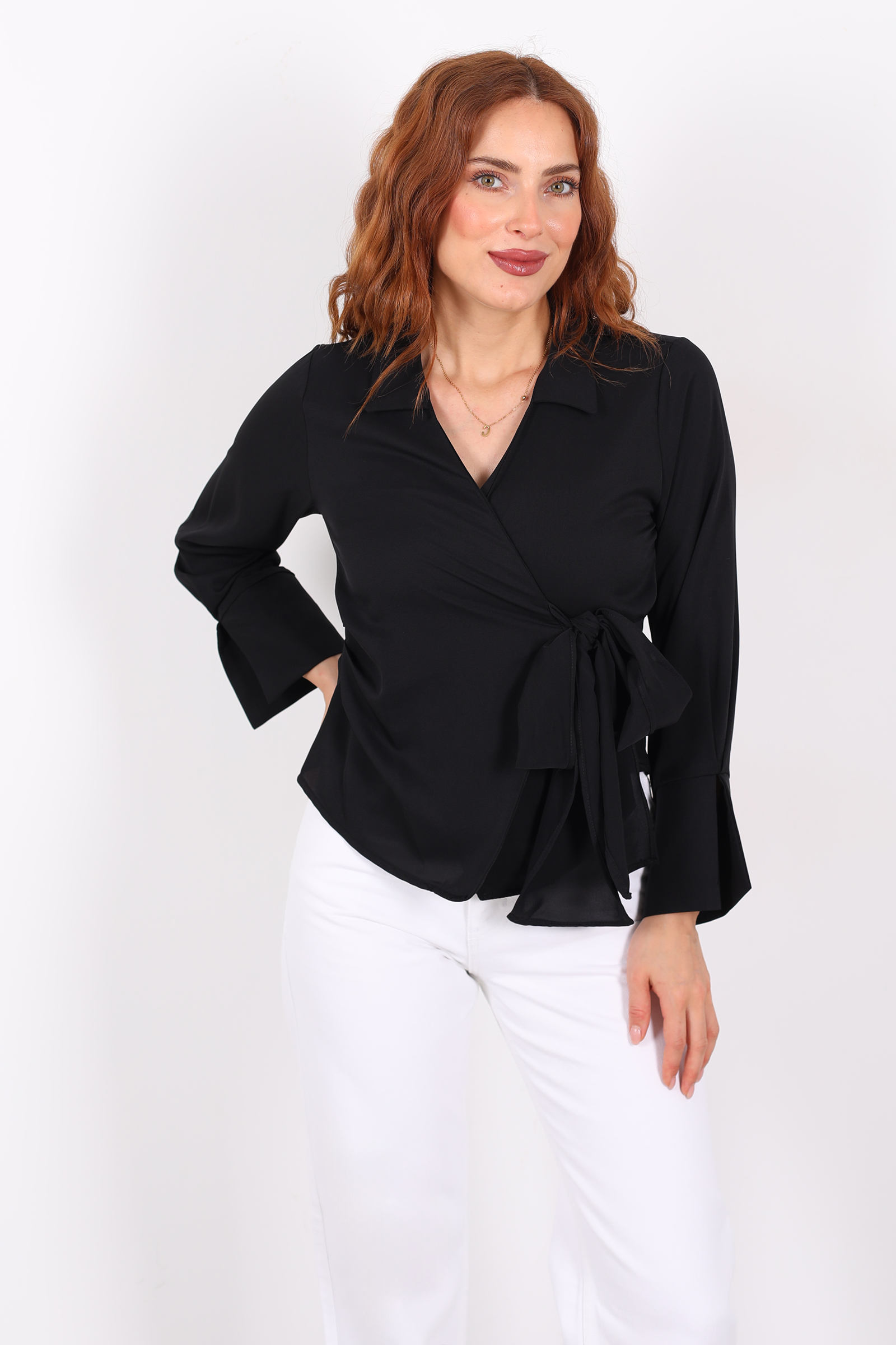 Sıcak bir gece şıklığını gündüz zarafetiyle buluşturan bu siyah saten gömlek, kruvaze bağlama detayıyla öne çıkıyor. Dökümlü saten kumaşı sayesinde ışığı adeta yakalayan bir parlaklığa sahip; vücudunuzda nazikçe akarken, bağlama detayıyla siluetinizi zarif bir şekilde vurgulamanıza yardımcı oluyor. Çok yönlü tasarımı sayesinde, hem özel davetlerde hem de iş ortamlarında rahatlıkla tercih edilebilir.