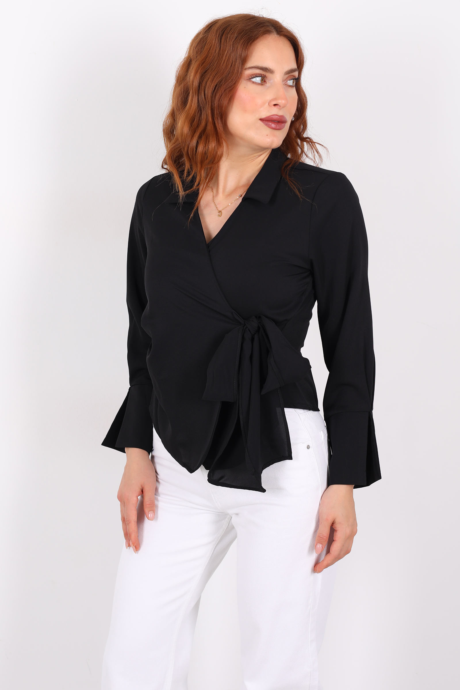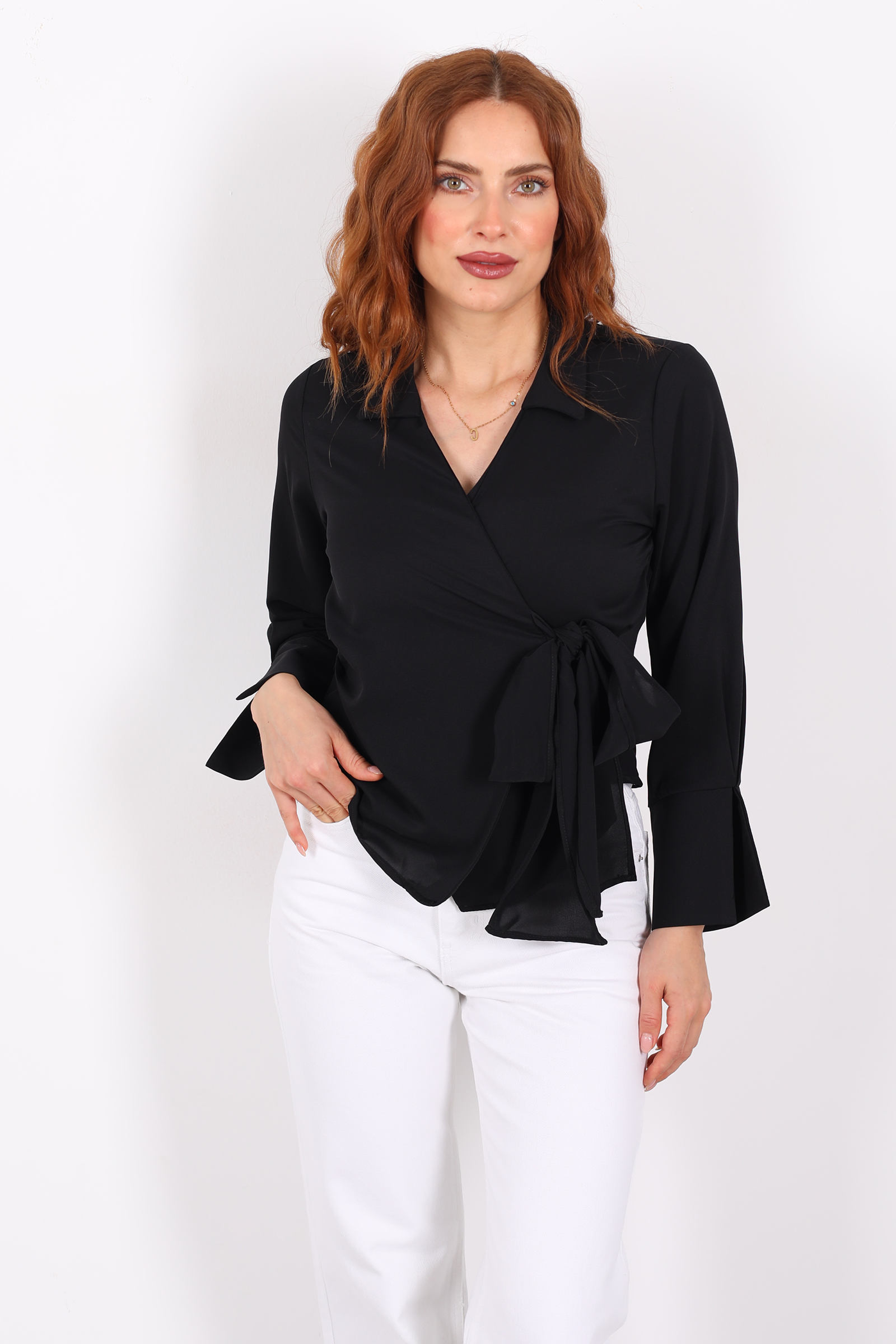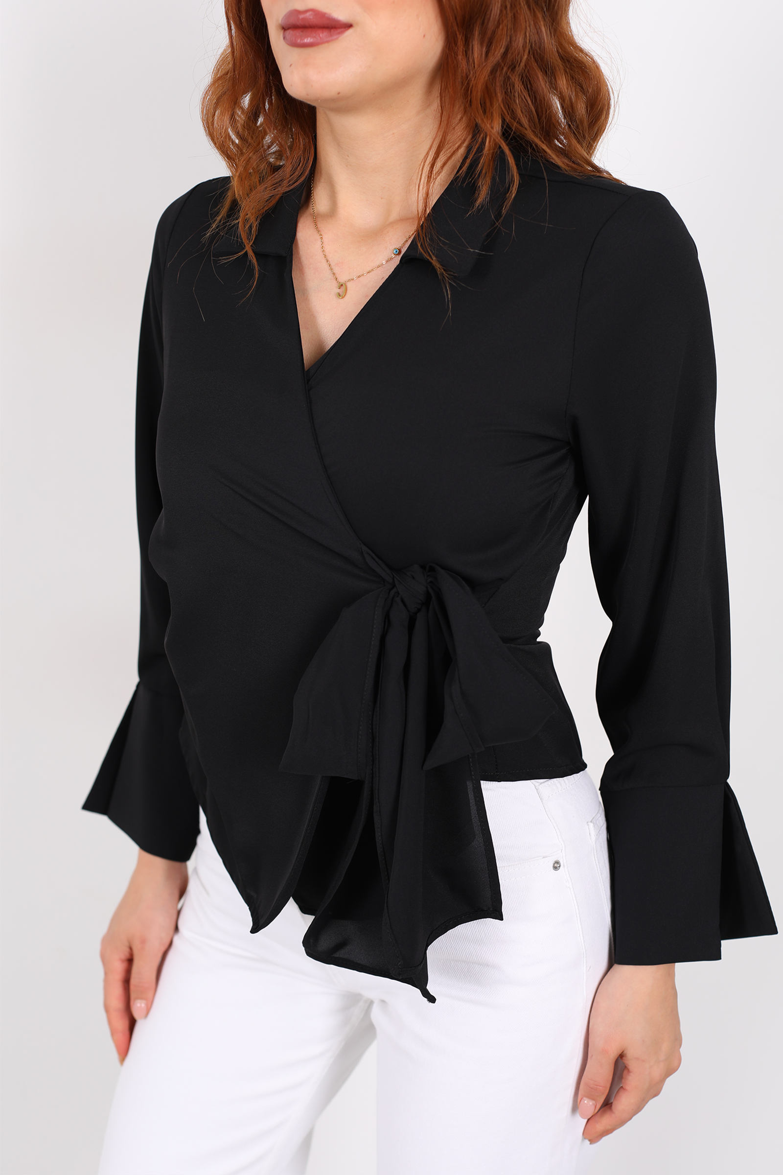 Sıcak bir gece şıklığını gündüz zarafetiyle buluşturan bu siyah saten gömlek, kruvaze bağlama detayıyla öne çıkıyor. Dökümlü saten kumaşı sayesinde ışığı adeta yakalayan bir parlaklığa sahip; vücudunuzda nazikçe akarken, bağlama detayıyla siluetinizi zarif bir şekilde vurgulamanıza yardımcı oluyor. Çok yönlü tasarımı sayesinde, hem özel davetlerde hem de iş ortamlarında rahatlıkla tercih edilebilir.
