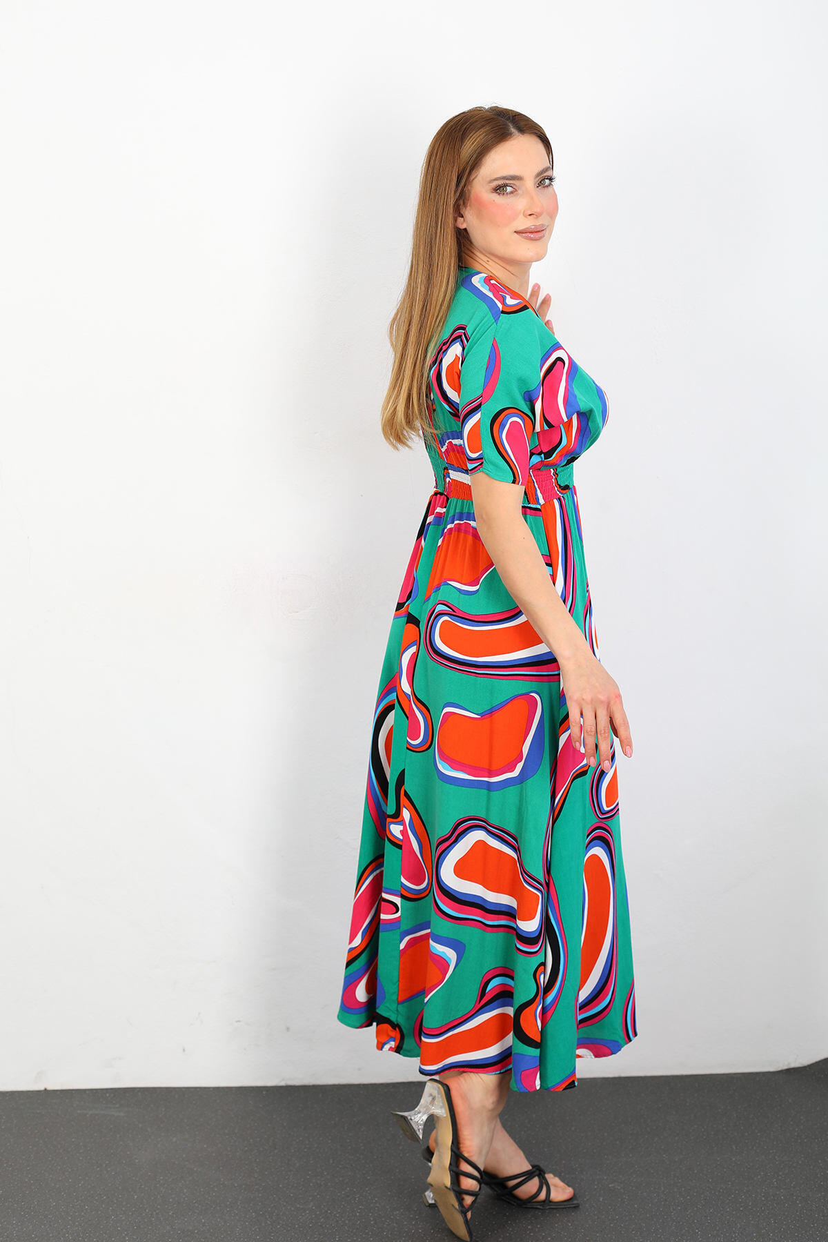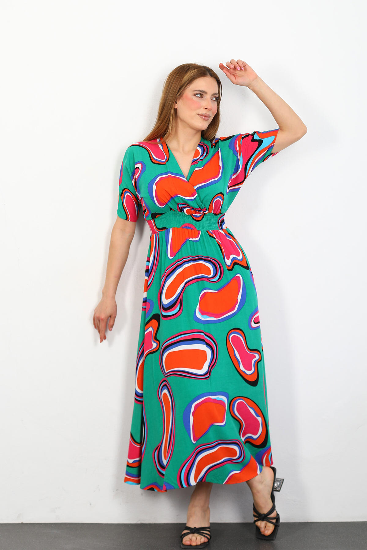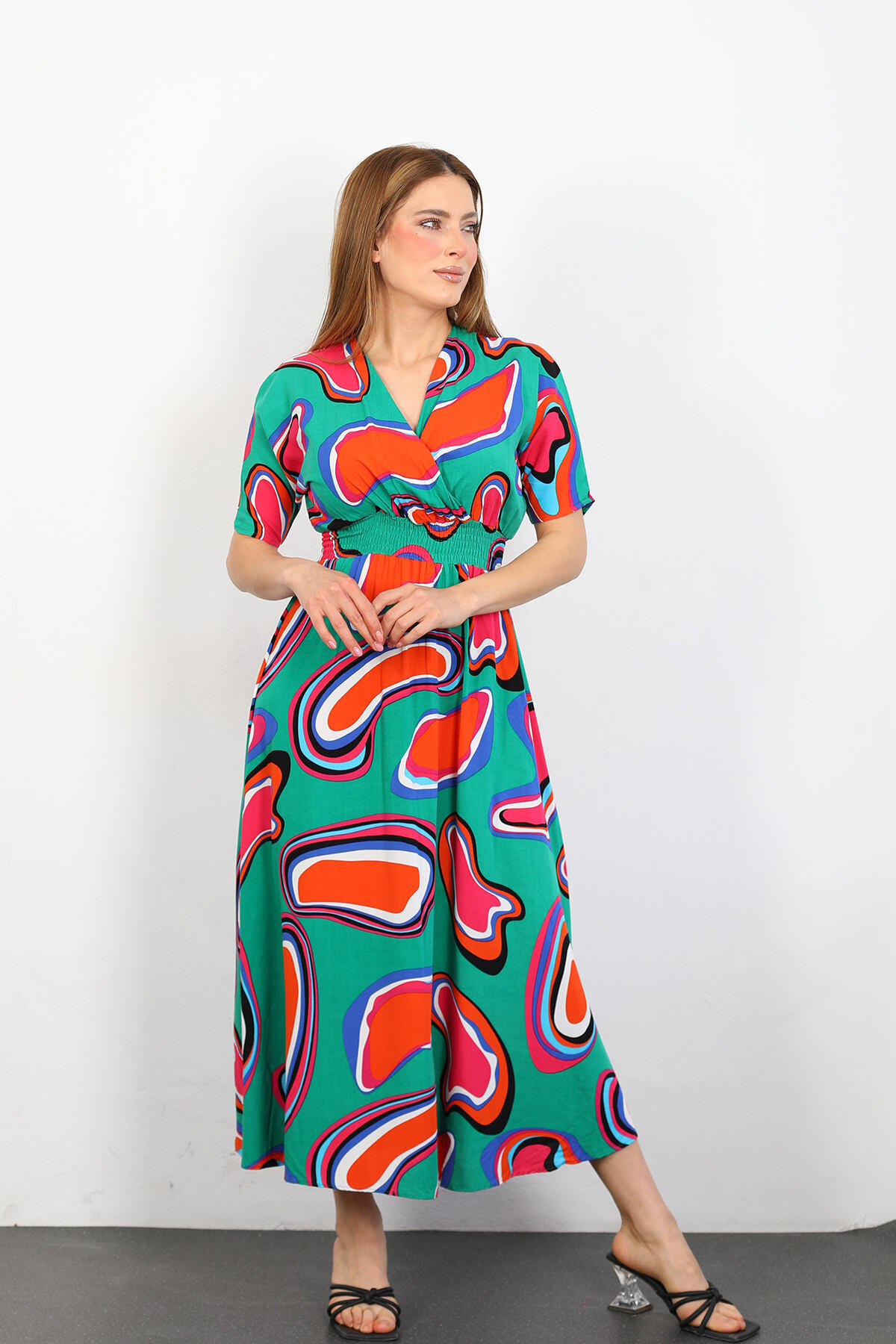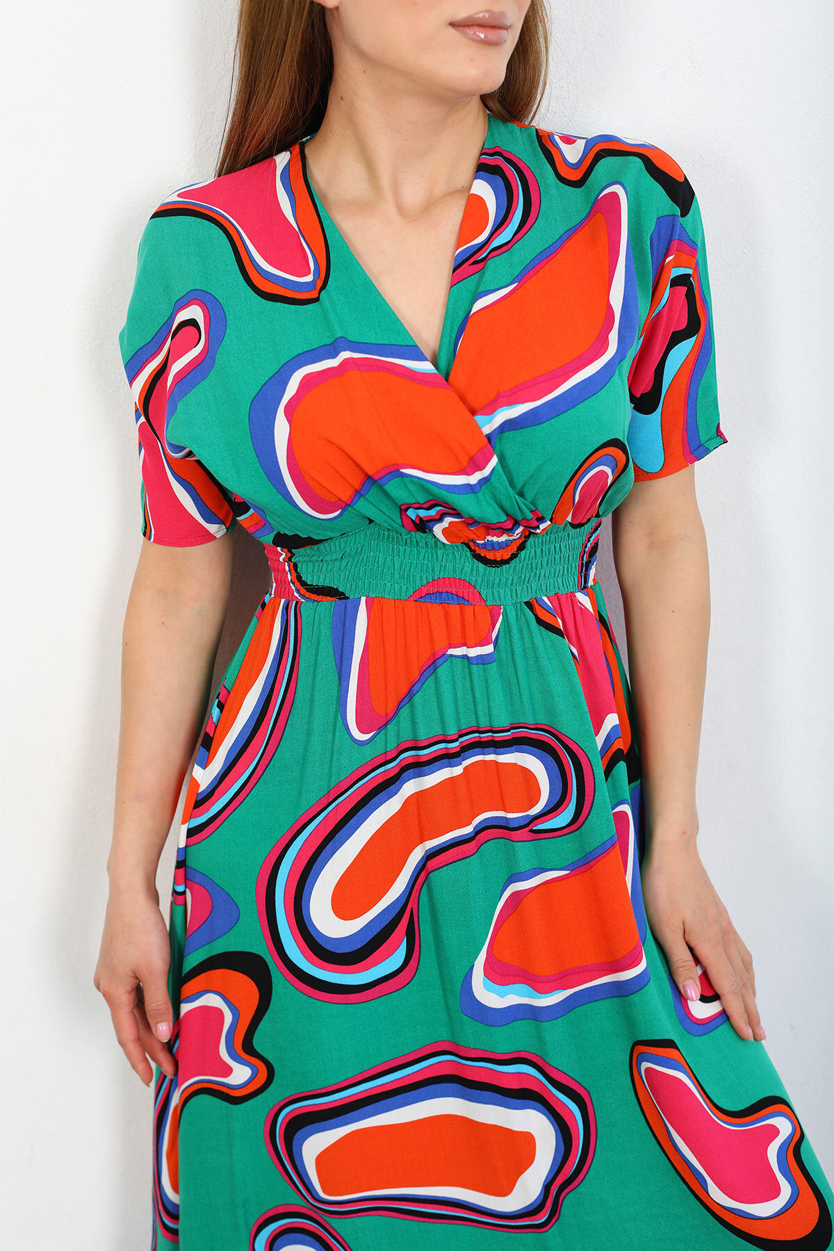Kruvaze Yaka Beli Gipeli Kadın Yeşil Desenli Viskon Elbise