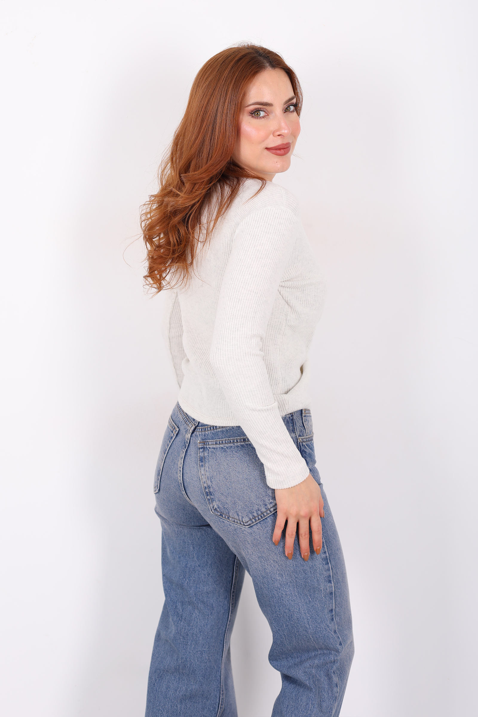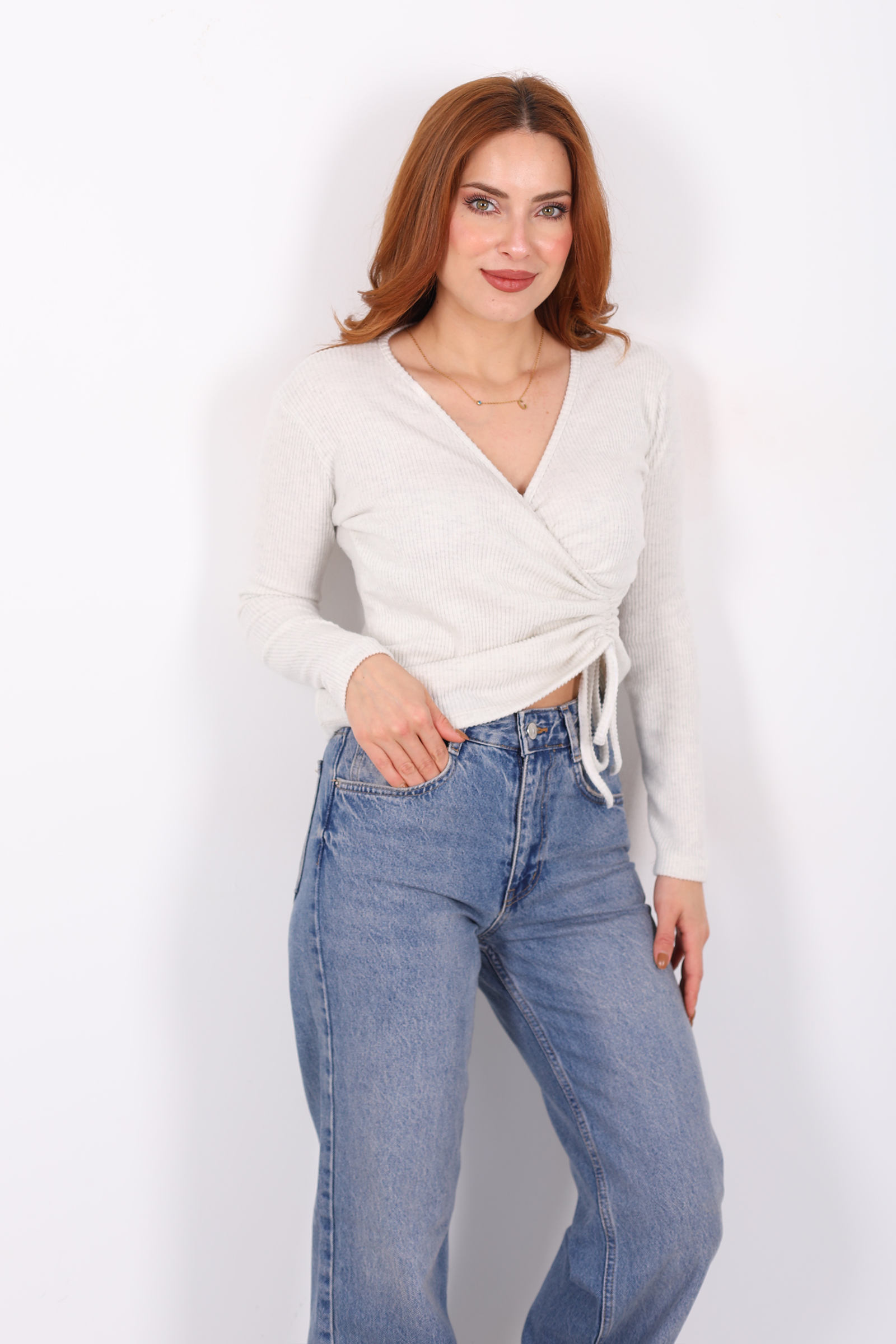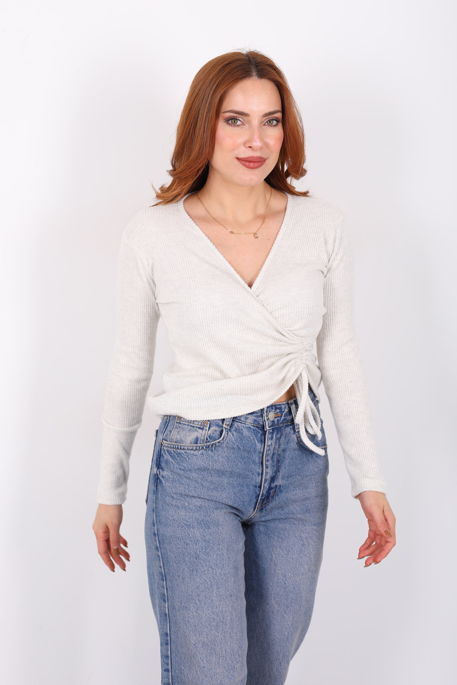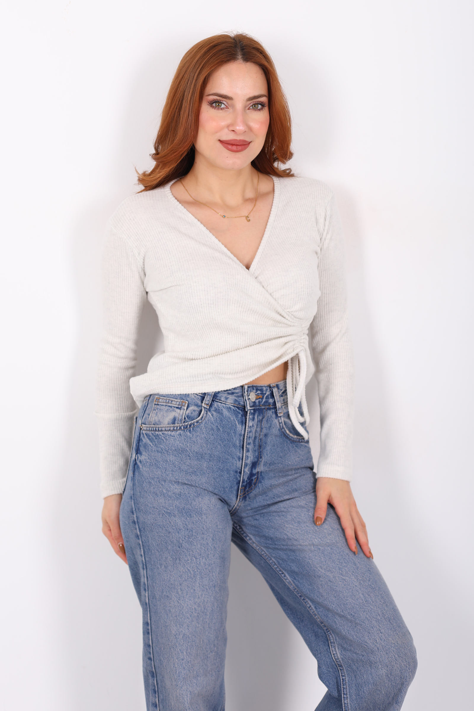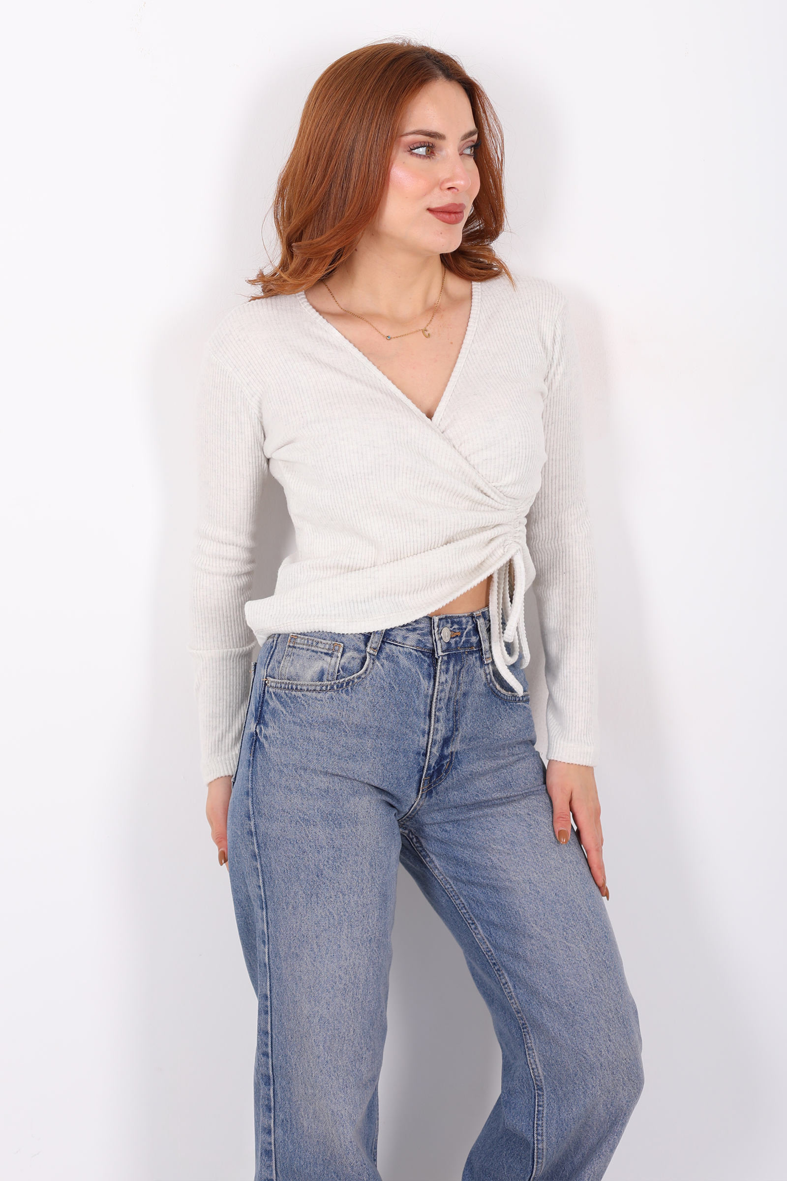 Kruvaze Yaka Büzgü Detaylı Yumoş Triko Ekru Kadın Bluz