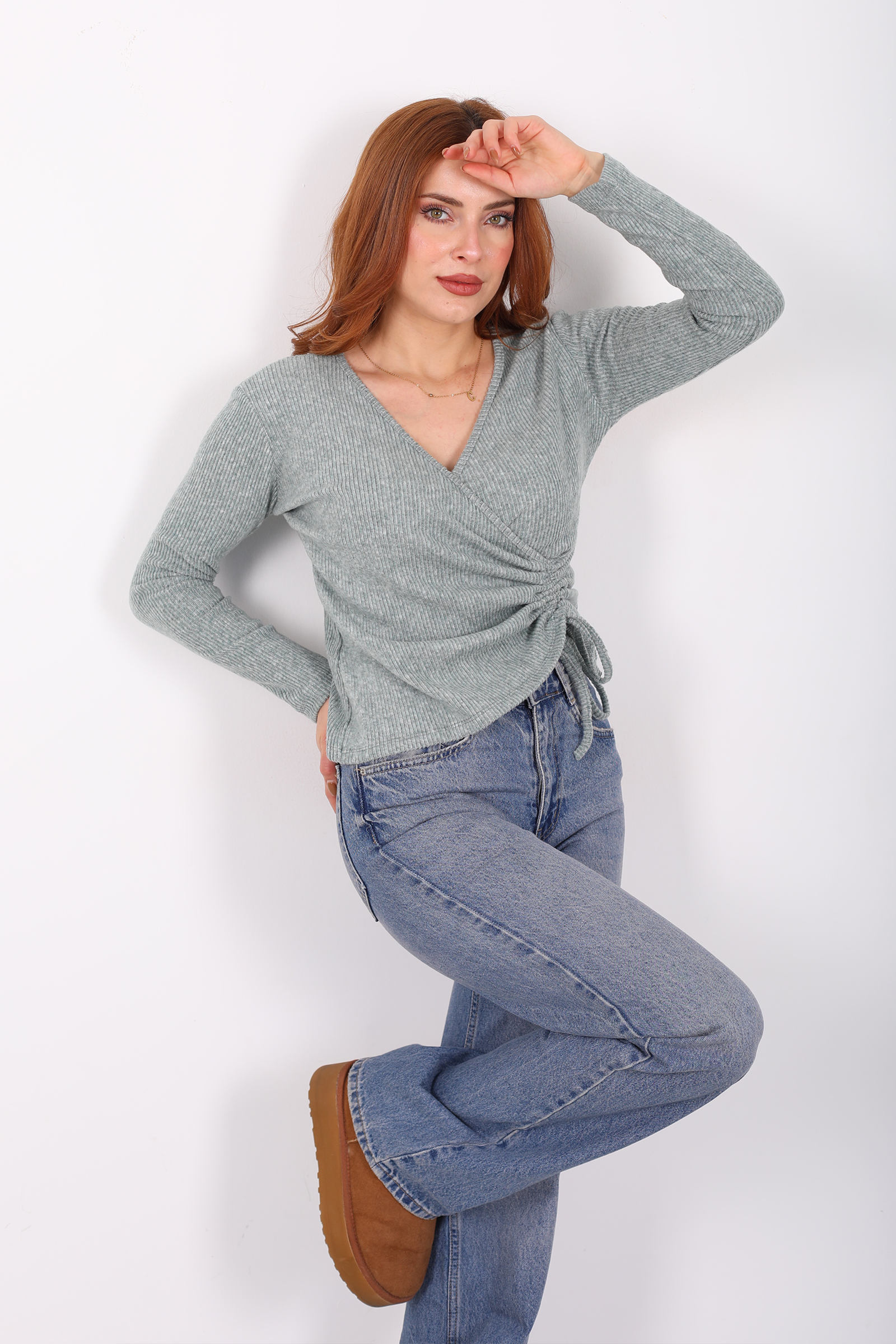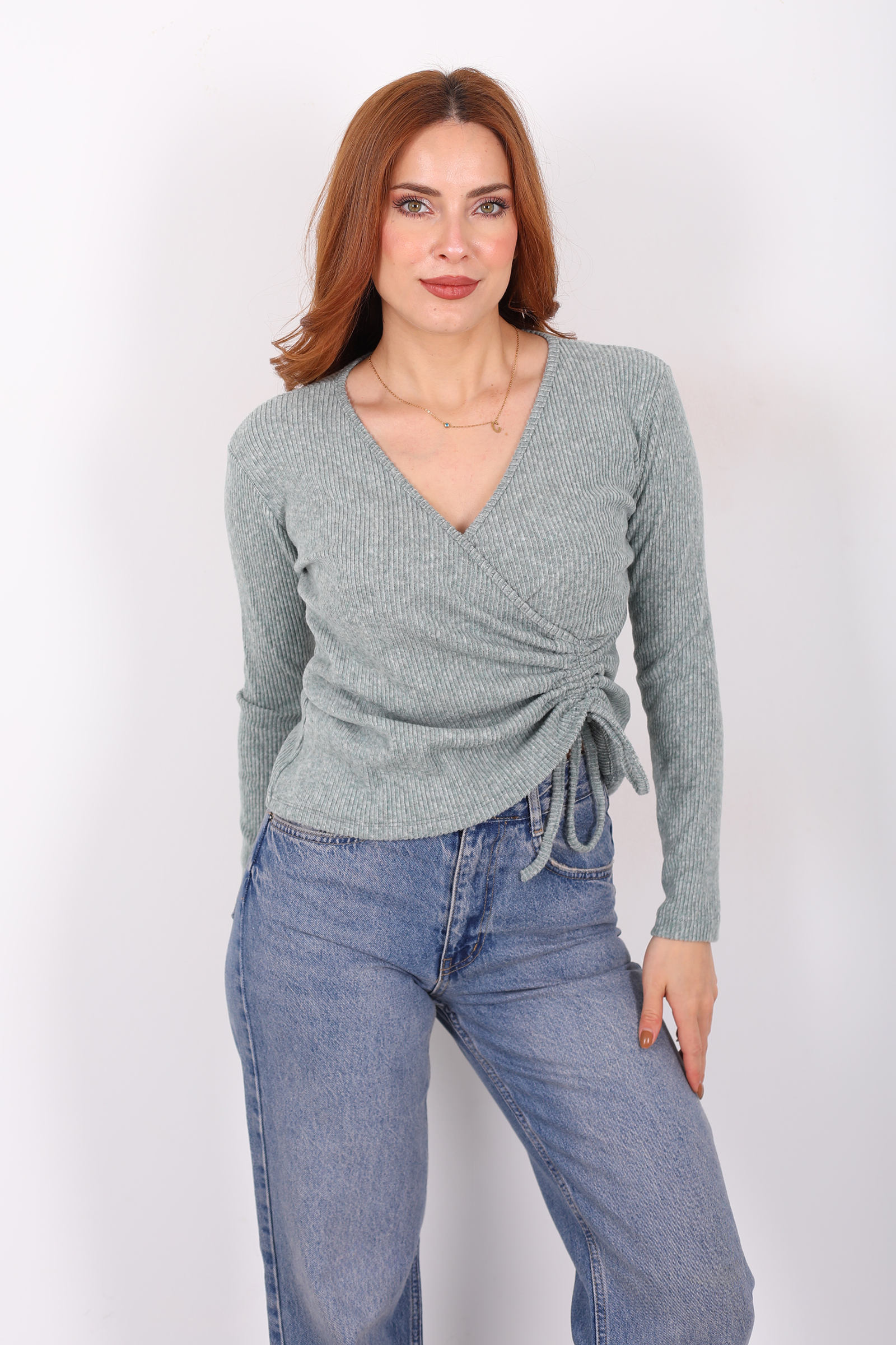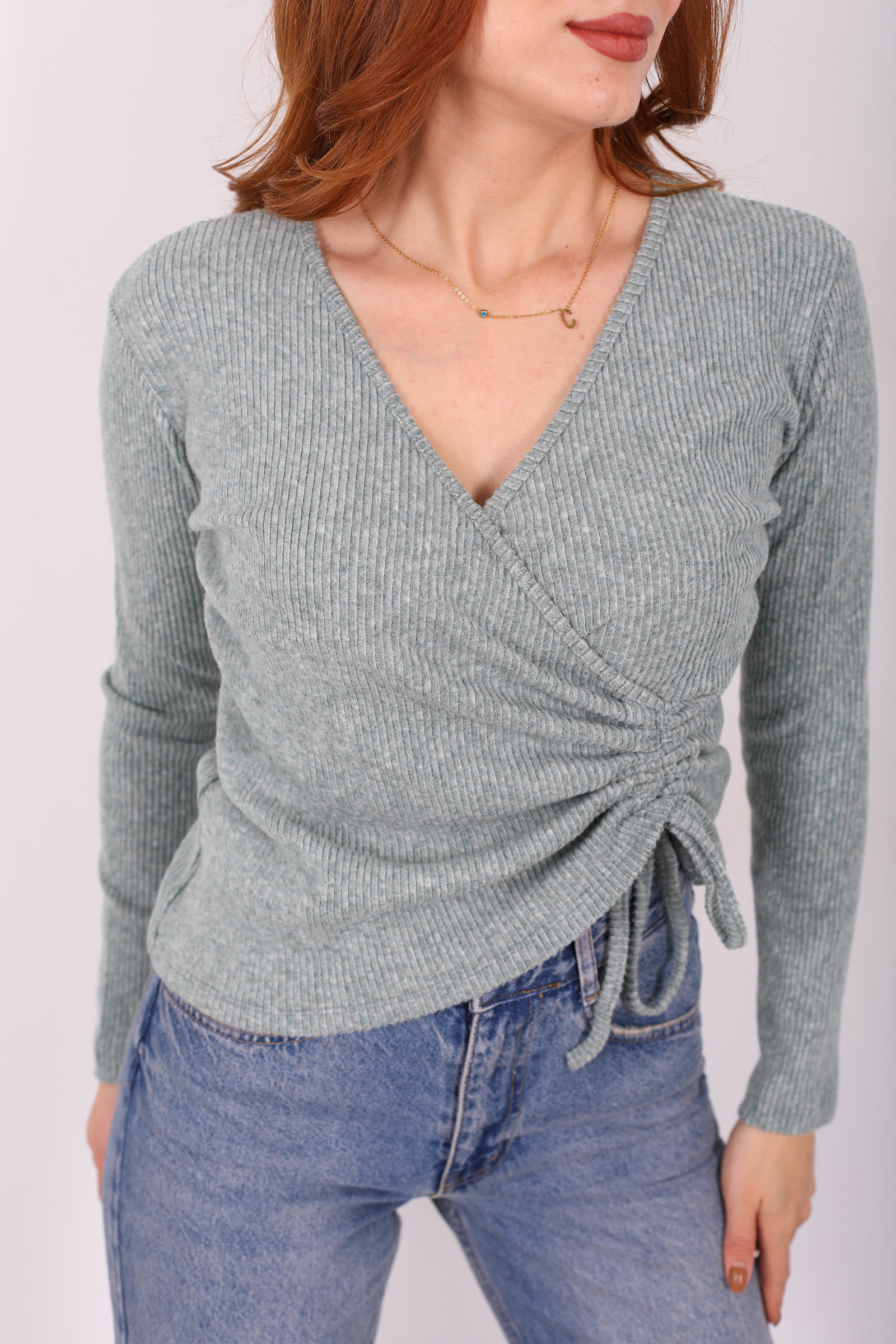 Kruvaze Yaka Büzgü Detaylı Yumoş Triko Haki Kadın Bluz