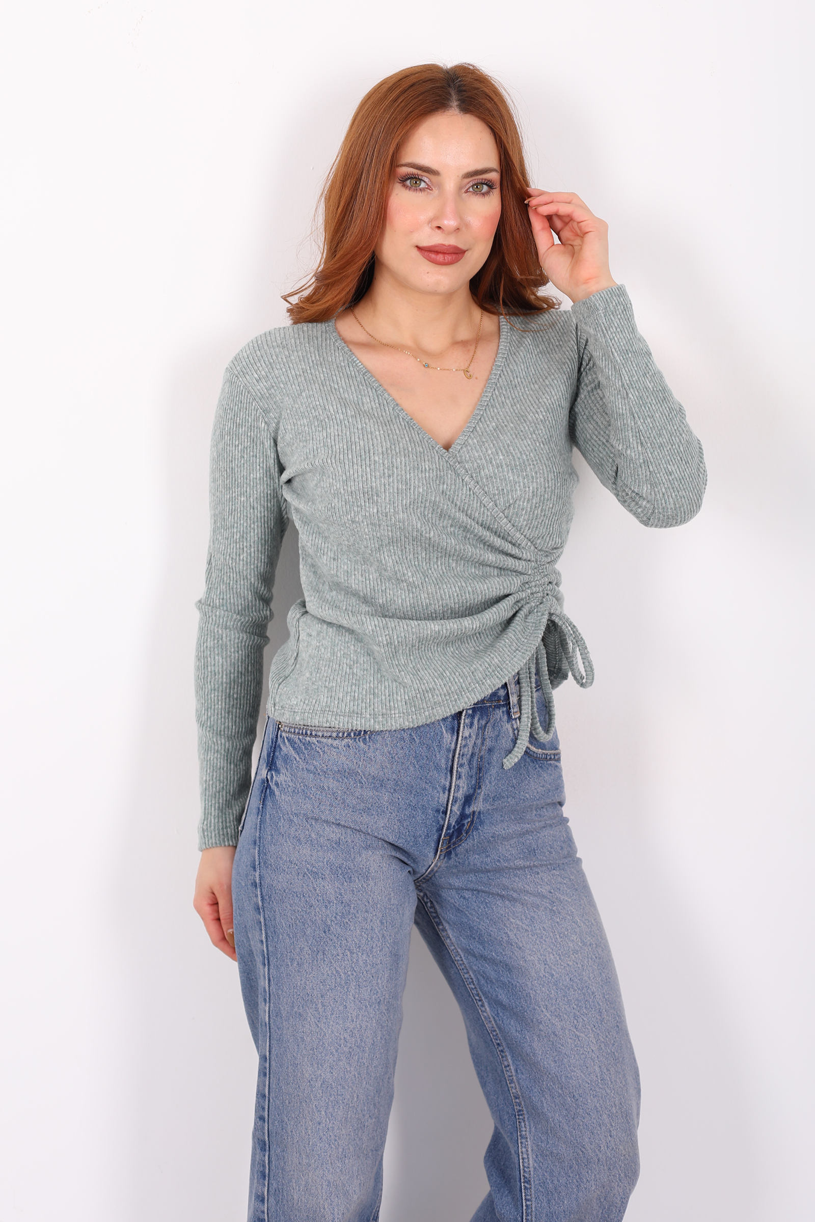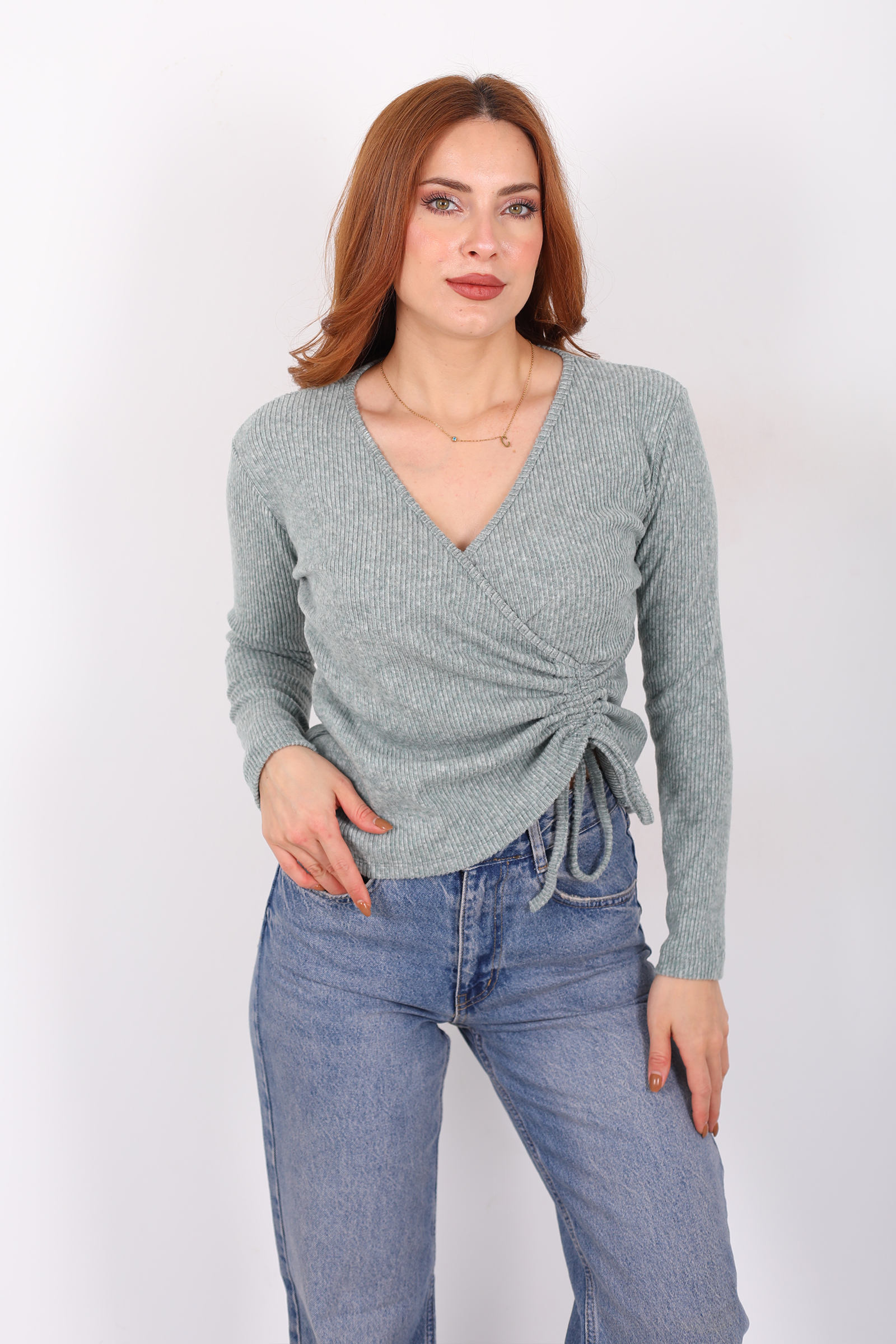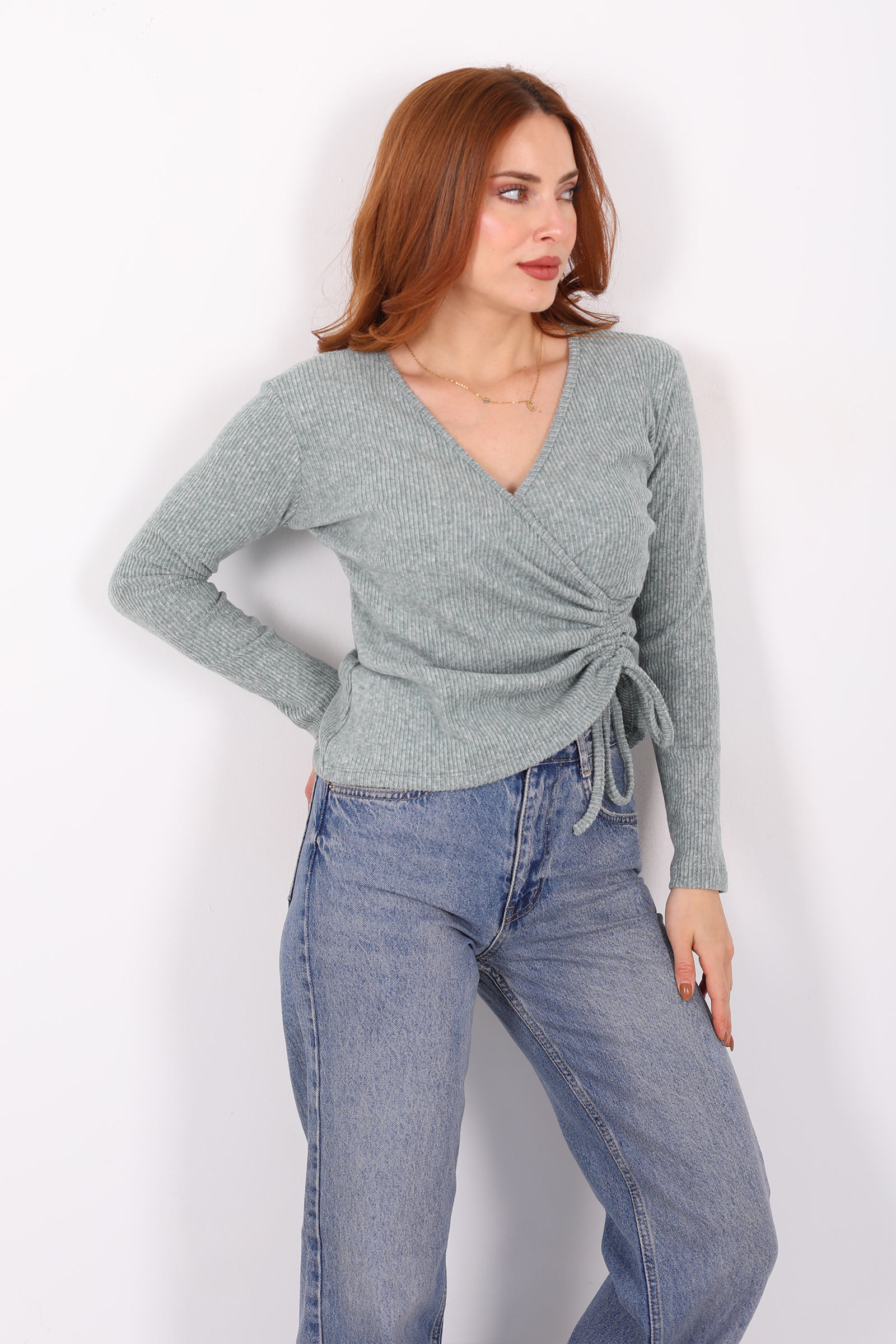 Kruvaze Yaka Büzgü Detaylı Yumoş Triko Haki Kadın Bluz