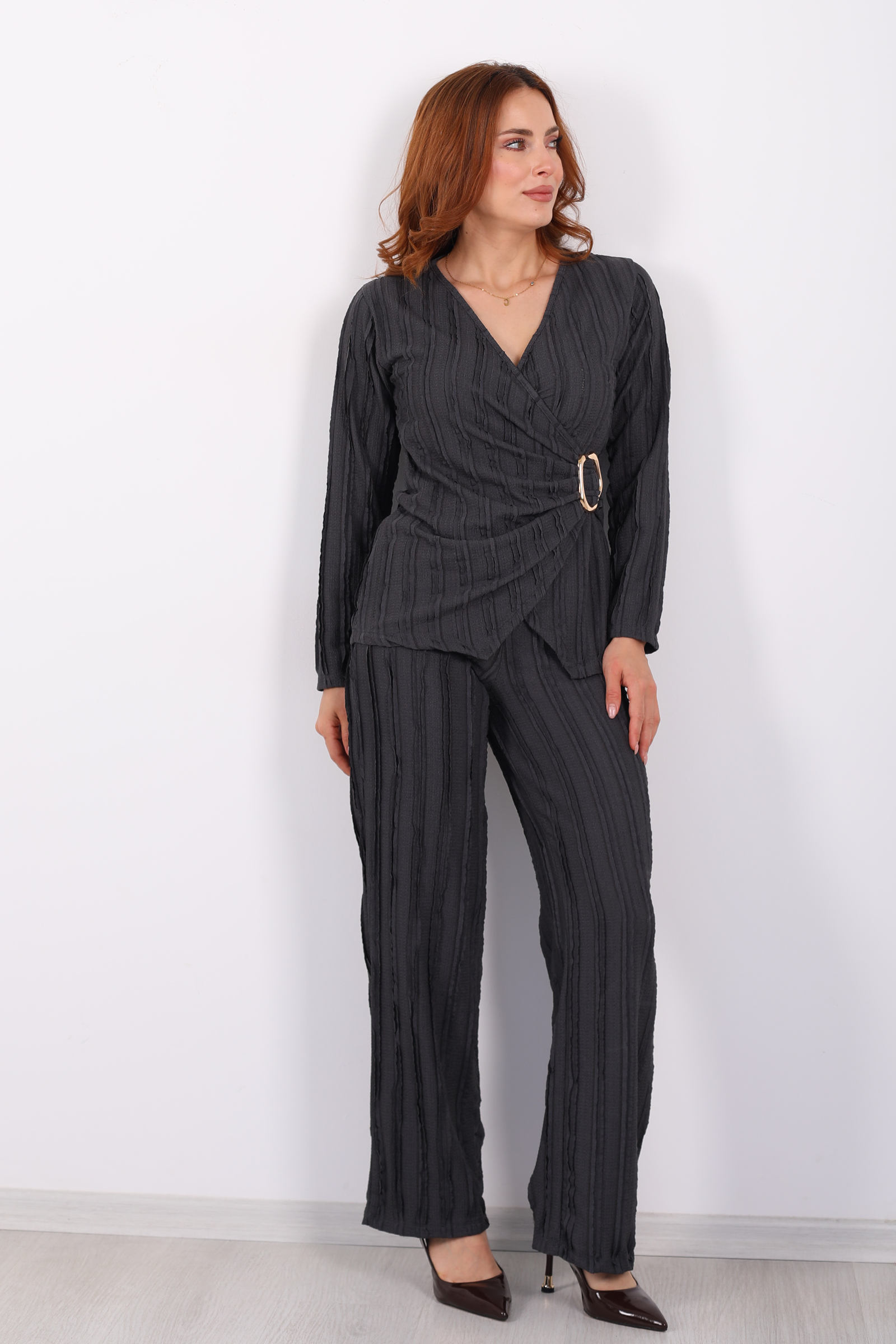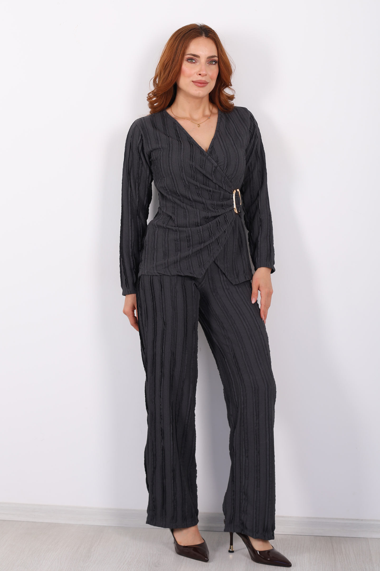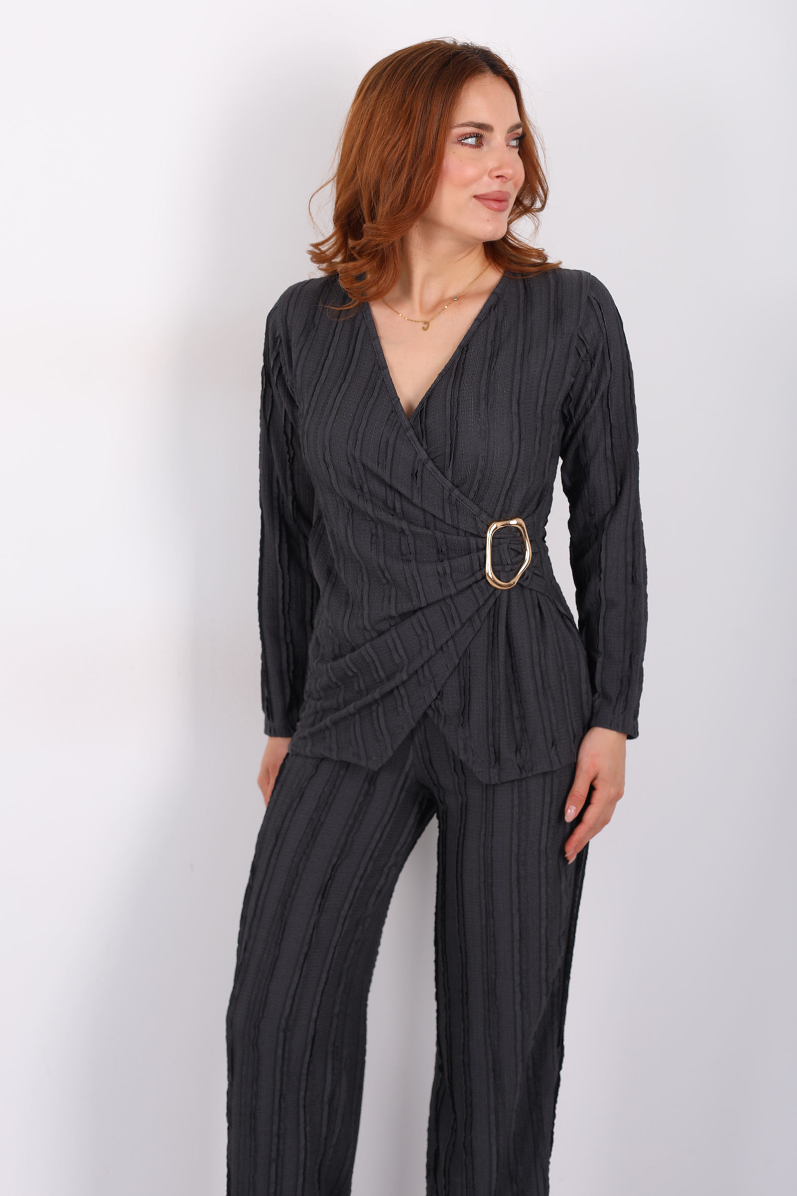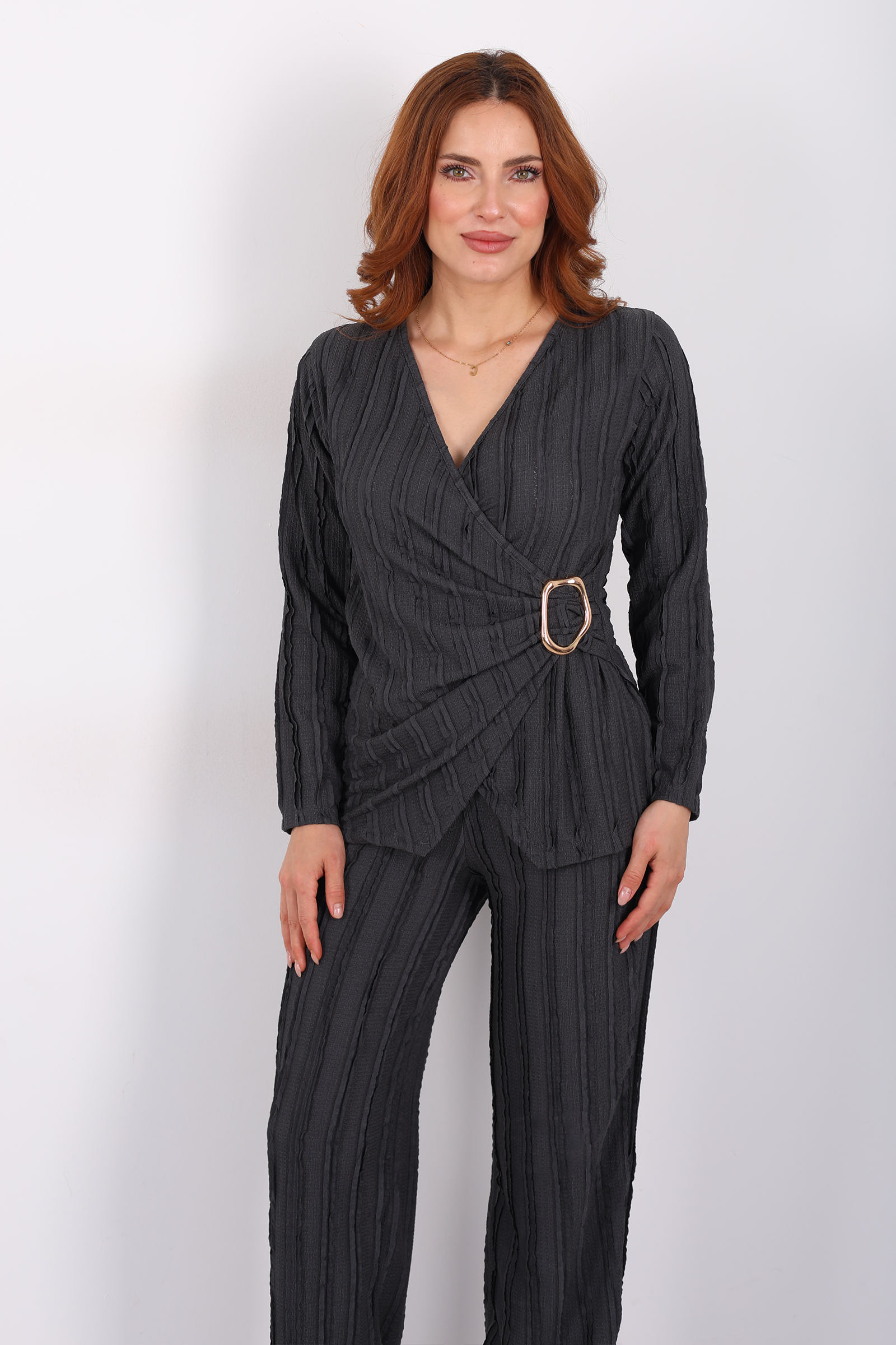Kruvaze Bağlamalı Antrasit Kadın Gömlek - Pantolon Takım
