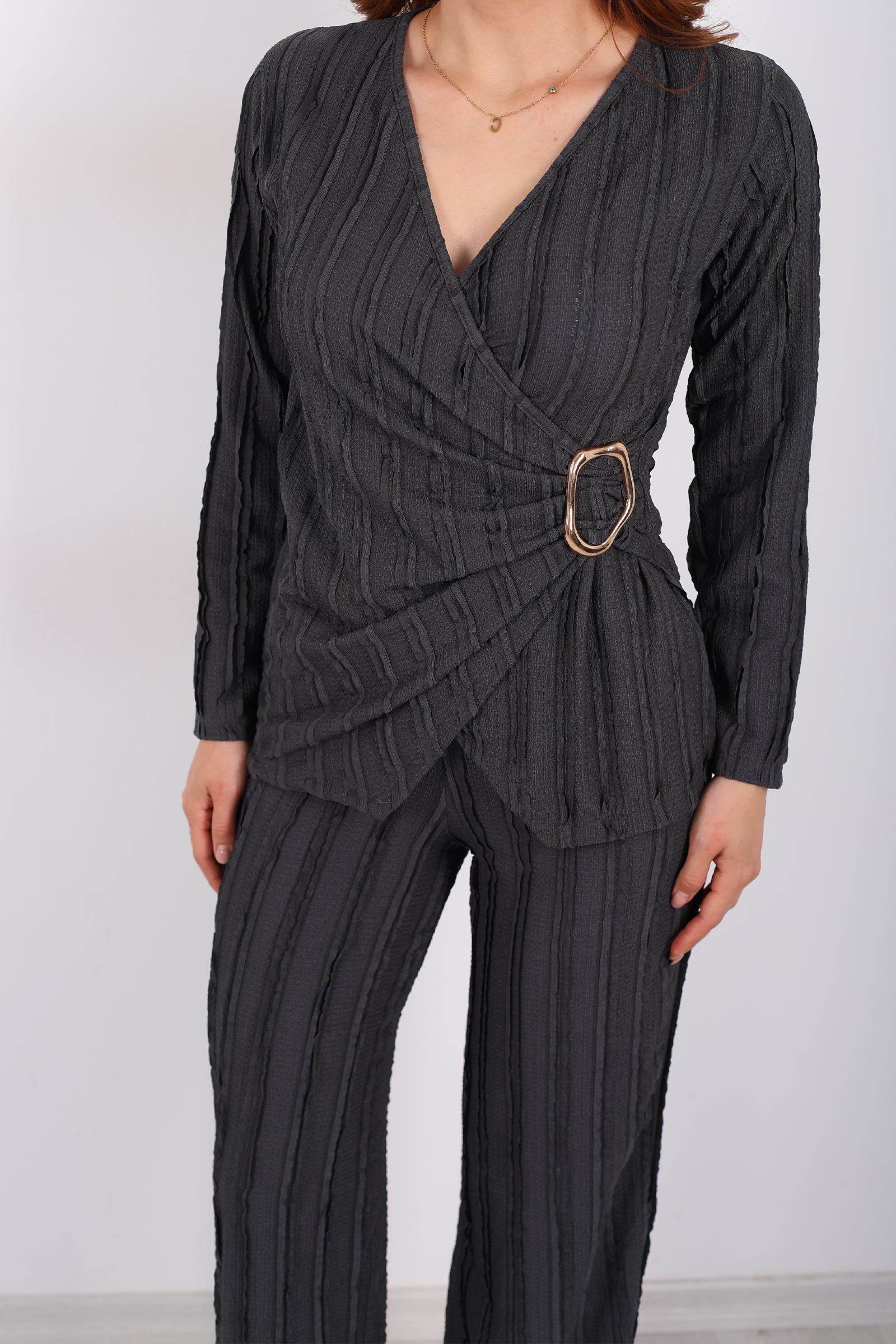 Kruvaze Yaka Fırfırlı Toka Detaylı Antrasit Kadın Takım