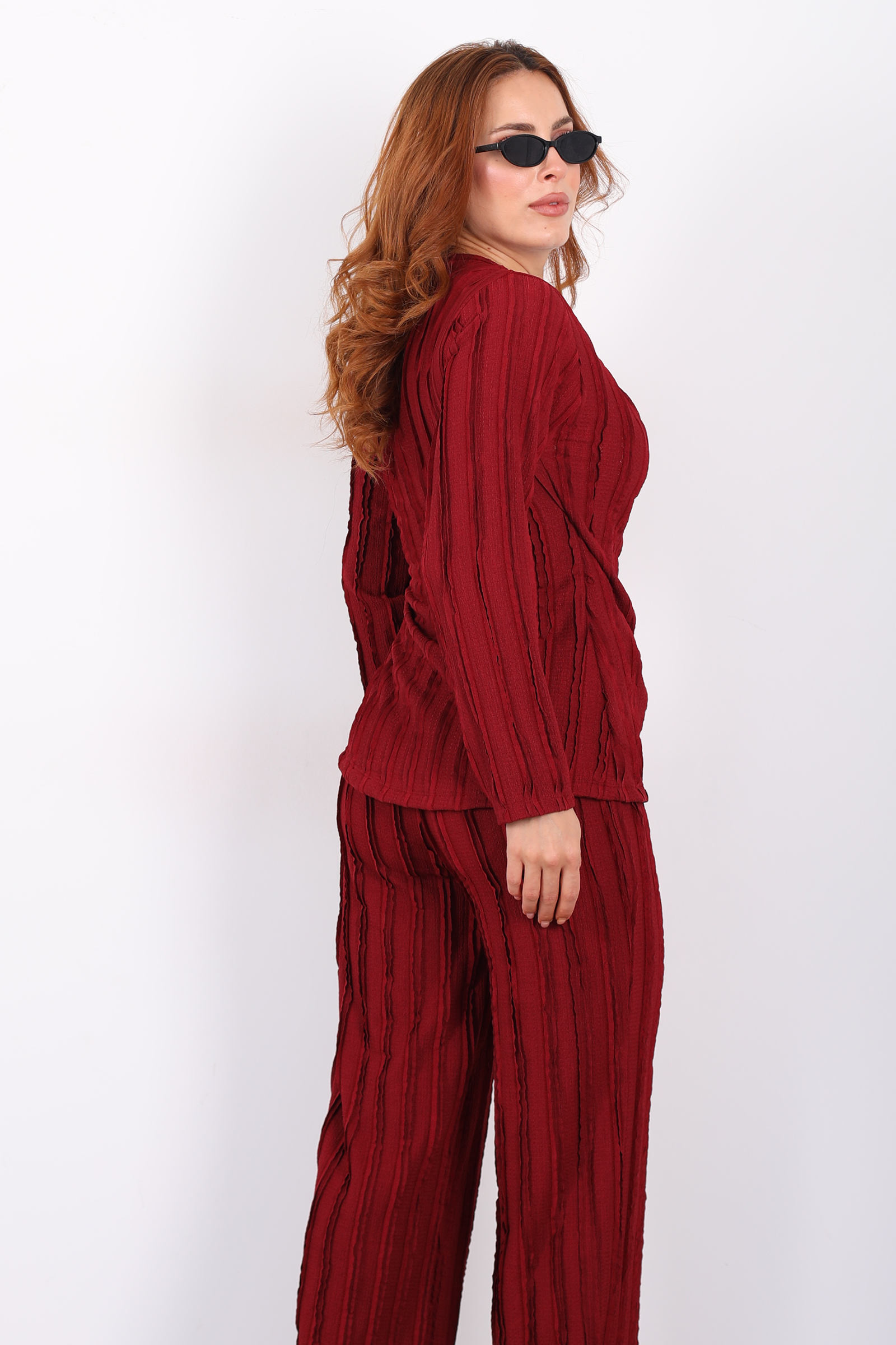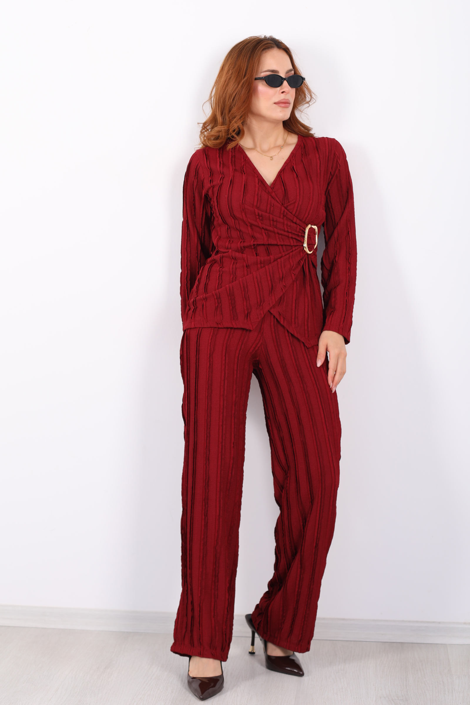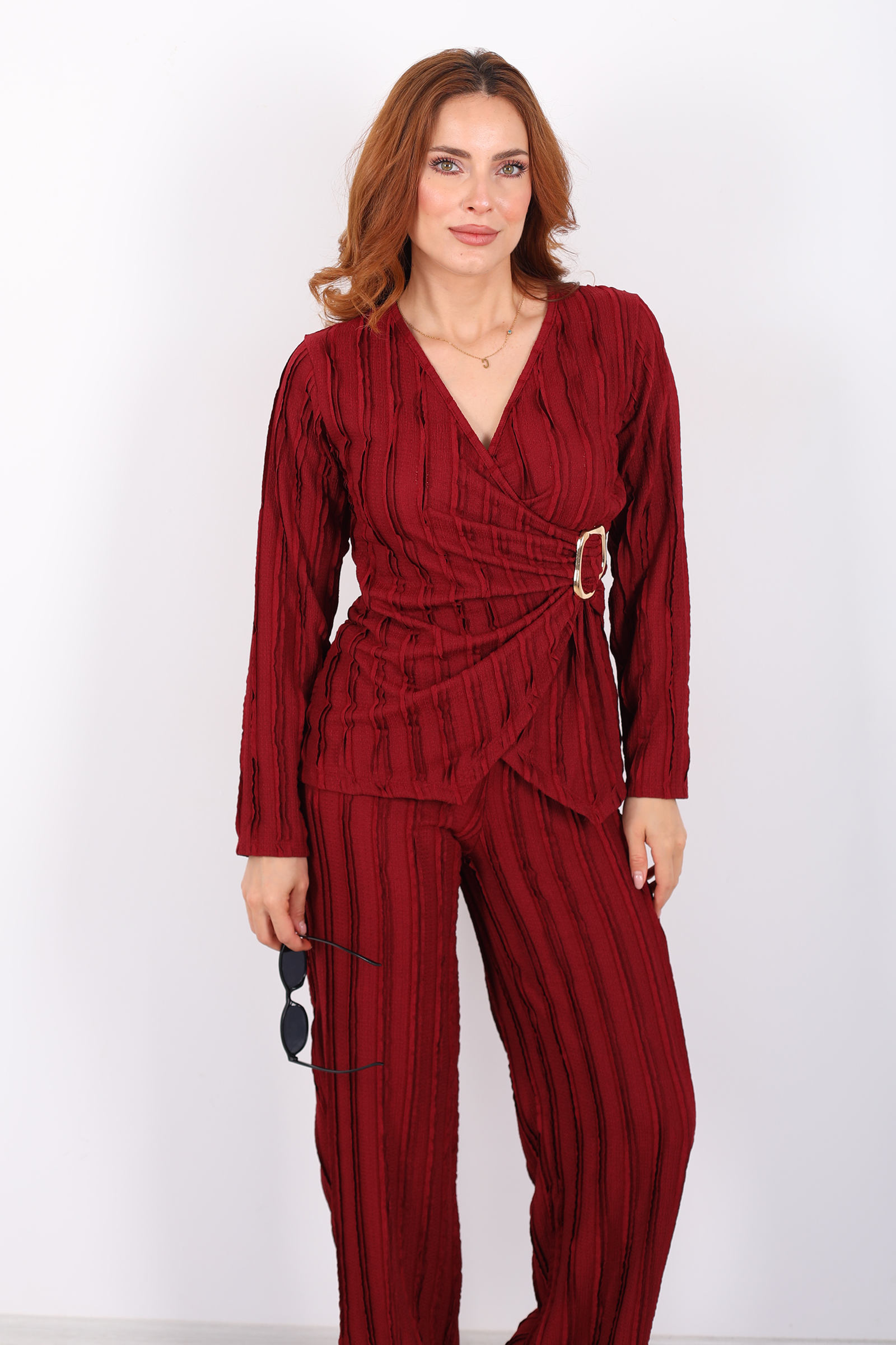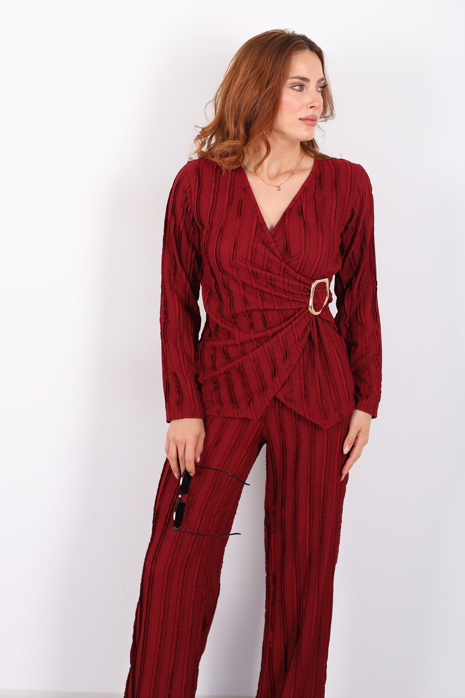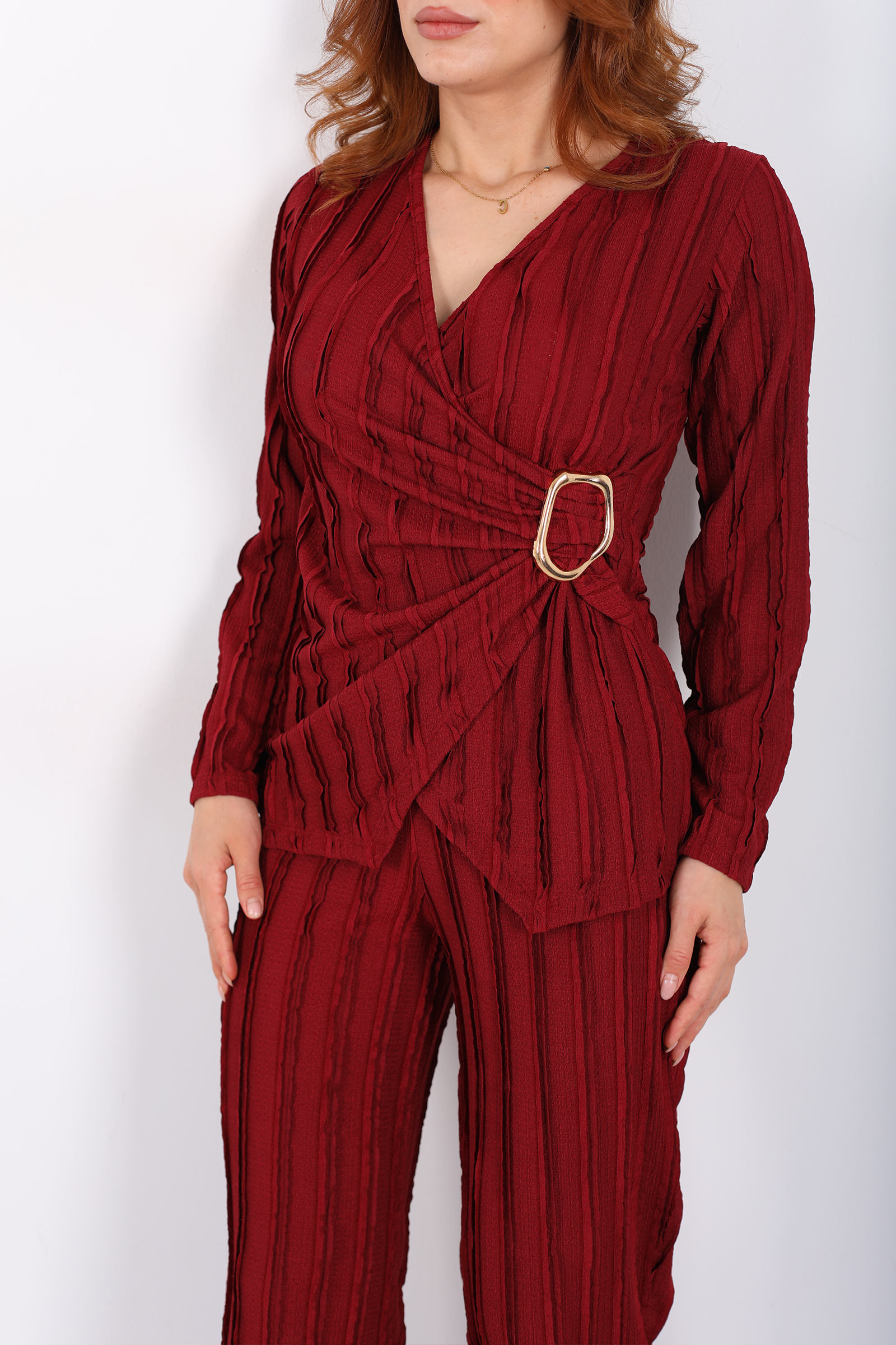 Kruvaze Yaka Fırfırlı Toka Detaylı Bordo Kadın Takım