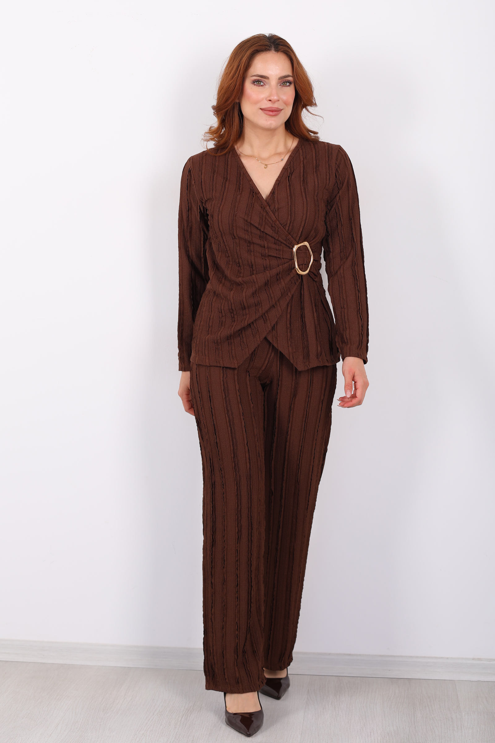 Kruvaze Yaka Fırfırlı Toka Detaylı Kahverengi Kadın Takım