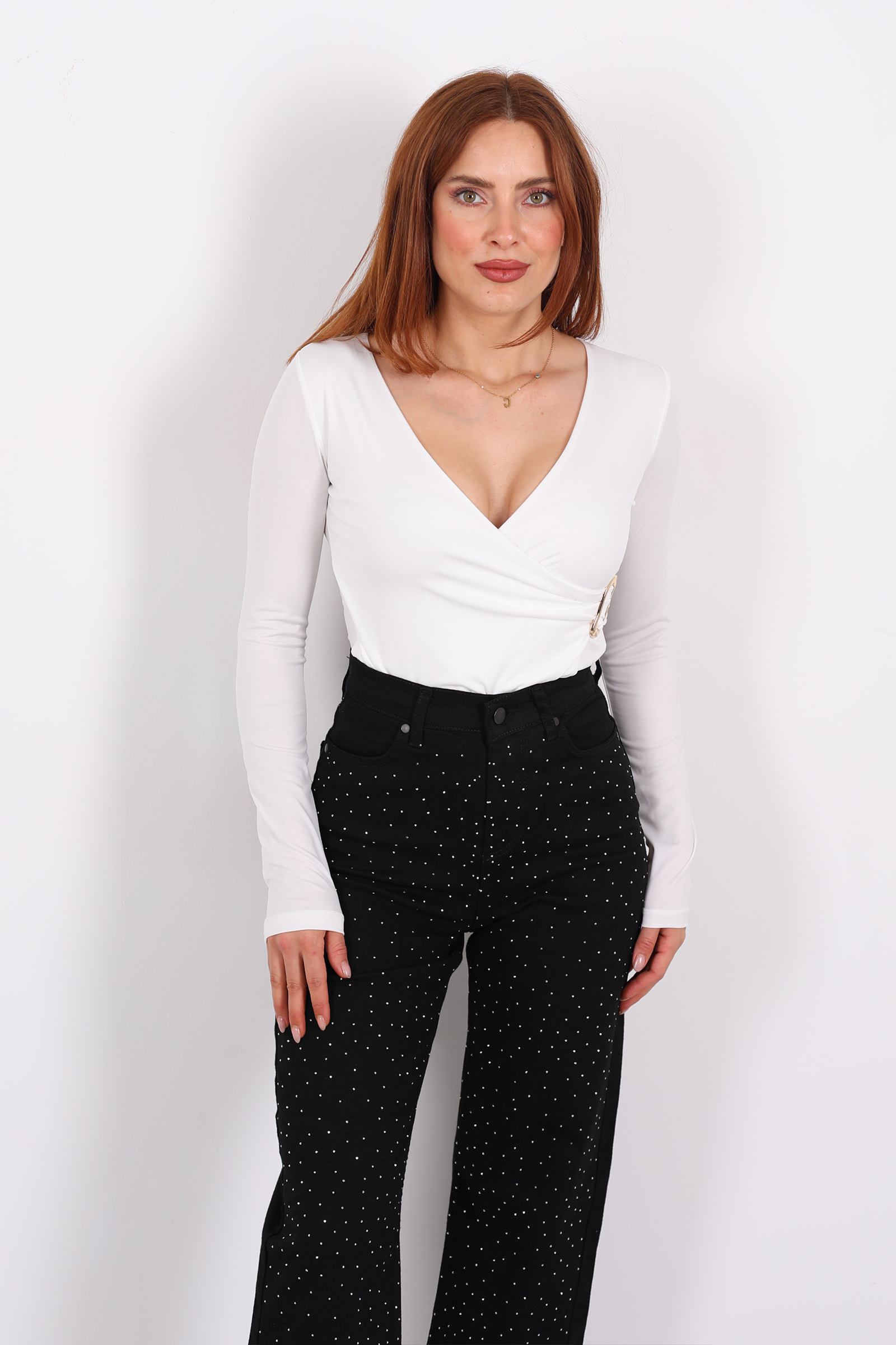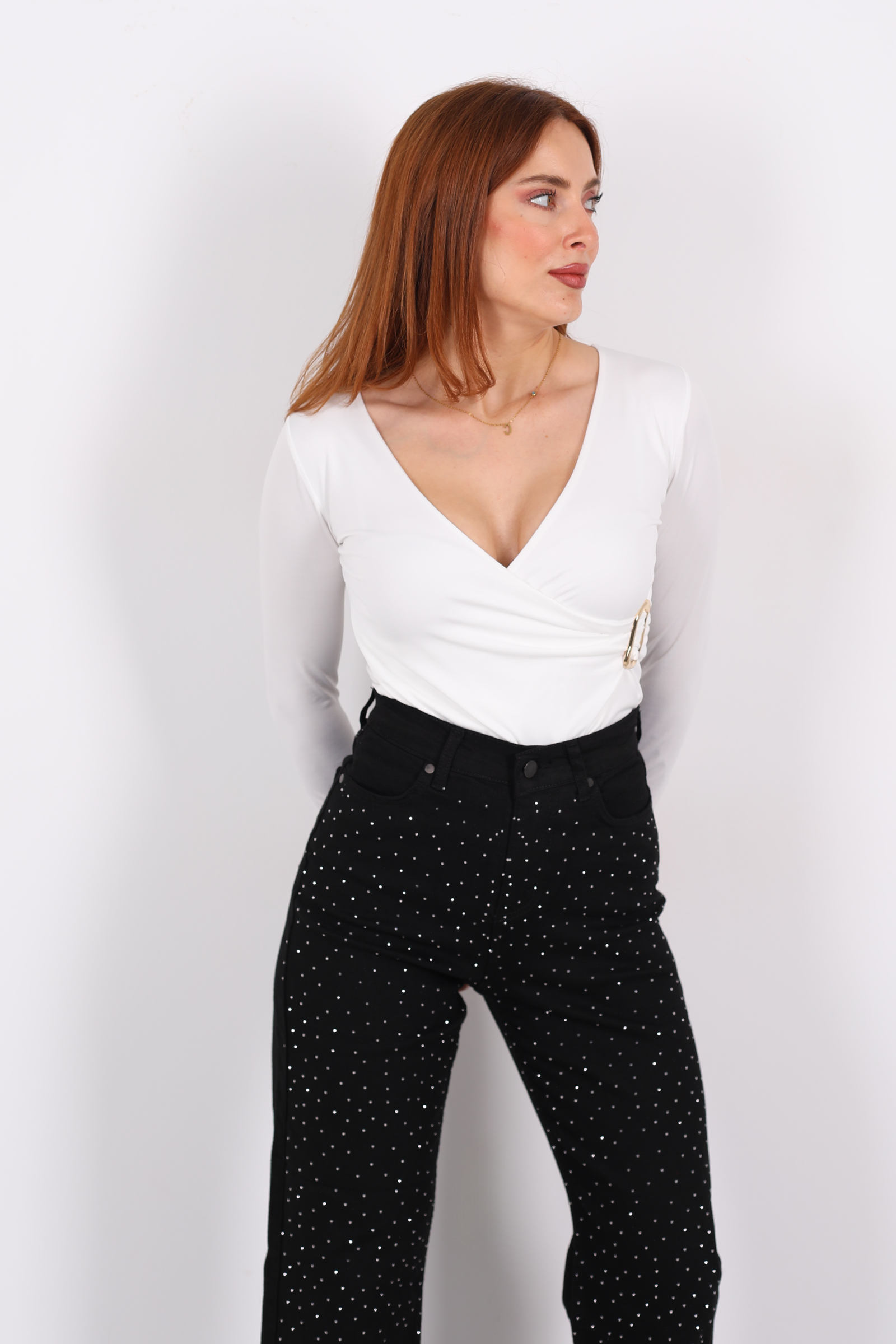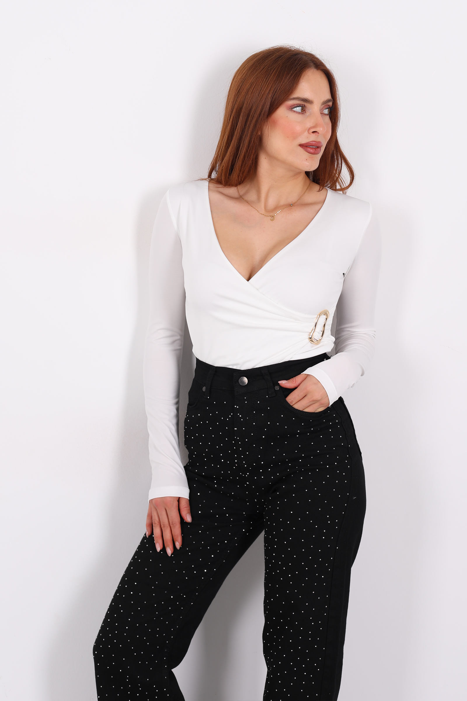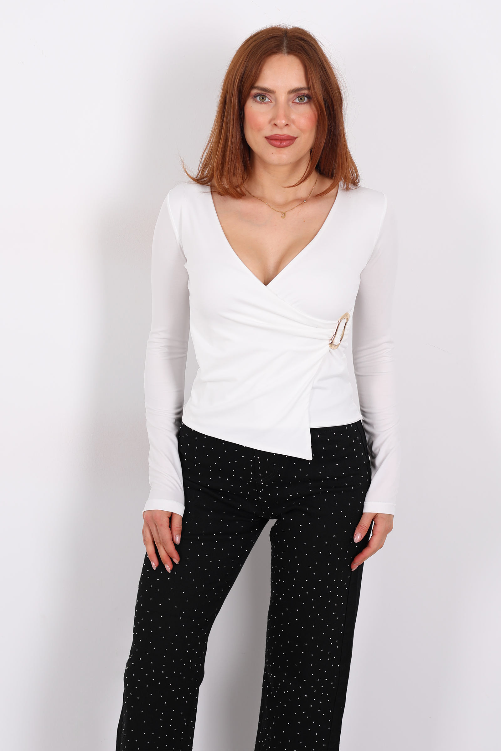 Bu Kruvaze Yaka Gold Aksesuarlı Beyaz Kadın Bluz, hem zarafeti hem de sofistike bir dokunuşu yansıtıyor. Kruvaze yaka, V biçiminde kapanarak boyun hattını zarif şekilde vurgularken, altın tonlu düğme ve aksesuar detayları bluzun görünümüne bir lüks ve parlaklık katıyor.Beyaz temel rengi sayesinde farklı kombinlerde çok yönlü şekilde kullanılabilir: siyah kalem etekle ofis şıklığı yakalayabilir, açık renkli jean ile gündüz şehir stilini tamamlayabilir ya da geniş paça pantolon ve zarif sandaletlerle yaz akşamı için havalı bir görünüm oluşturabilirsin.