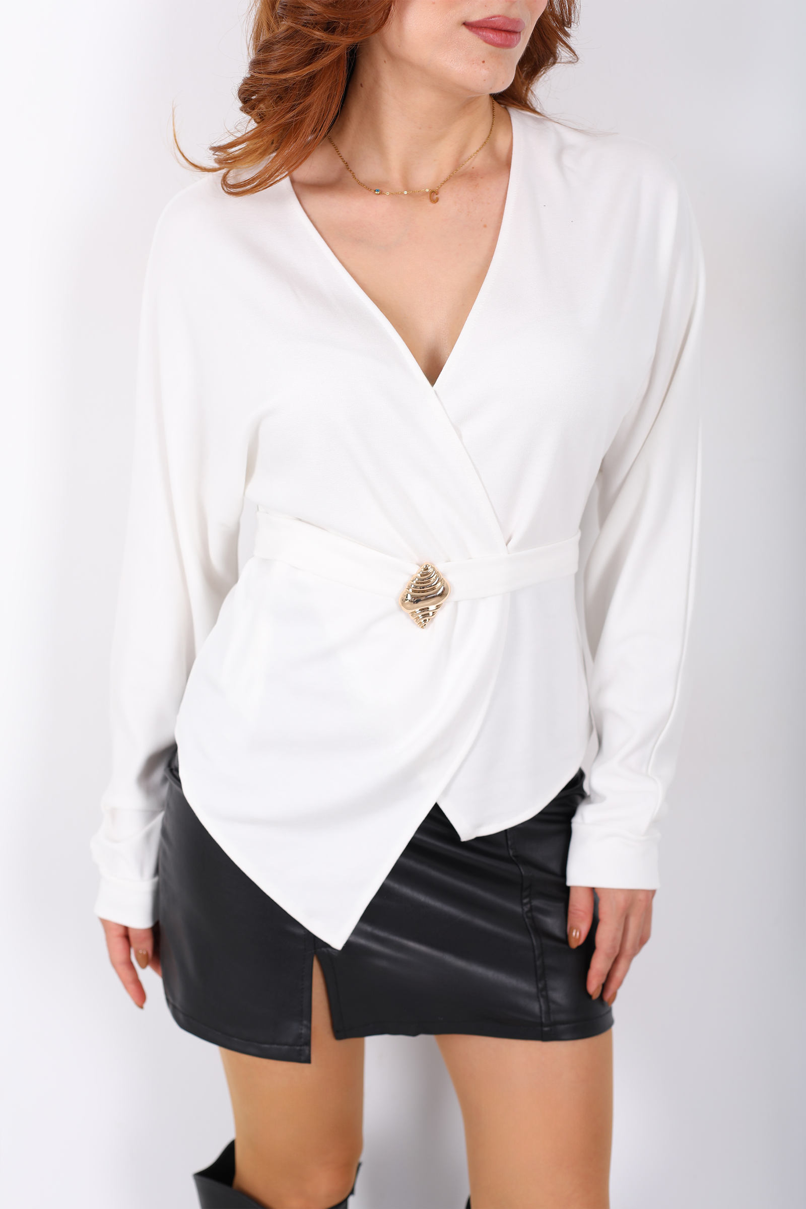 Kruvaze Yaka Kemer Aksesuarlı Beyaz Kadın Bluz